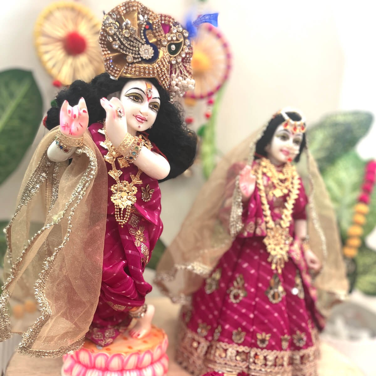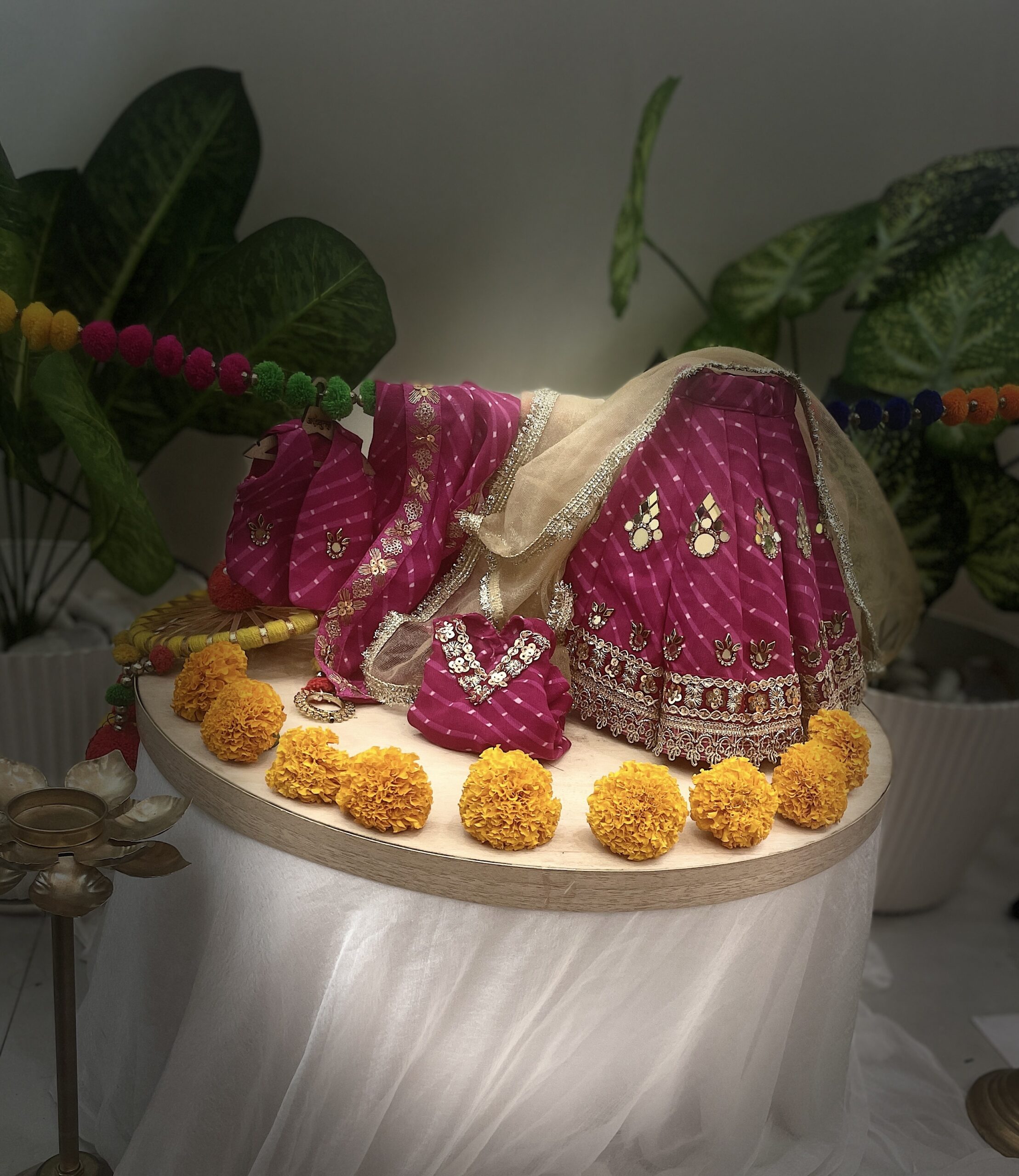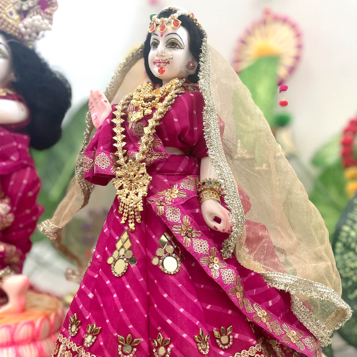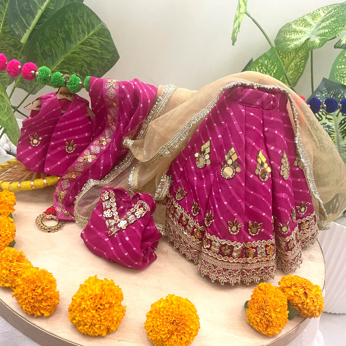 Dress your Radha Krishna in this beautifully crafted Pink Lehariya Print Poshak Set. Radha Ji’s outfit features a graceful lehenga with delicate mirror stone work and lace detailing, paired with a matching blouse and flowing dupatta. Krishna Ji’s ensemble includes a classic achkan, traditional dhoti, and a dupatta, all in the same cheerful pink lehariya print with cream color net dupatta.