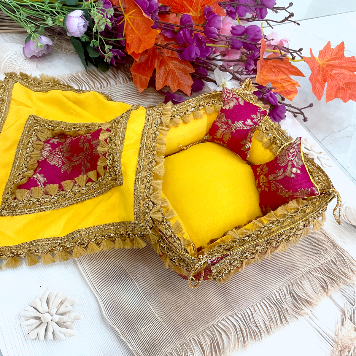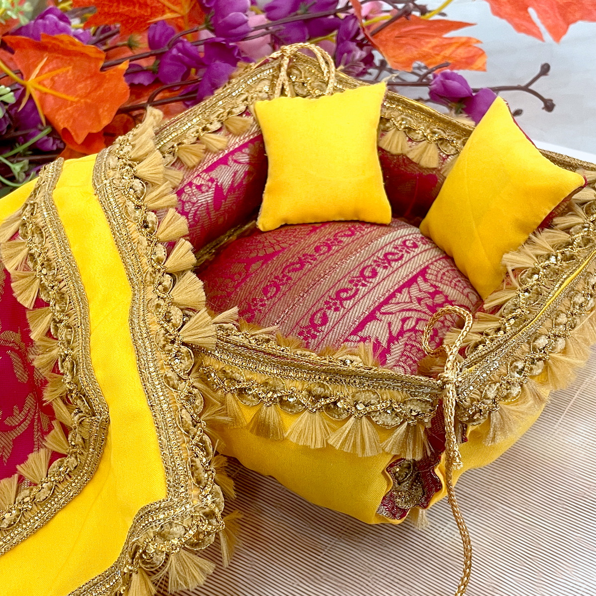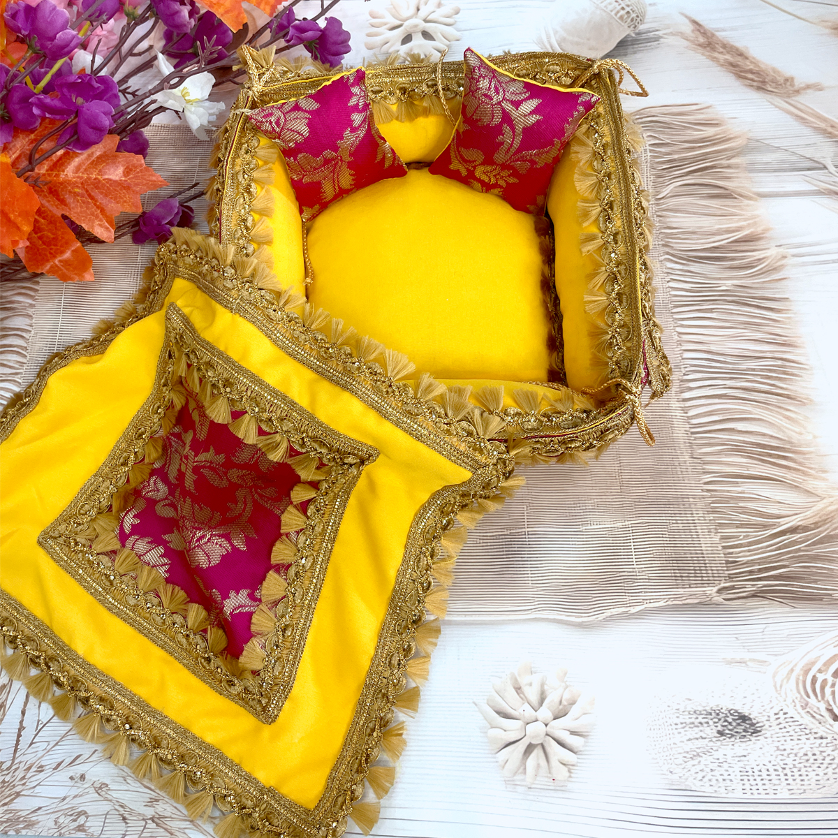 Experience convenience, beauty, and divine elegance with this Reversible Pink–Yellow Royal Bed Cum Singhasan Set, specially crafted to enhance your Thakurji’s daily shringar.