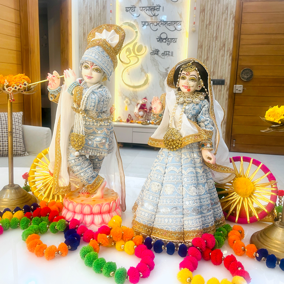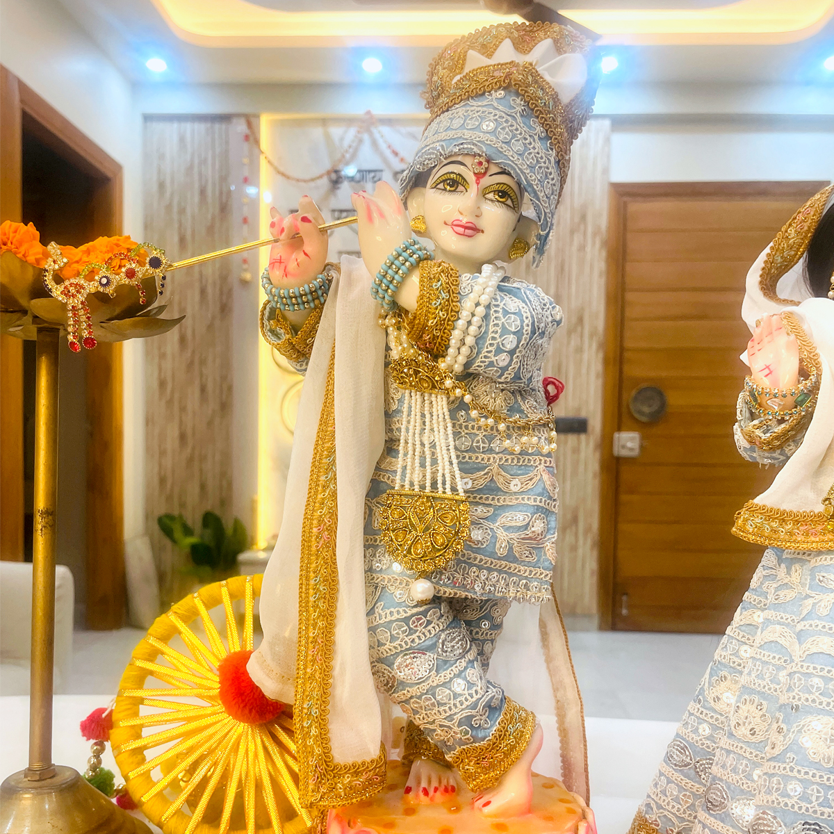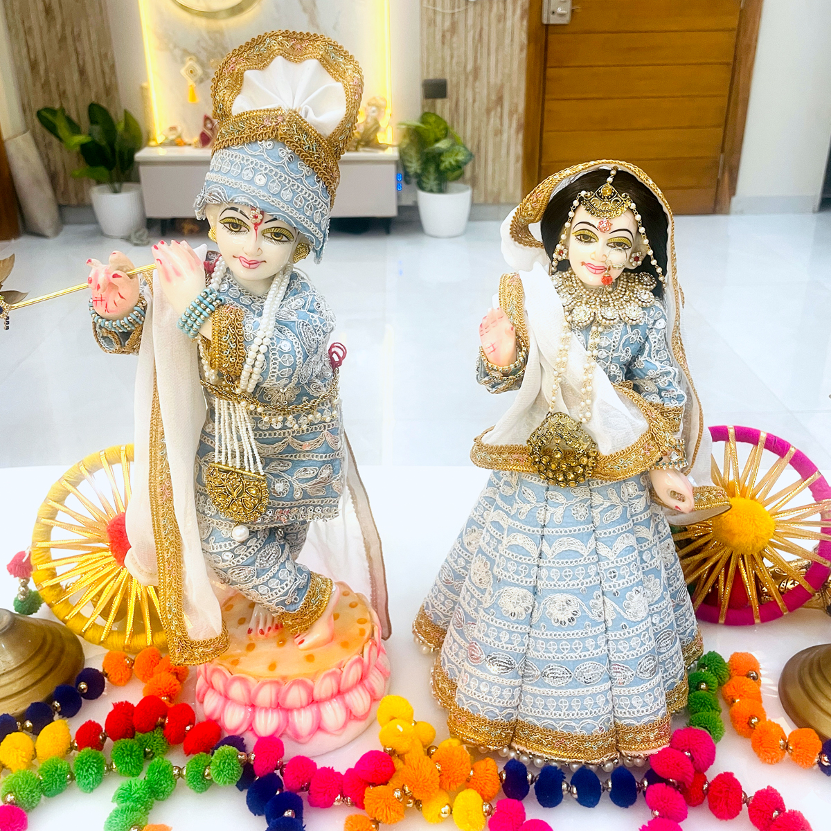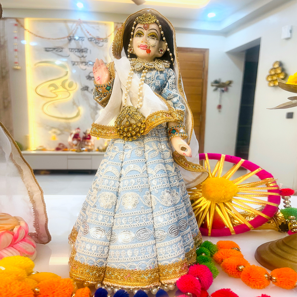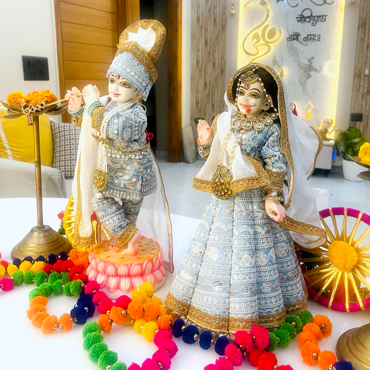 Transform your deity’s look with this premium pastel blue clothing set. Handcrafted with precision, this matching dress set features elegant white and silver thread embroidery that radiates a soothing, celestial vibe. The package includes a detailed Lehenga-Choli and Dupatta for Radharani, and a Dhoti-Kurta with a matching Pagdi (turban) and Patka for Krishna.