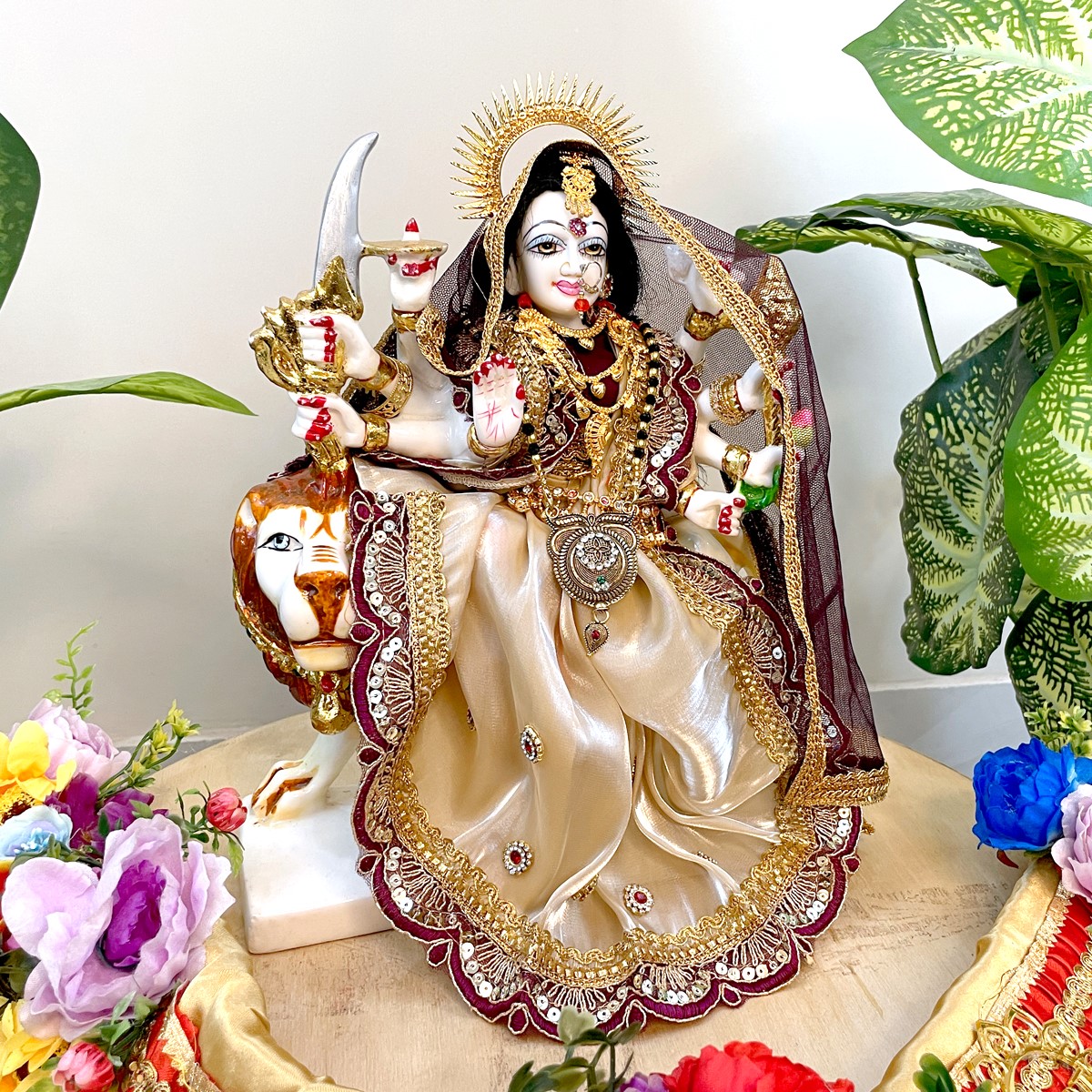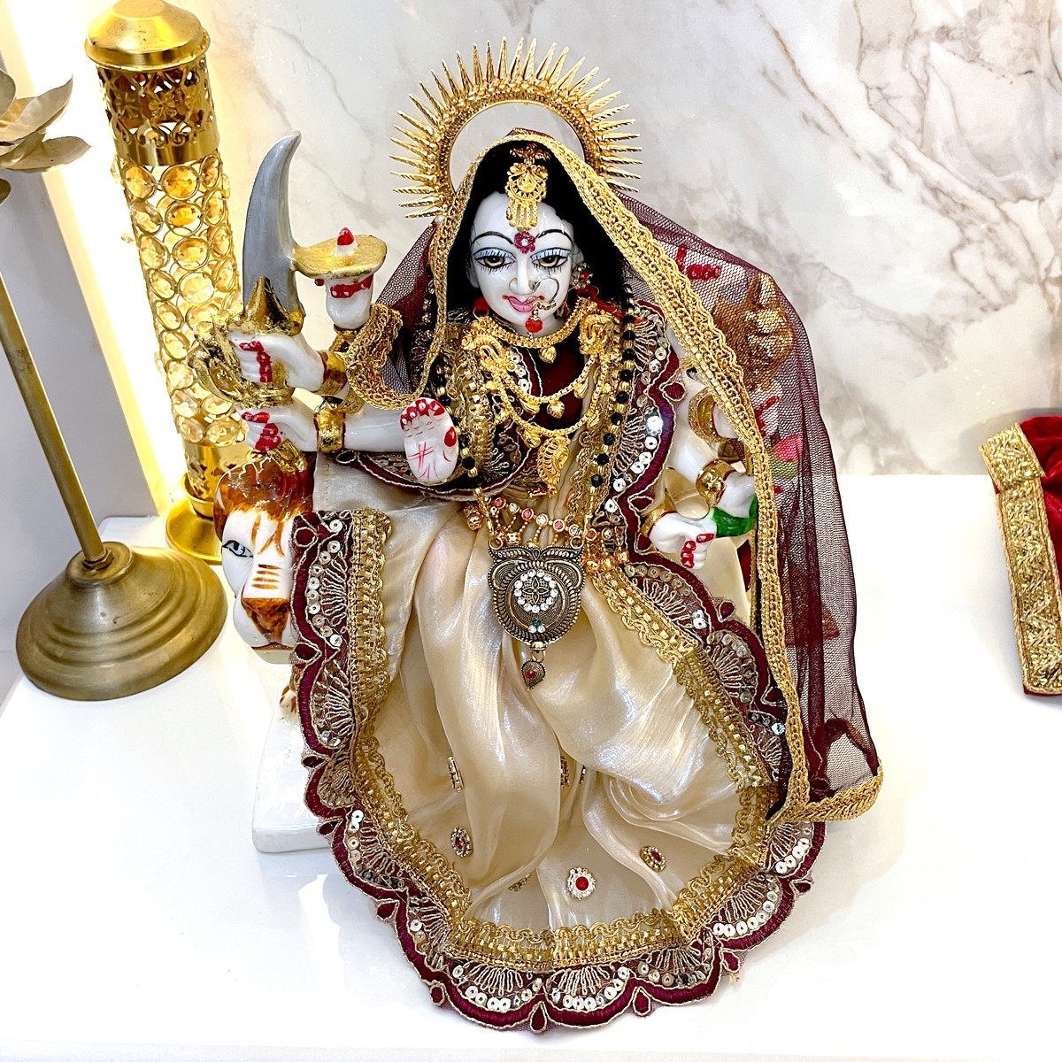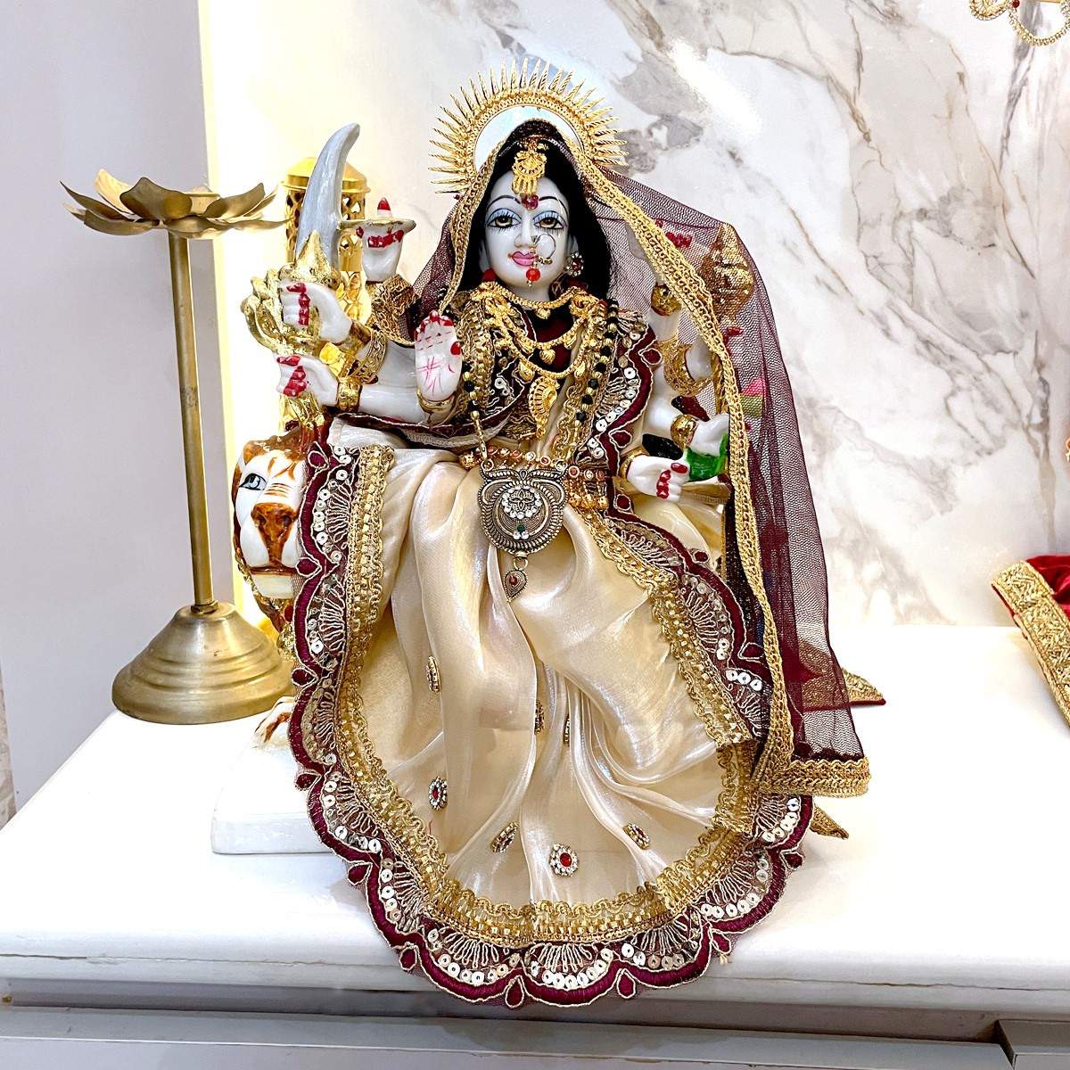This beautiful dress is made in soft cream fabric with rich maroon borders and golden lace work. It comes with a matching dupatta that gives a divine and graceful look to Mata Rani. Perfect for daily pooja, festivals, and temple use, the cream and maroon colors together bring a calm yet royal touch to your idol.