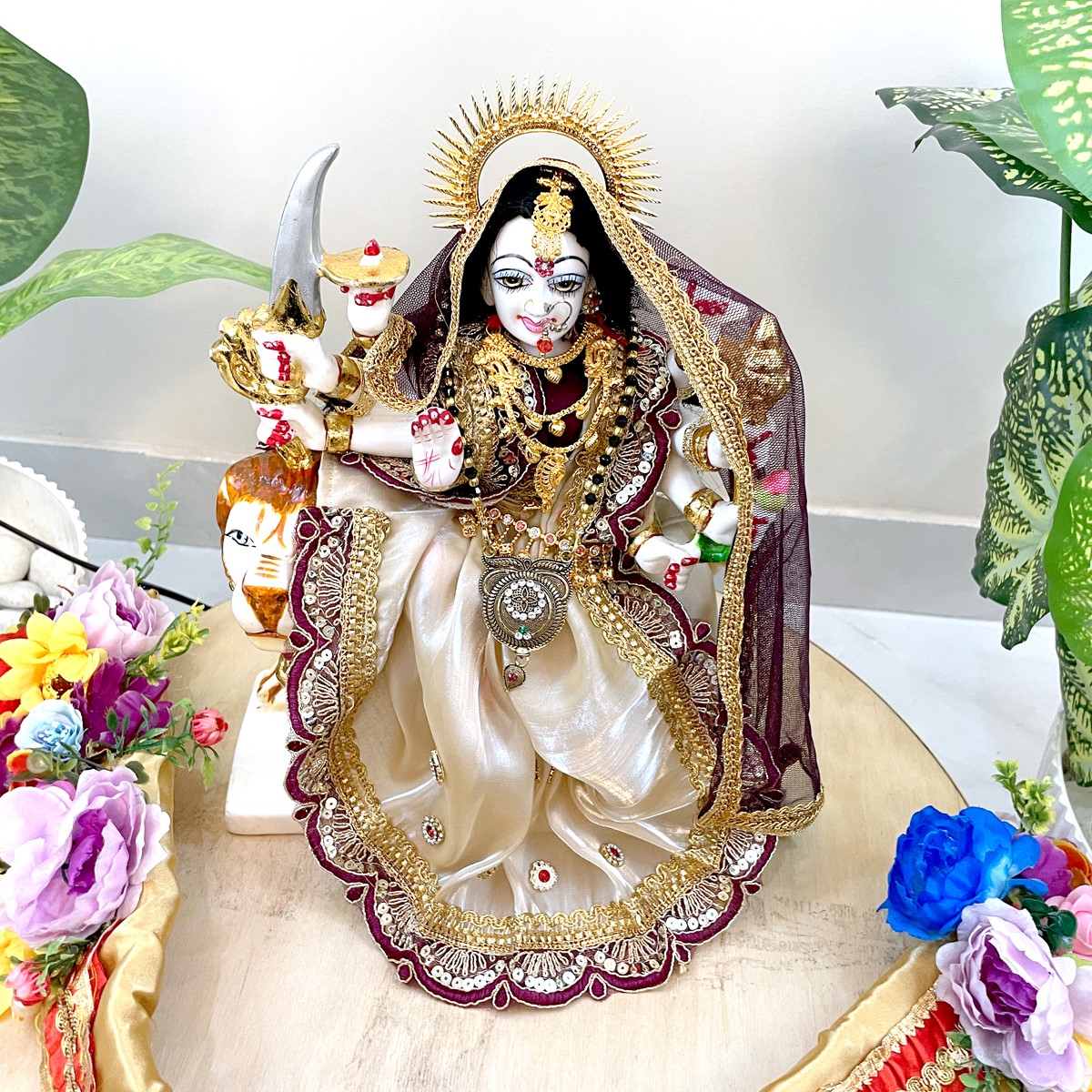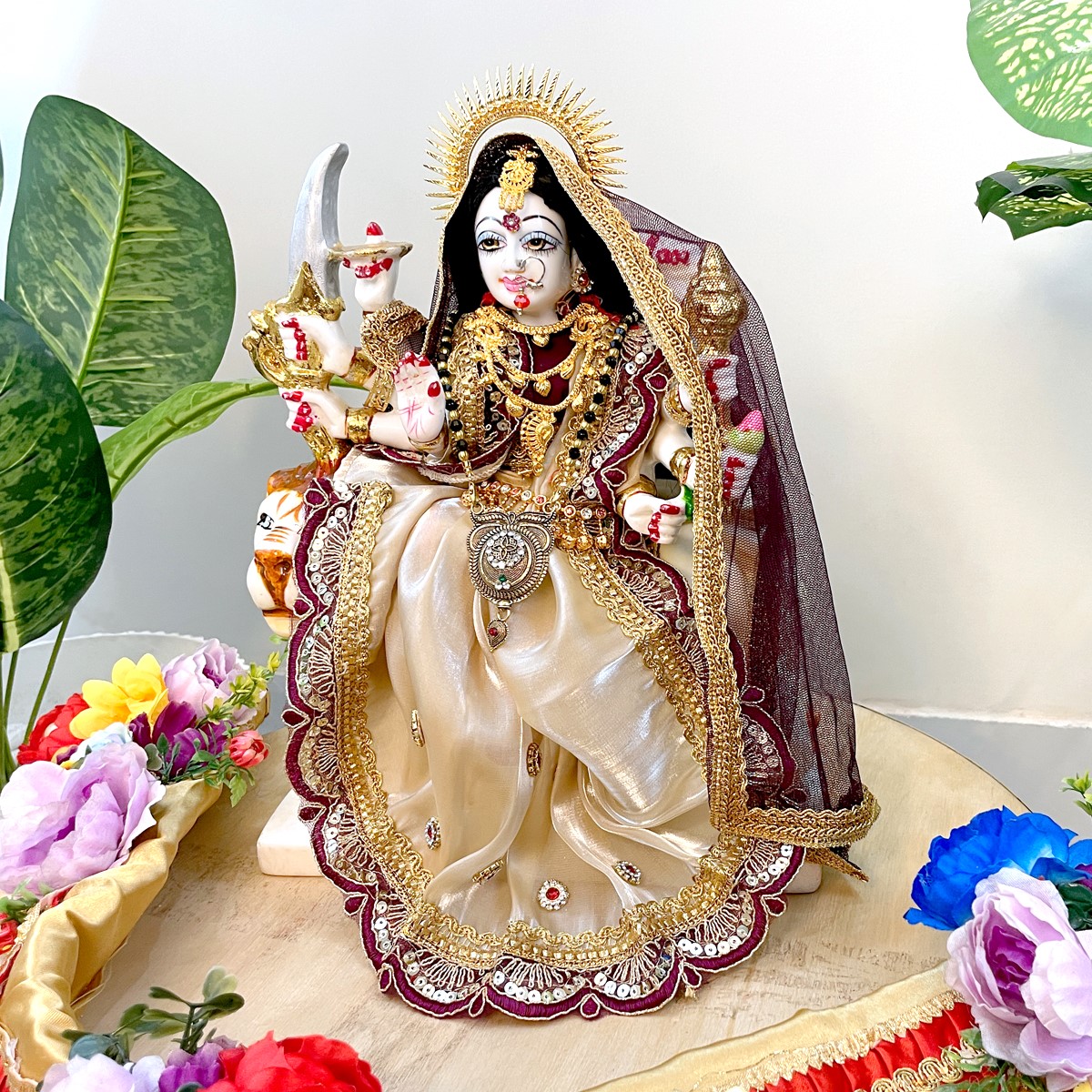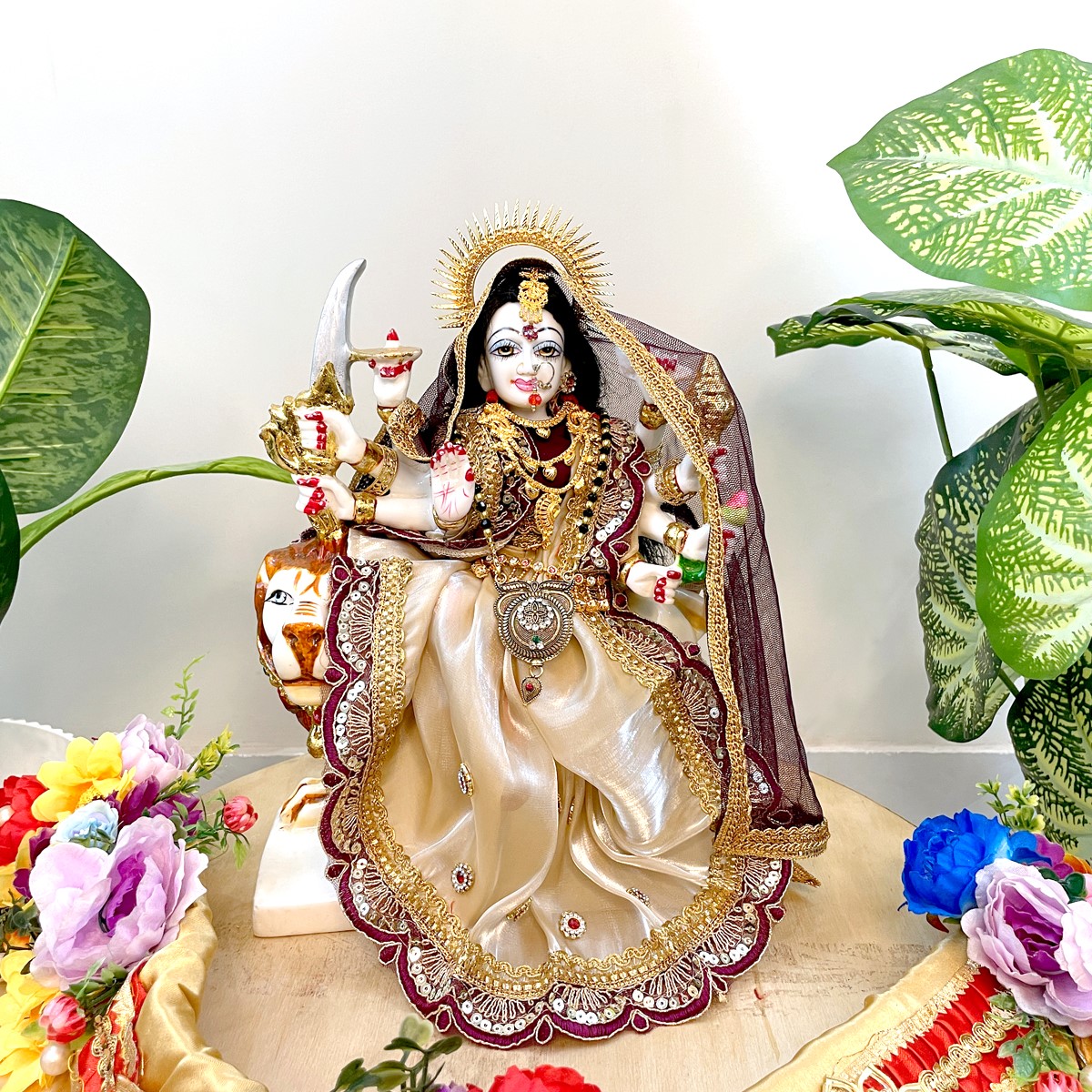This beautiful dress is made in soft cream fabric with rich maroon borders and golden lace work. It comes with a matching dupatta that gives a divine and graceful look to Mata Rani. Perfect for daily pooja, festivals, and temple use, the cream and maroon colors together bring a calm yet royal touch to your idol.