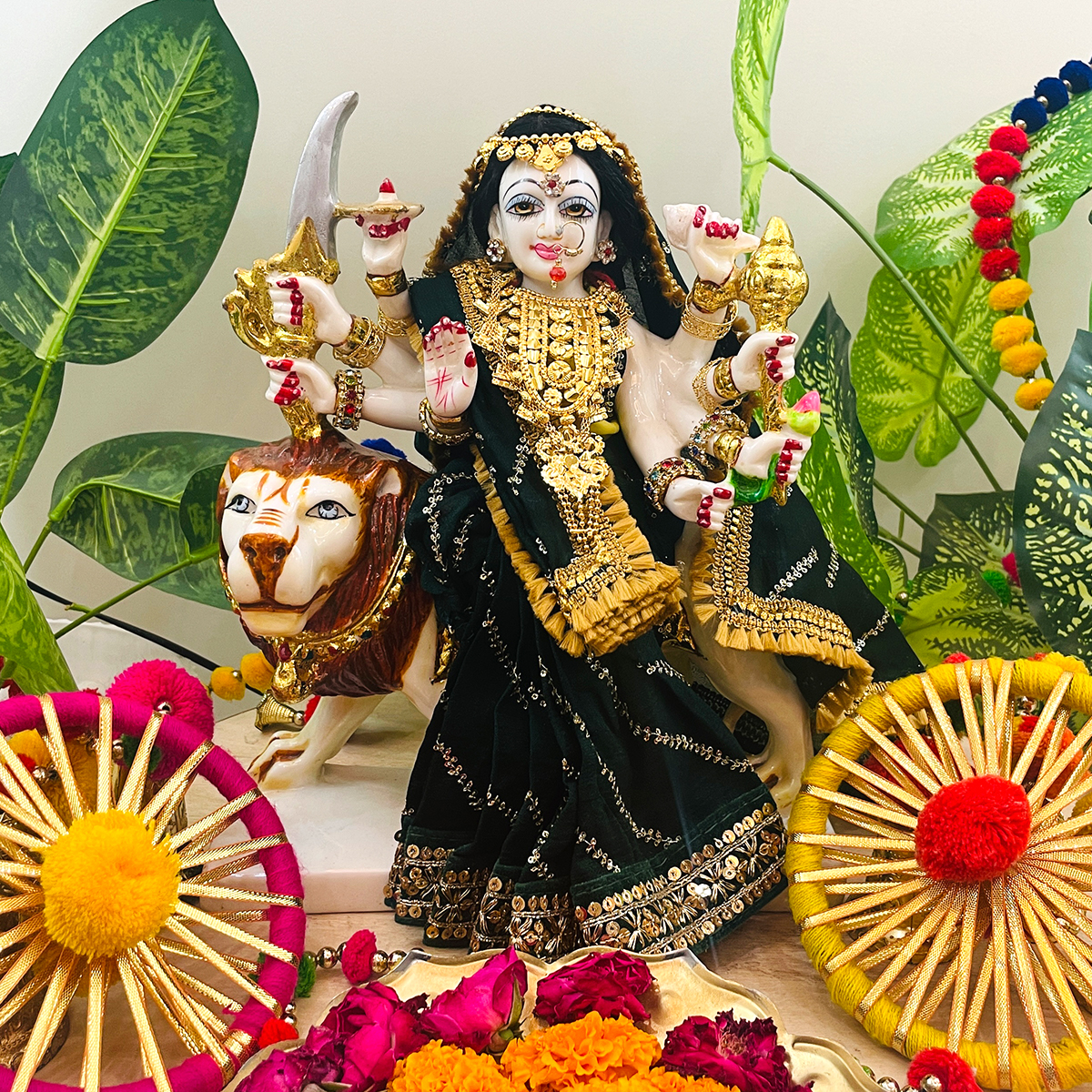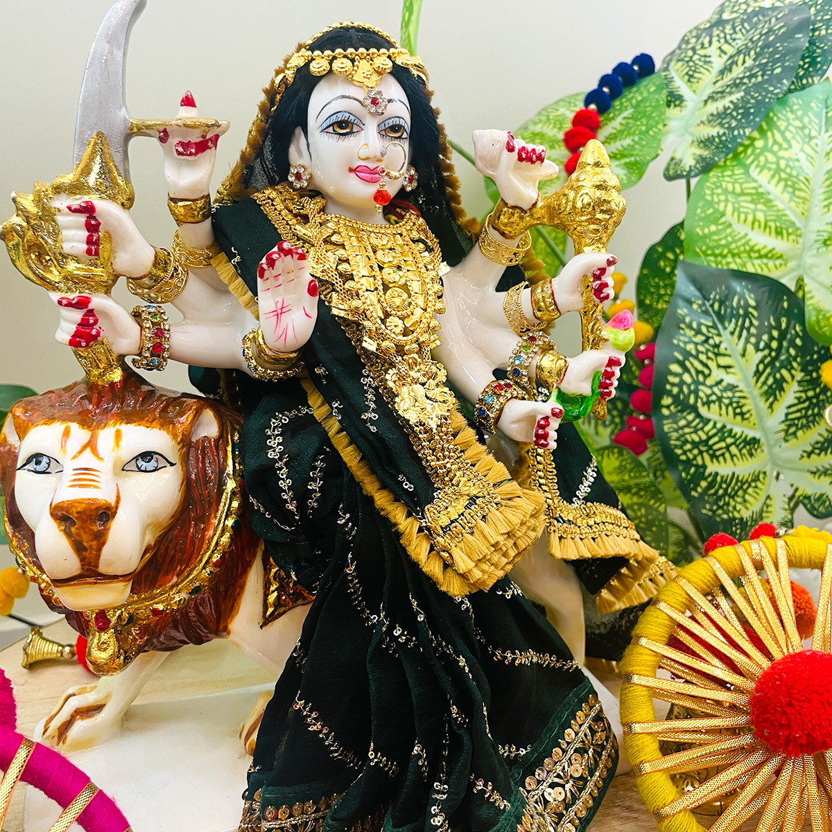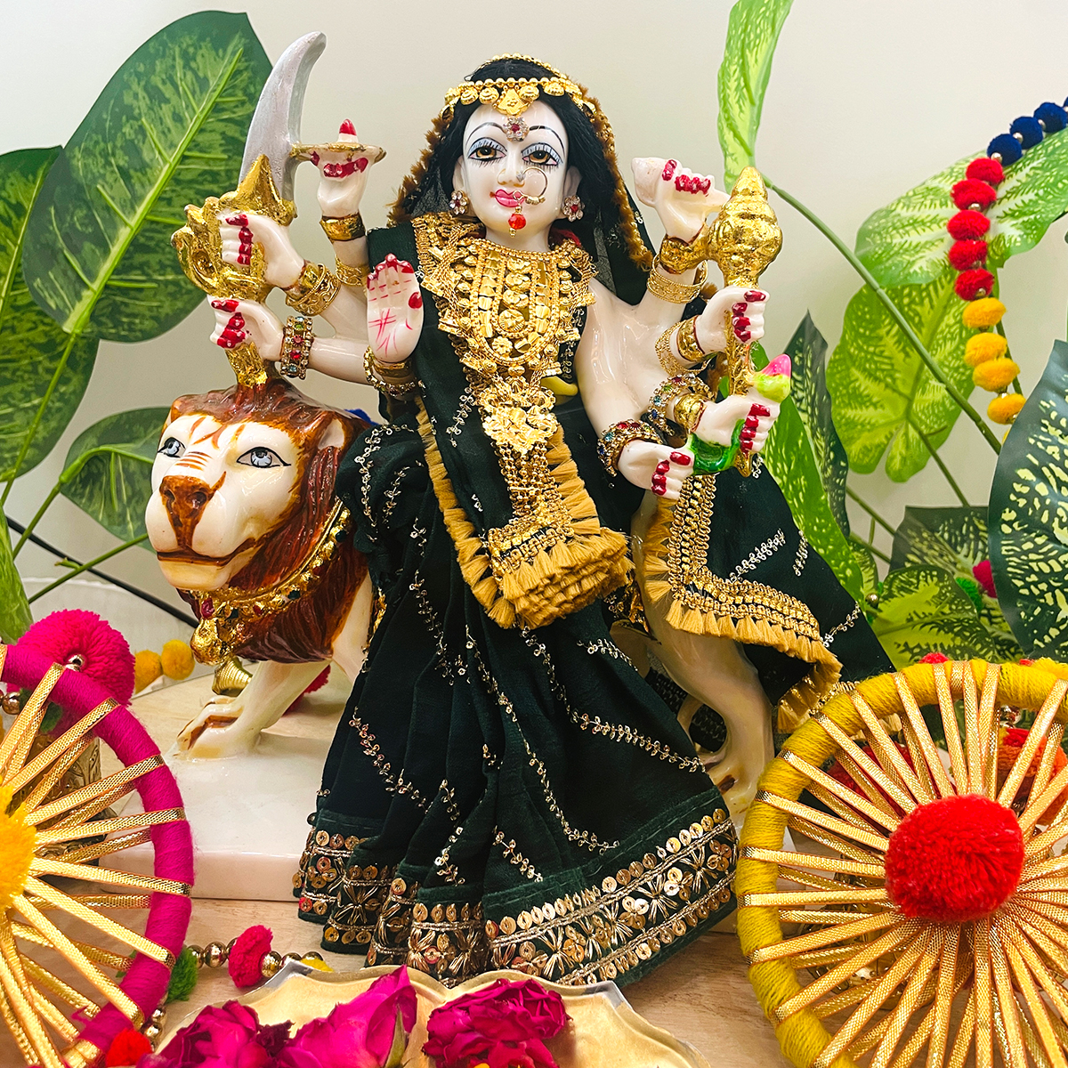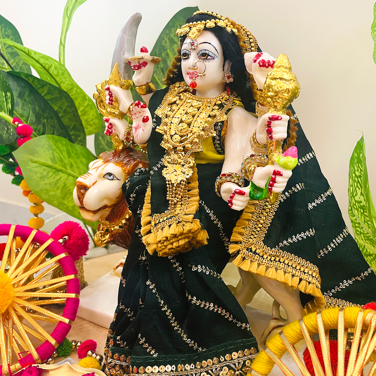 Dress your Mata Rani in this beautiful Devi Mata Poshak. A stitched saree-style dress in dark green, paired with a bright lemon yellow blouse. The saree is designed with slanting lines and a delicate border, adding a traditional touch to her appearance. This vibrant set is perfect for festive celebrations, daily darshan, or special pujas. With its simple design and rich color combination.