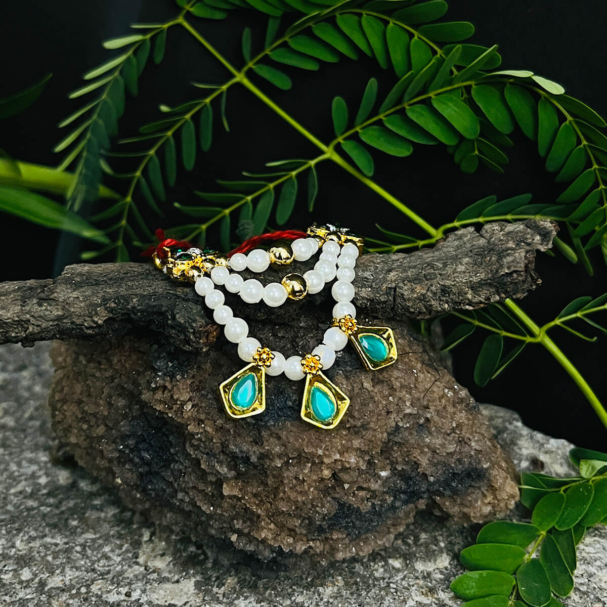 Graceful Design: Features multiple strands of pearls with golden beads and emerald-green teardrop stones.