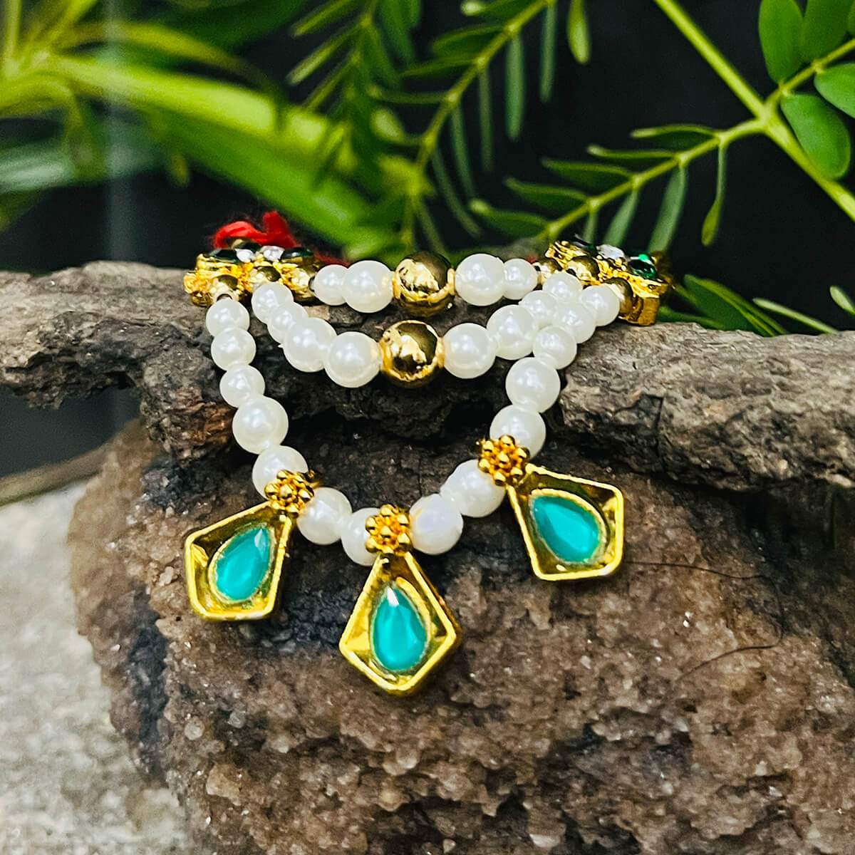 Sacred Color Combination: White pearls symbolize peace, while gold and green elements signify prosperity and divine blessings.