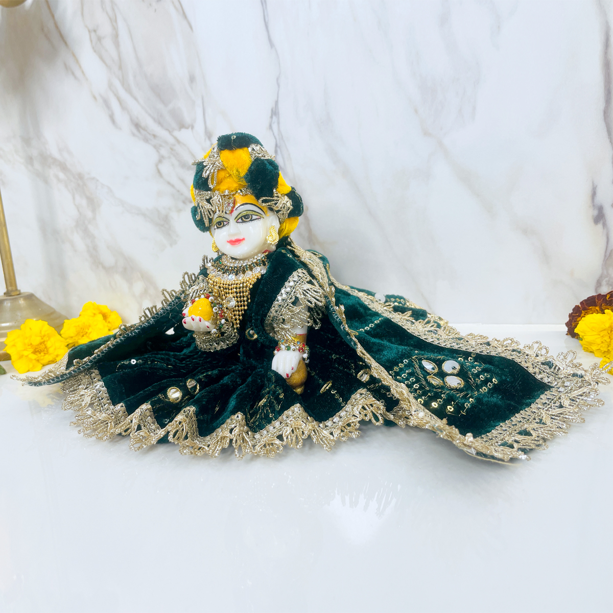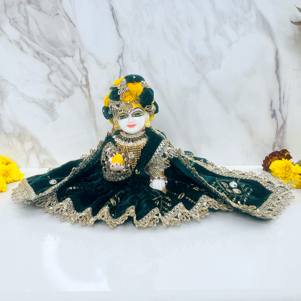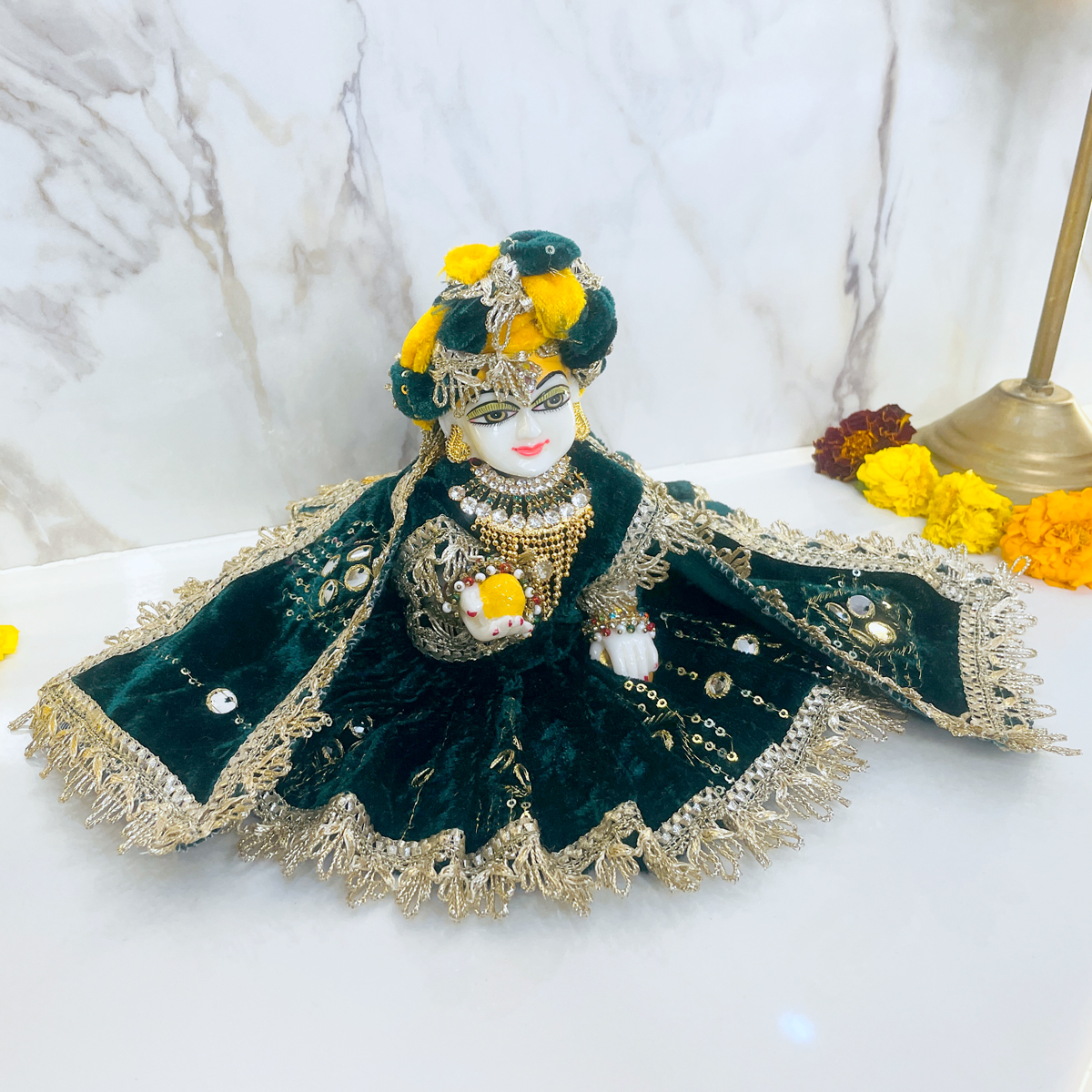 Prepare your Kanha Ji for the winter season with this luxurious Dark Green Velvet Poshak. This heavy winter dress is crafted from rich velvet fabric, ensuring warmth and comfort for your deity. The outfit features exquisite gold zari embroidery, and a beautiful gold fringed lace border that adds a royal touch.