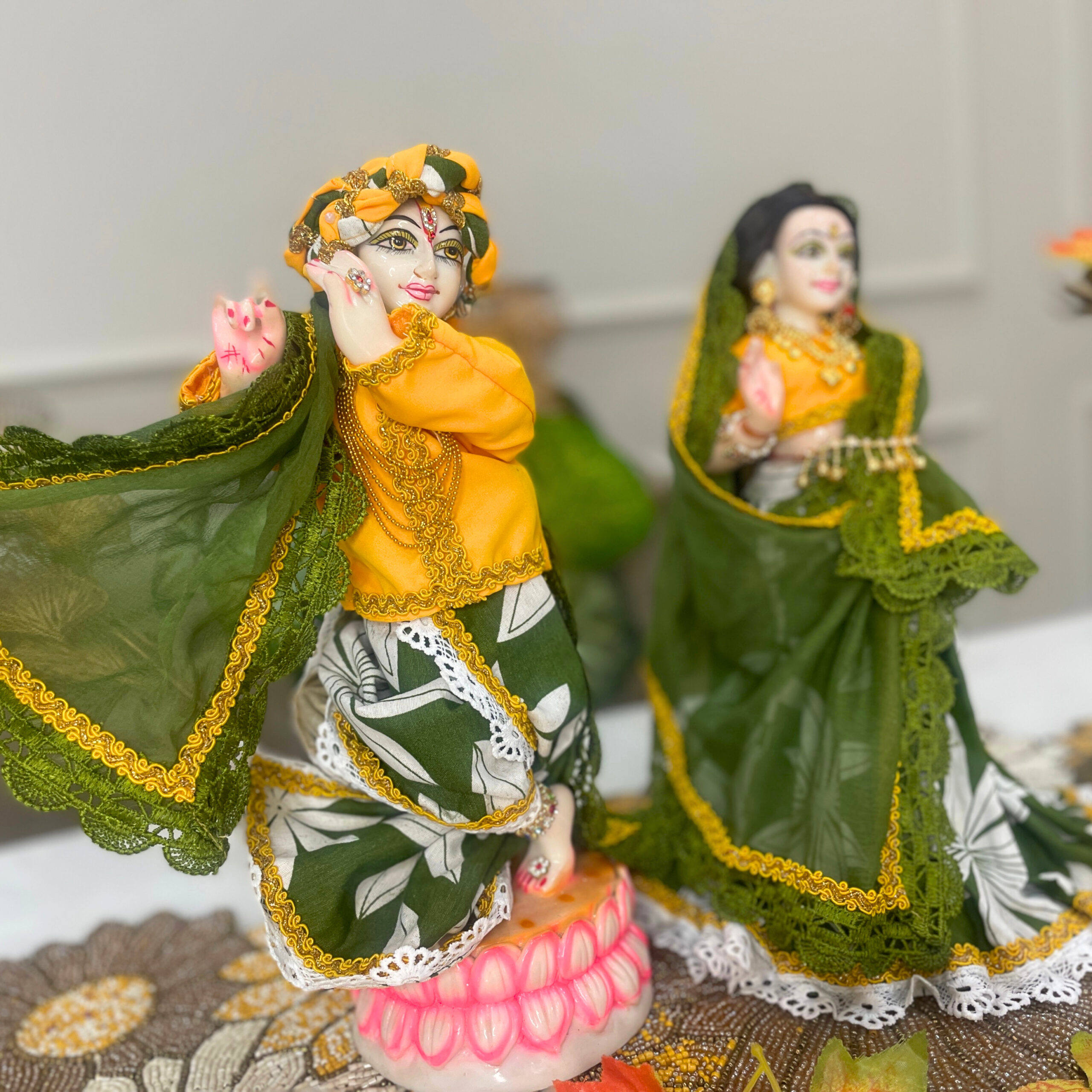 This enchanting Radha Krishna shringar reflects the harmony of earth and light. The deep green hues symbolize growth, peace, and the soothing energy of Vrindavan’s sacred forests, while the golden yellow tones represent joy, prosperity, and Krishna’s radiant divine presence.