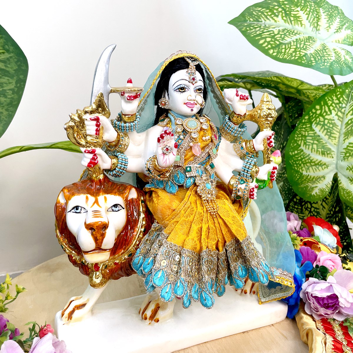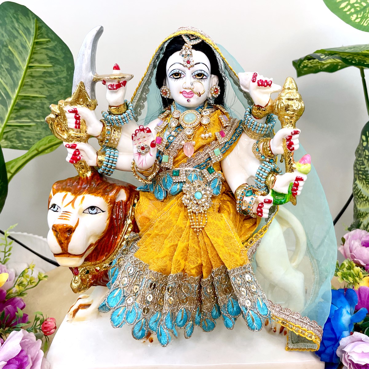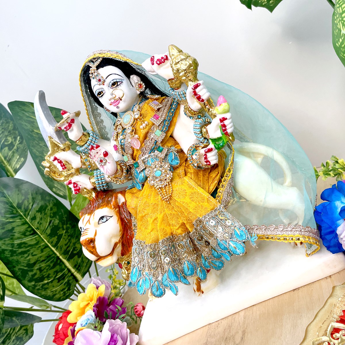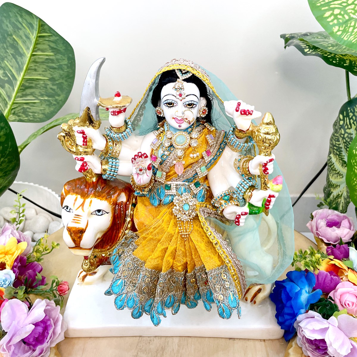 A graceful saree-style dress in yellow with light blue lace borders, paired with a soft blue blouse and a delicate net dupatta finished with golden lace. Designed with devotion and elegance, it brings a radiant charm to festive and daily adorning.