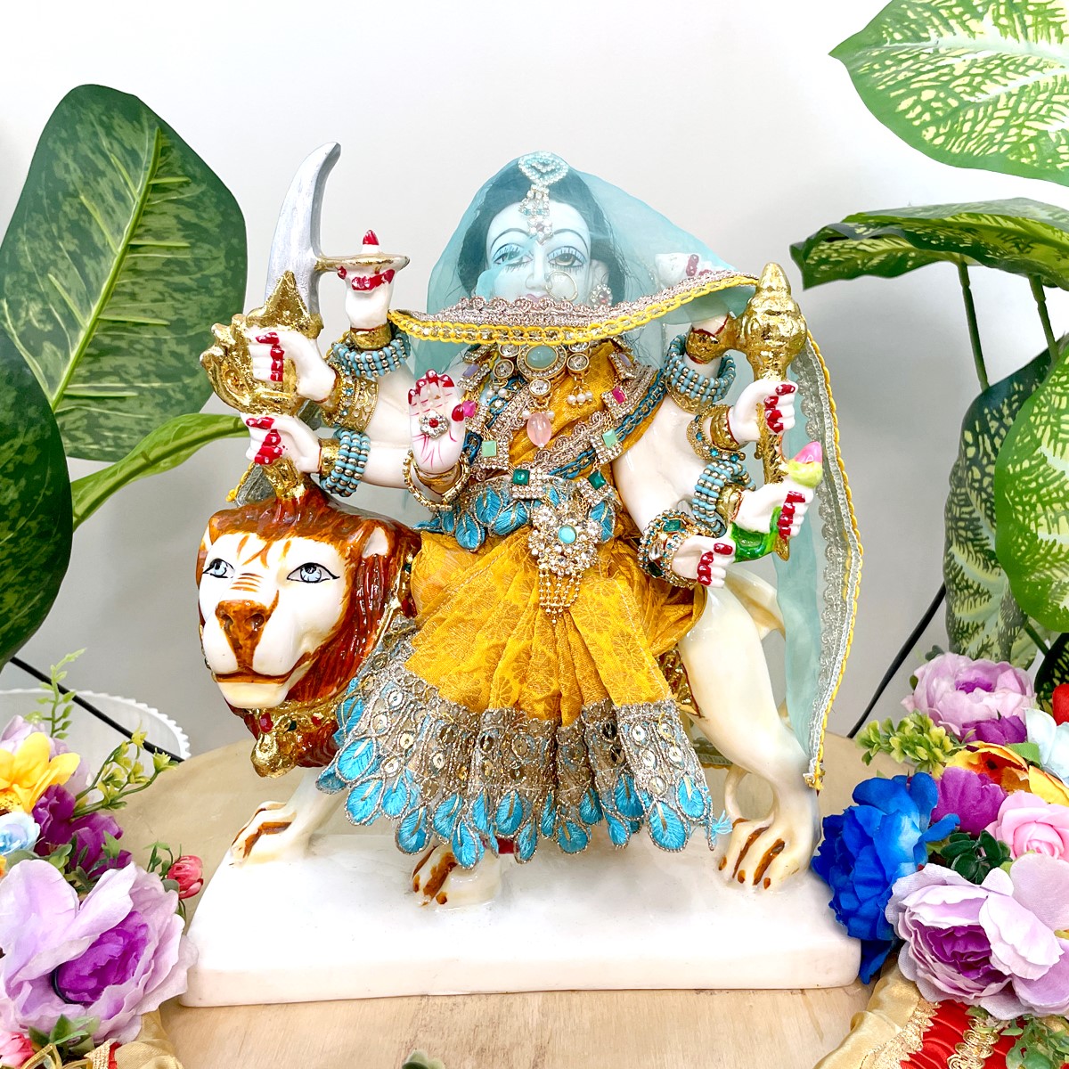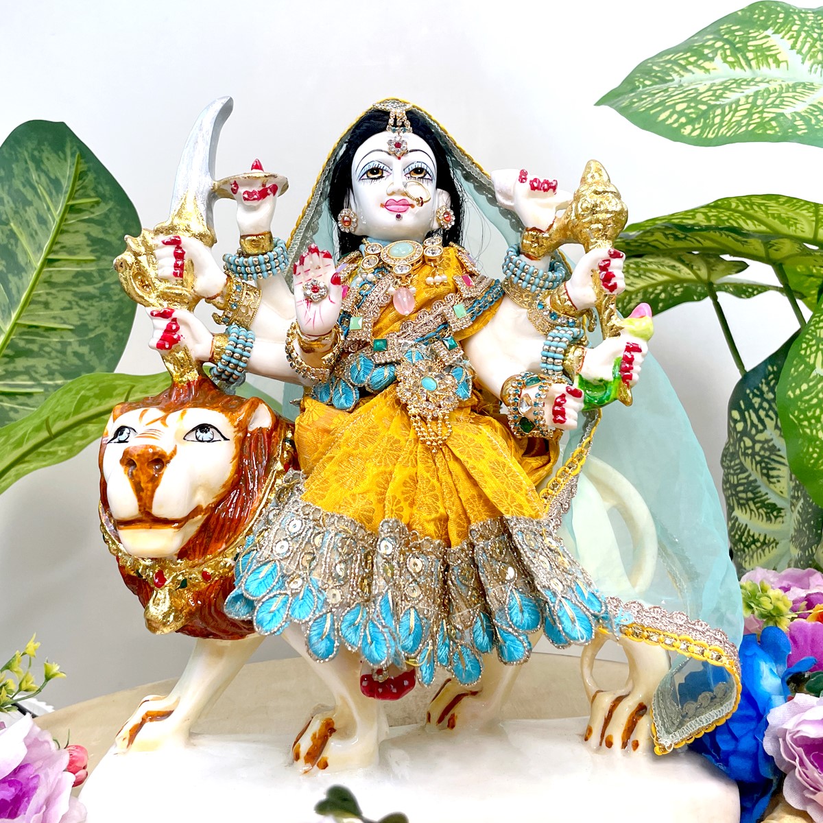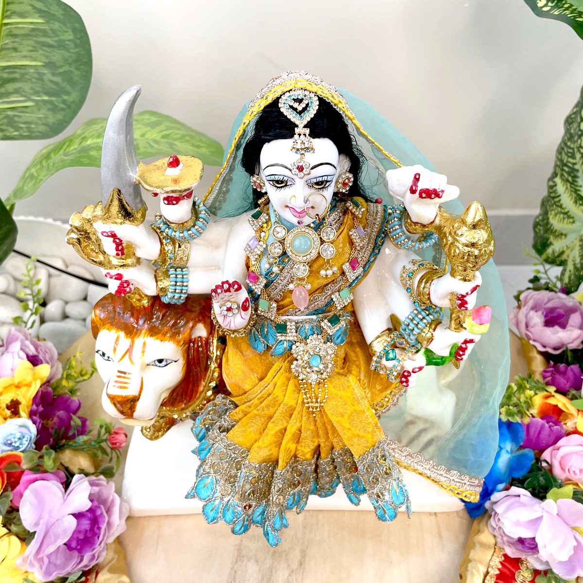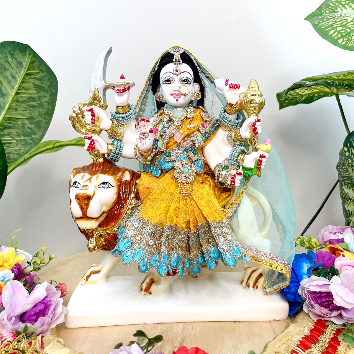 A graceful saree-style dress in yellow with light blue lace borders, paired with a soft blue blouse and a delicate net dupatta finished with golden lace. Designed with devotion and elegance, it brings a radiant charm to festive and daily adorning.