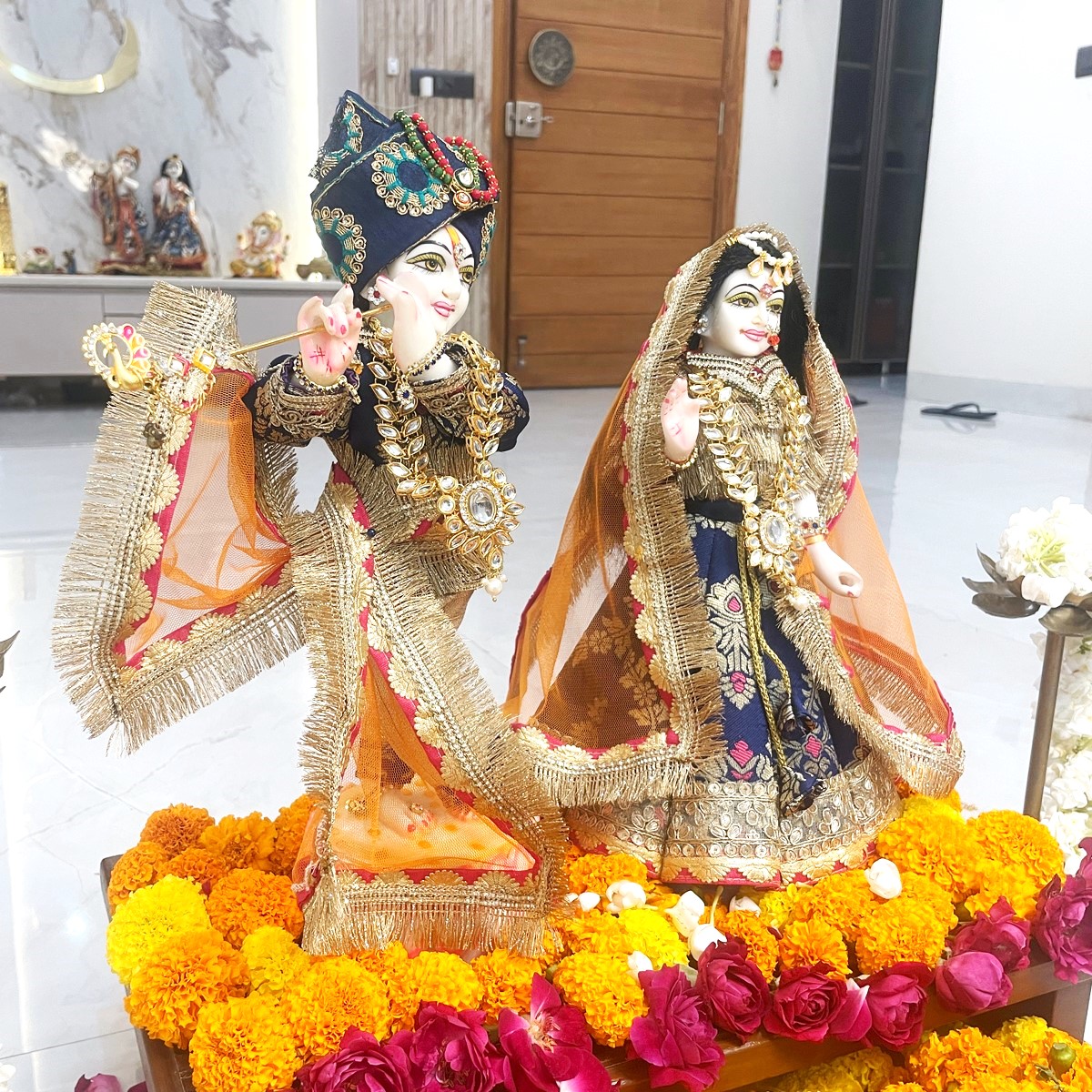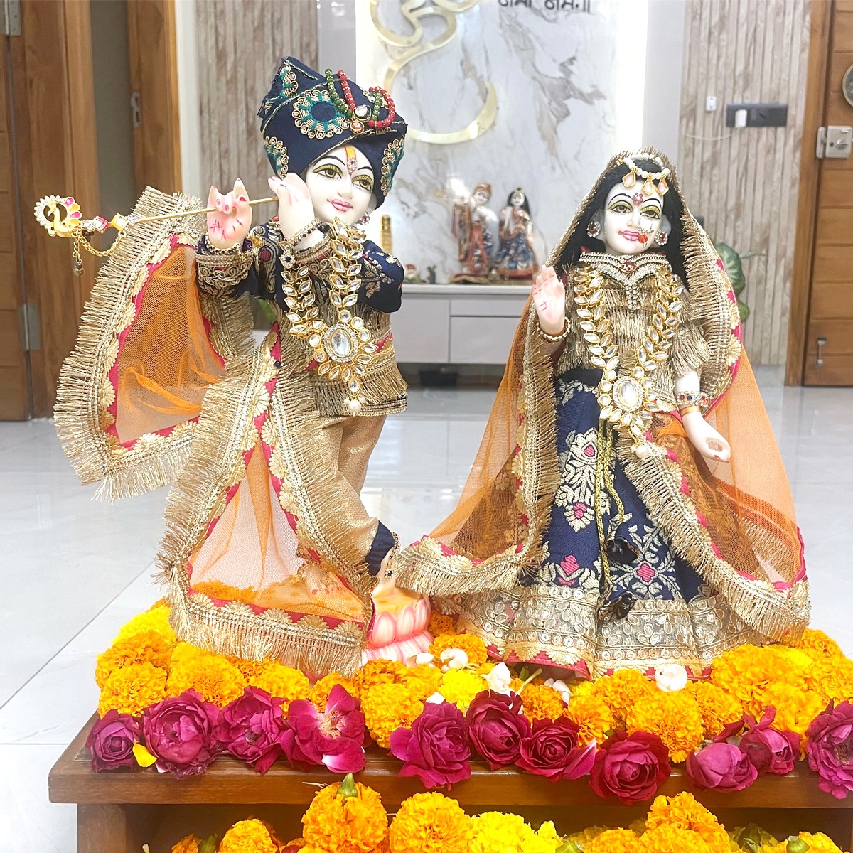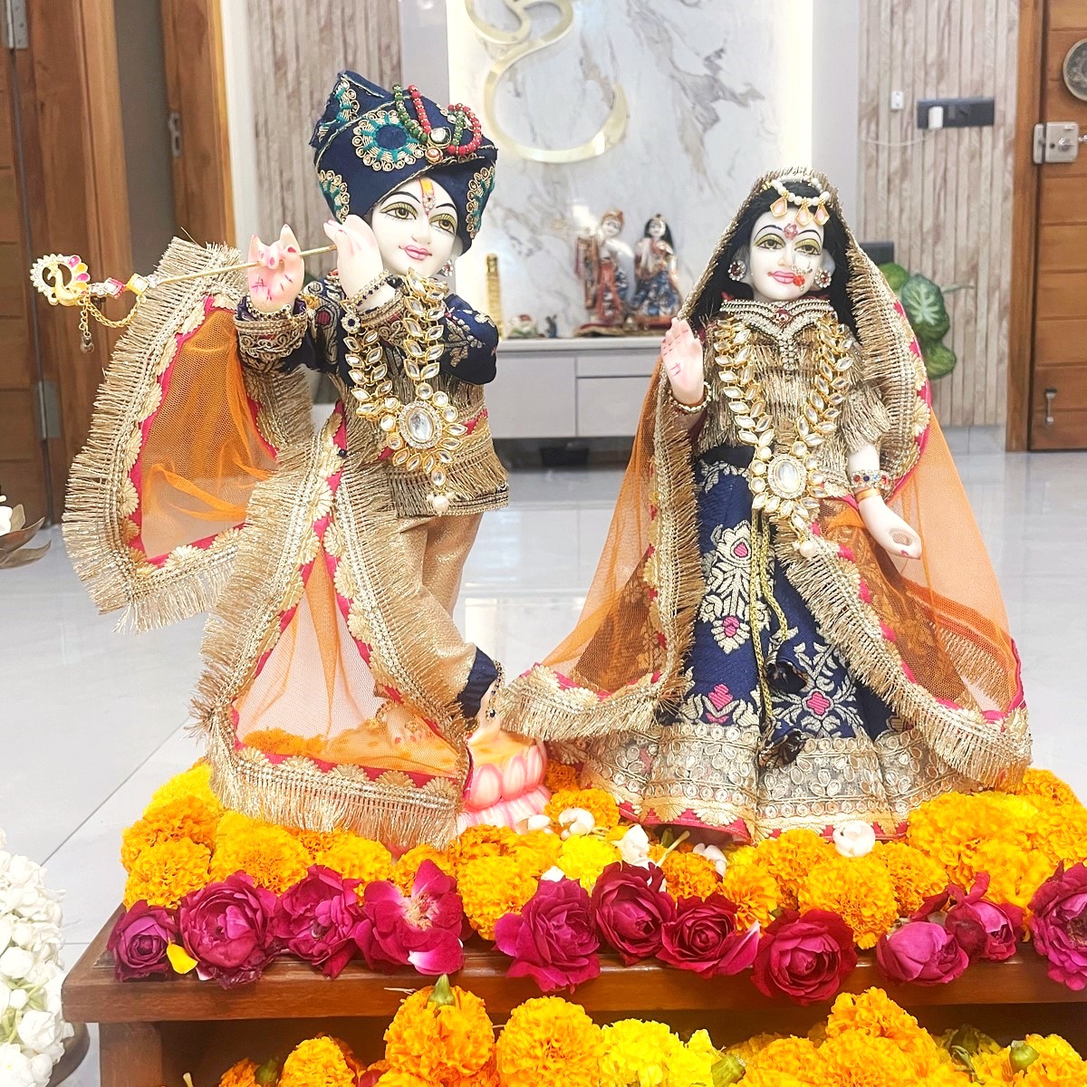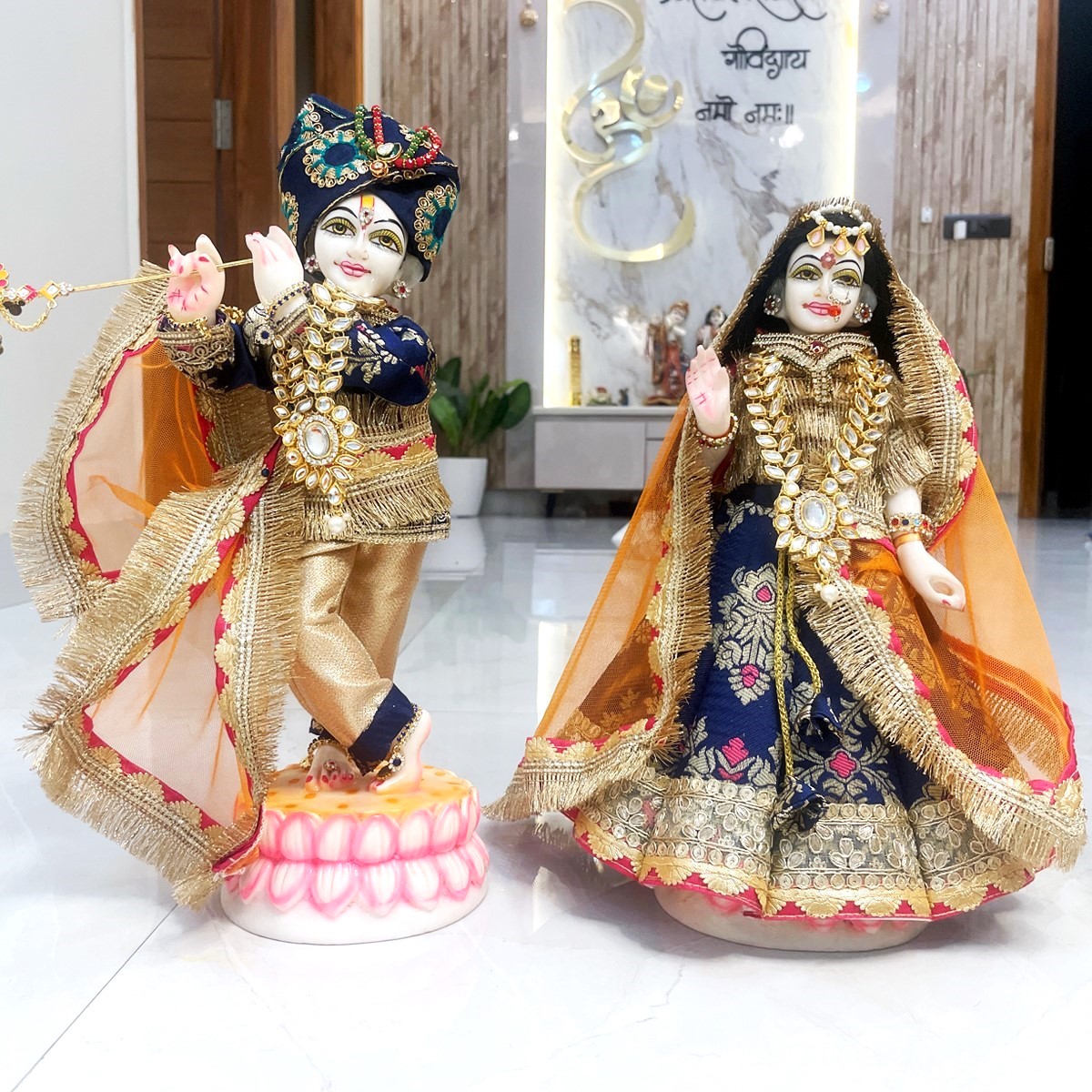 This set is designed in the beautiful colors of Vrindavan, showing the charm of Radha Krishna’s leela. Radha ji’s dress has a blue lehenga with blouse and an orange net dupatta, while Krishna ji’s outfit comes with a blue kurta, golden dhoti, and orange angavastram. The combination looks bright and graceful, bringing the divine beauty of Radha Krishna to life.