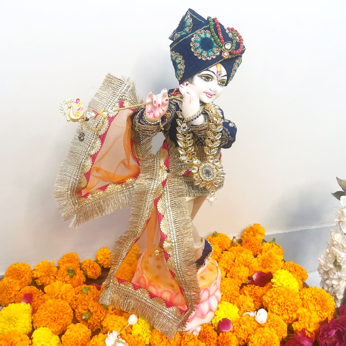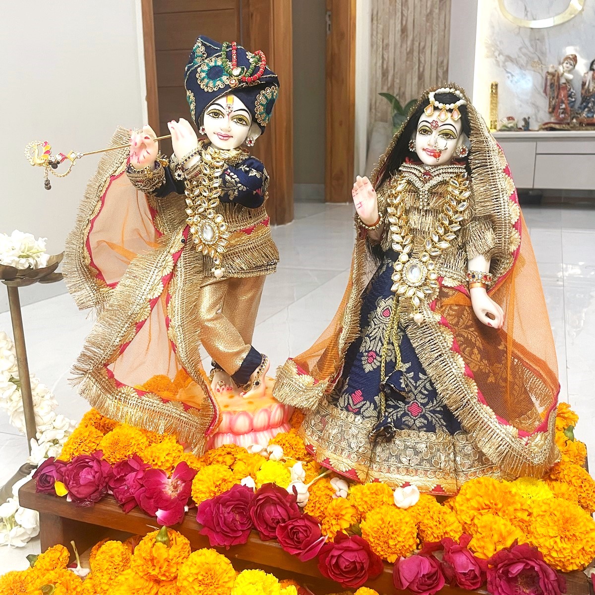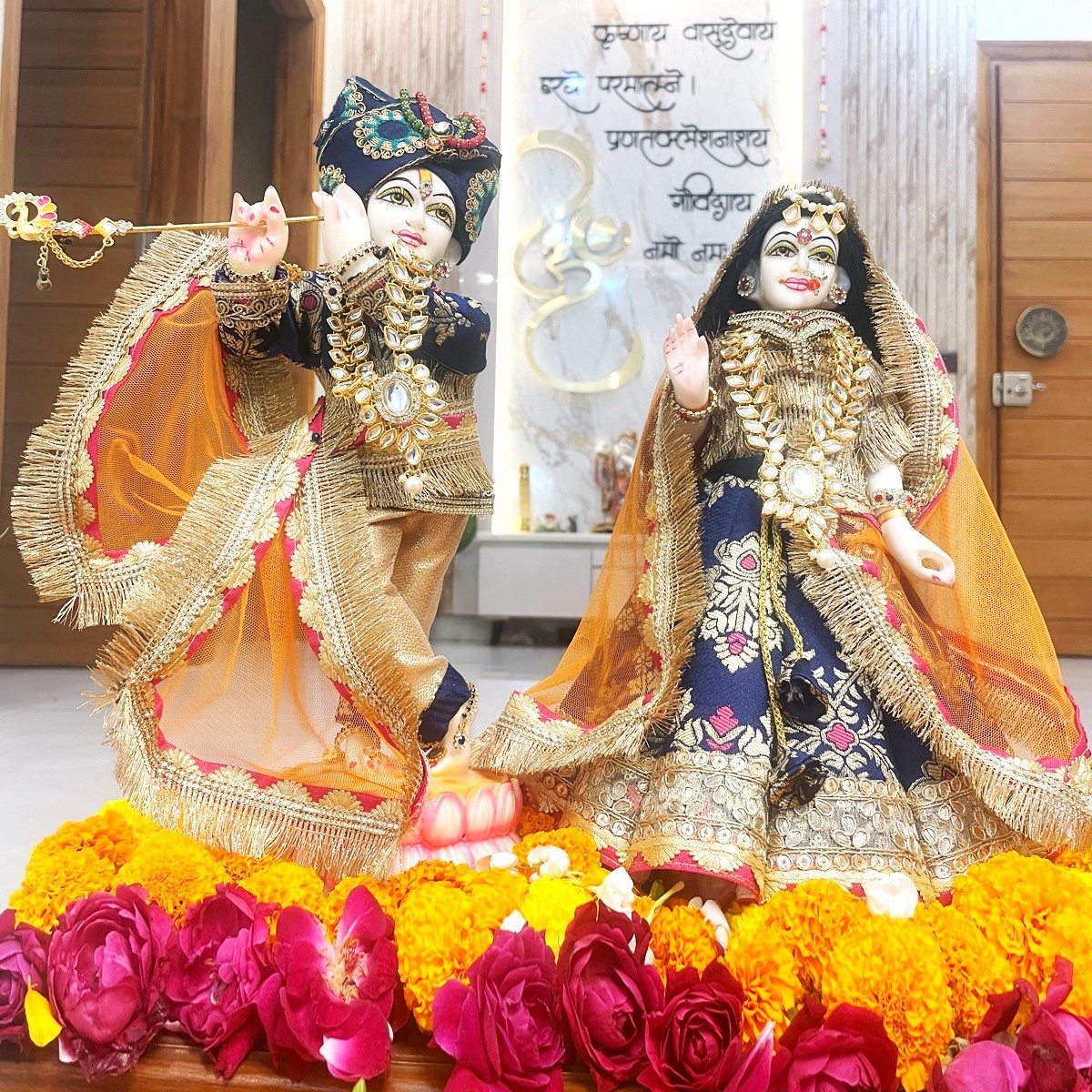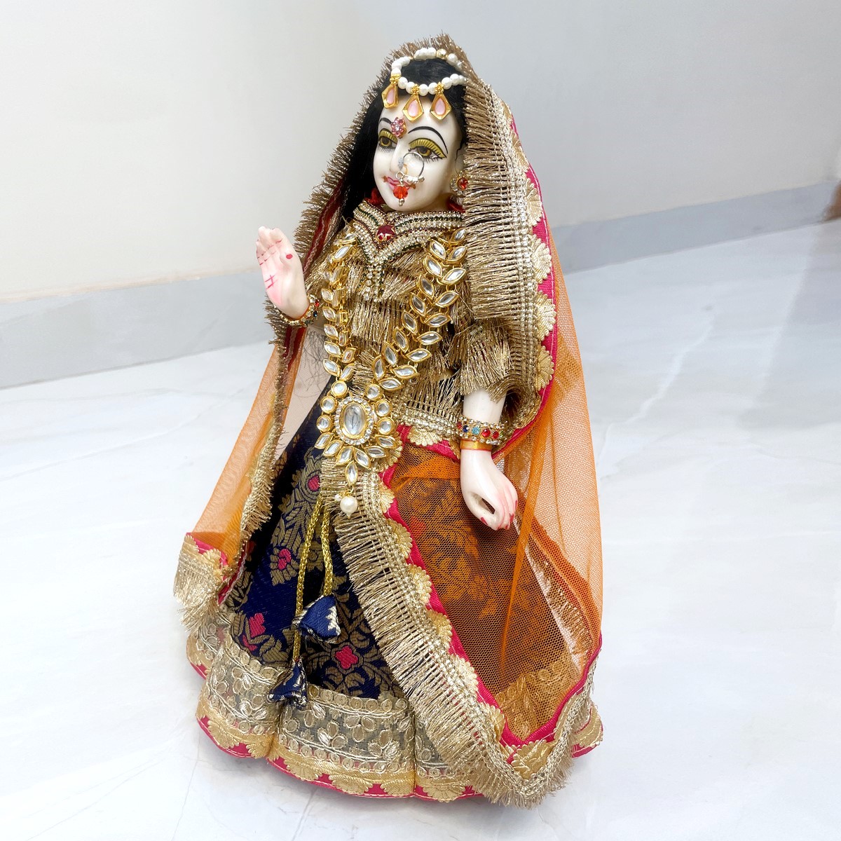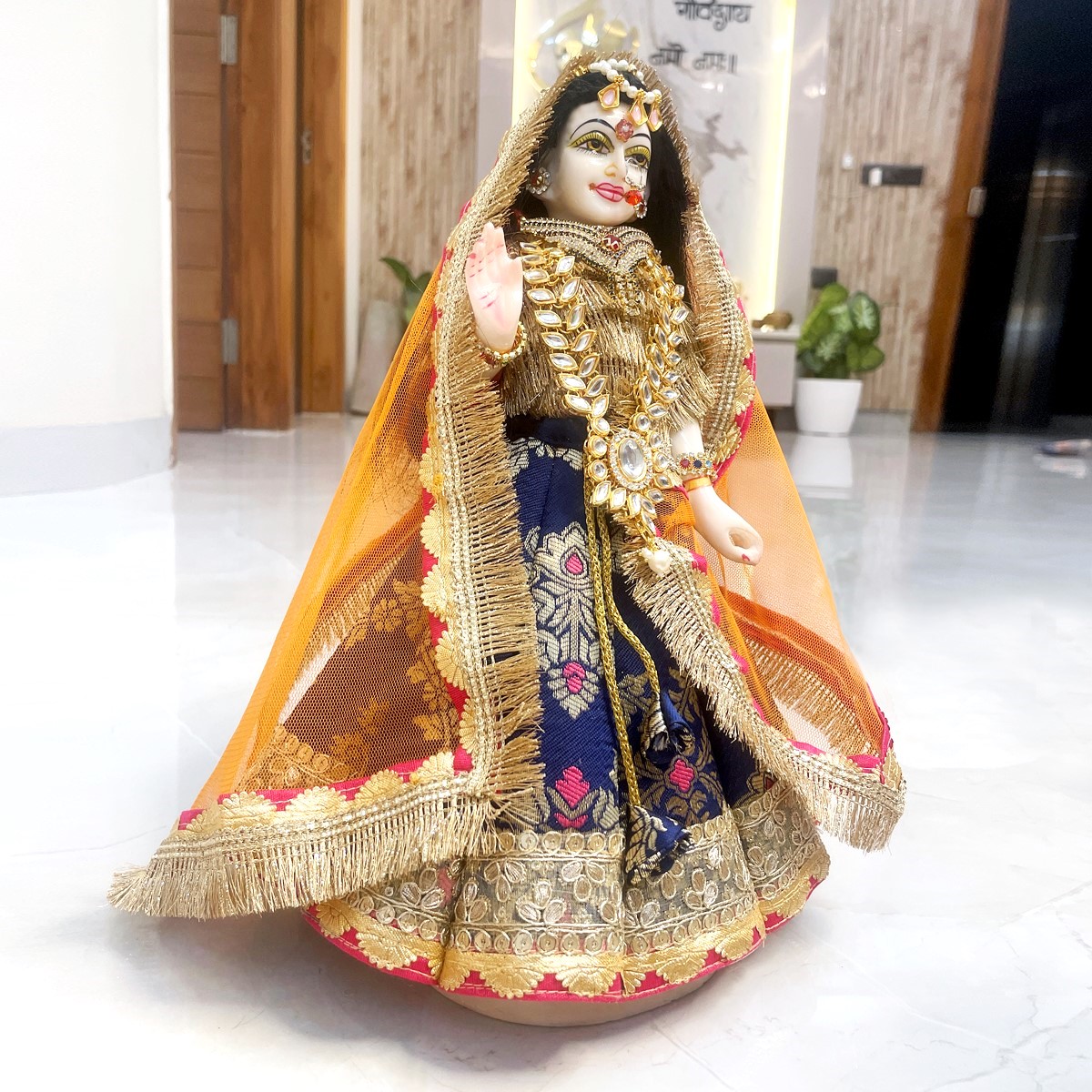 This set is designed in the beautiful colors of Vrindavan, showing the charm of Radha Krishna’s leela. Radha ji’s dress has a blue lehenga with blouse and an orange net dupatta, while Krishna ji’s outfit comes with a blue kurta, golden dhoti, and orange angavastram. The combination looks bright and graceful, bringing the divine beauty of Radha Krishna to life.