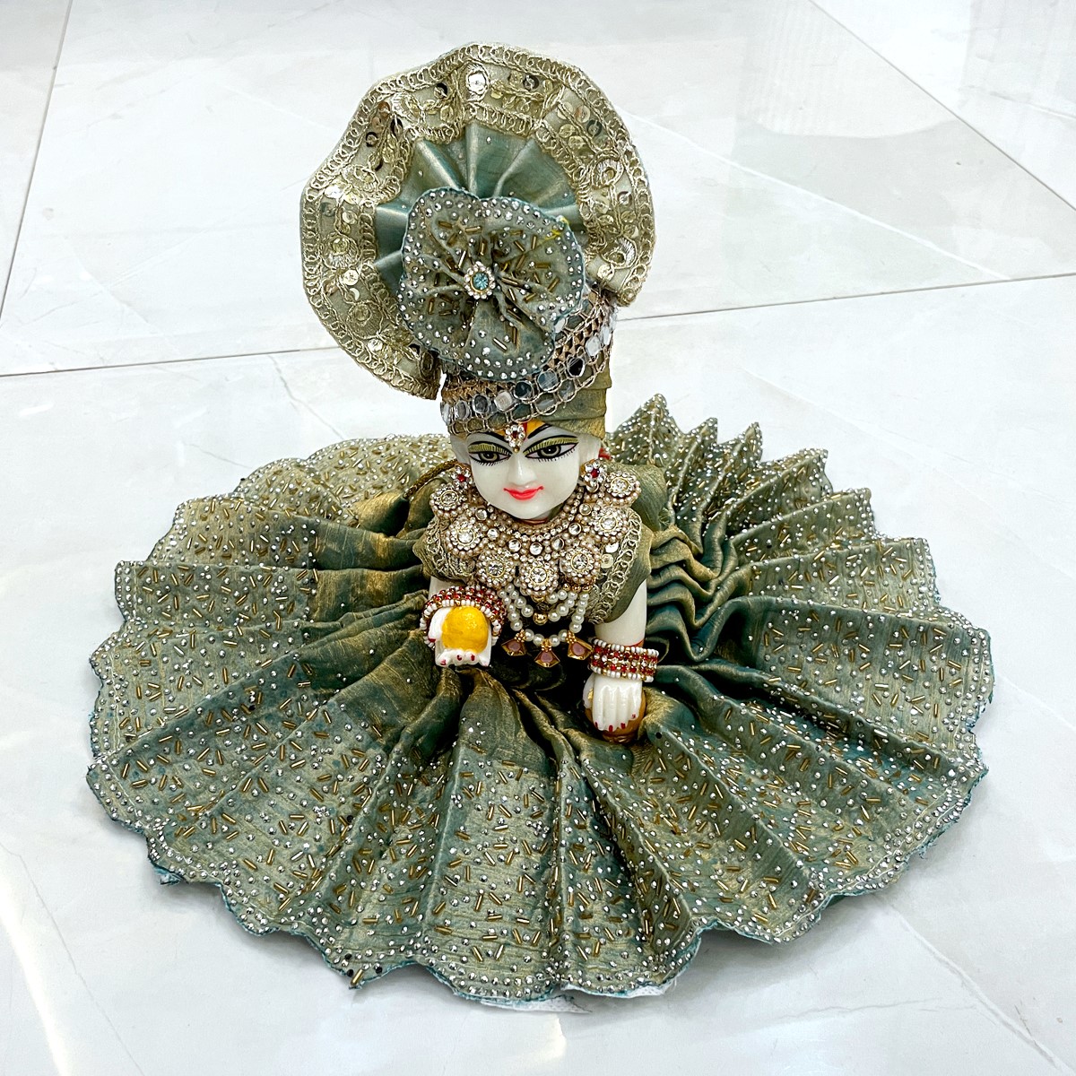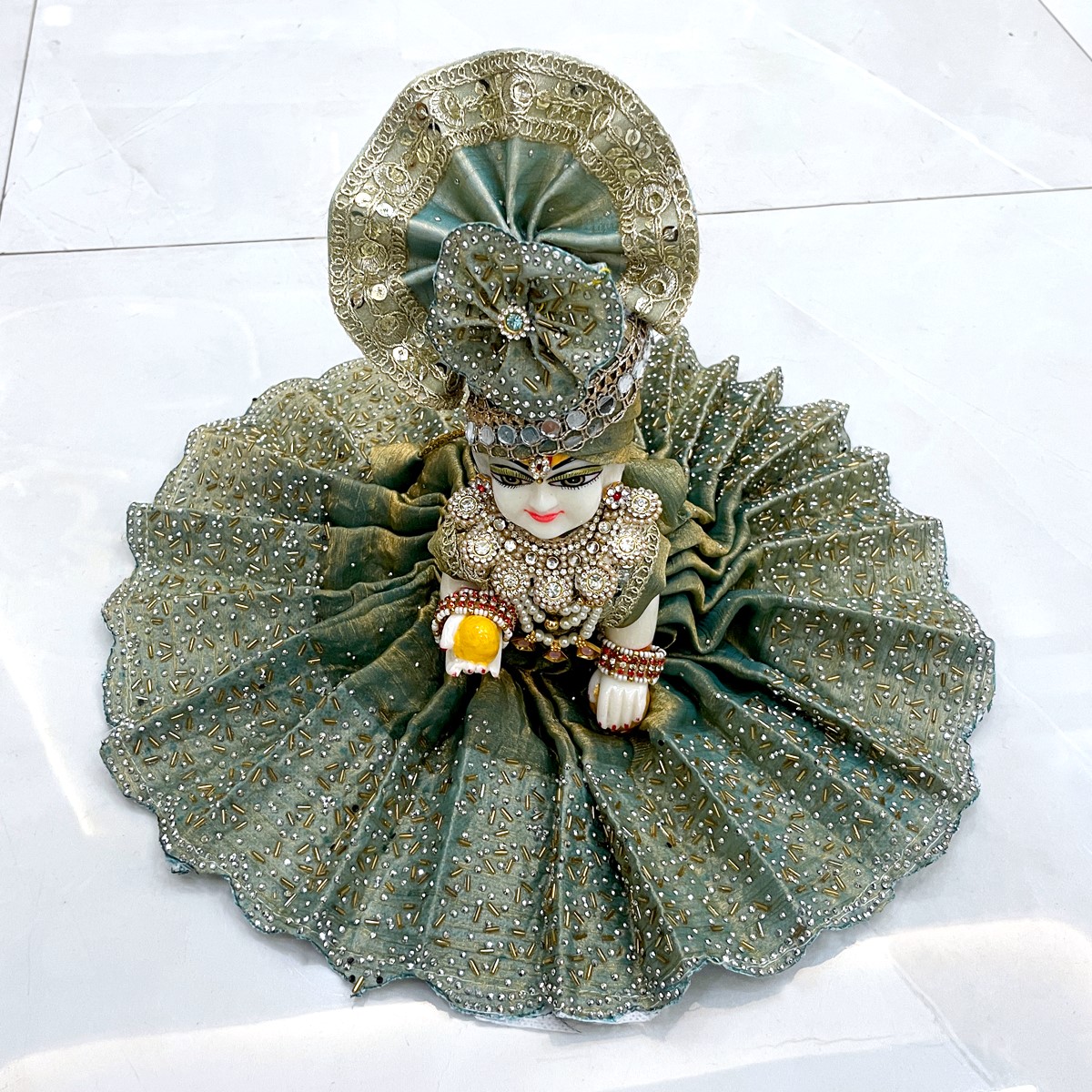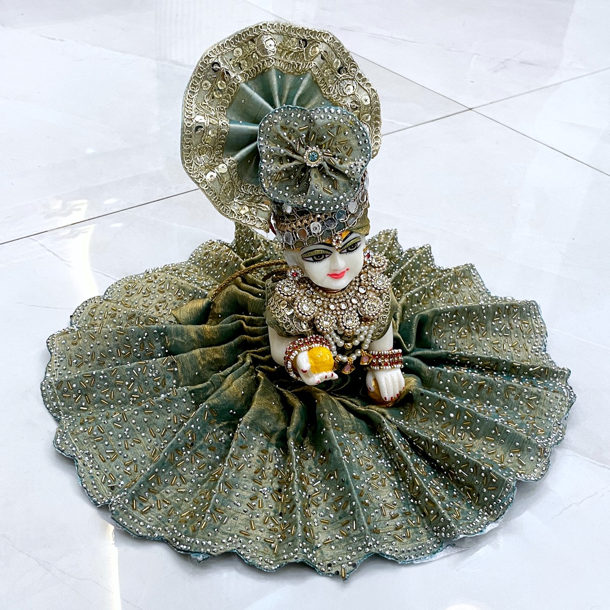 Adorn your little Laddu Gopal with this elegant cut-dana embellished attire, crafted to capture the charm and devotion of Braj. Perfect for festive pooja or daily decoration, this poshak brings grace, tradition, and divine playfulness to your deity’s ensemble.