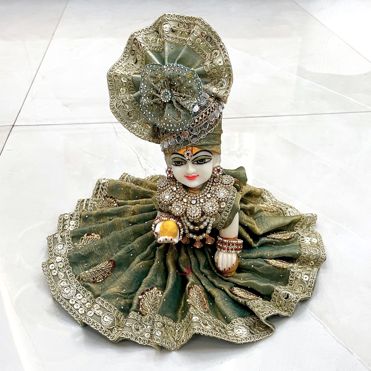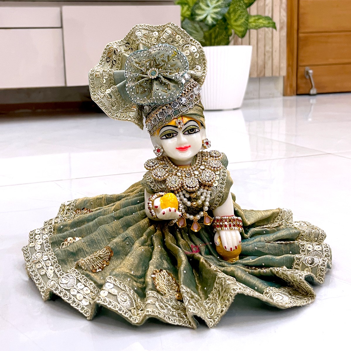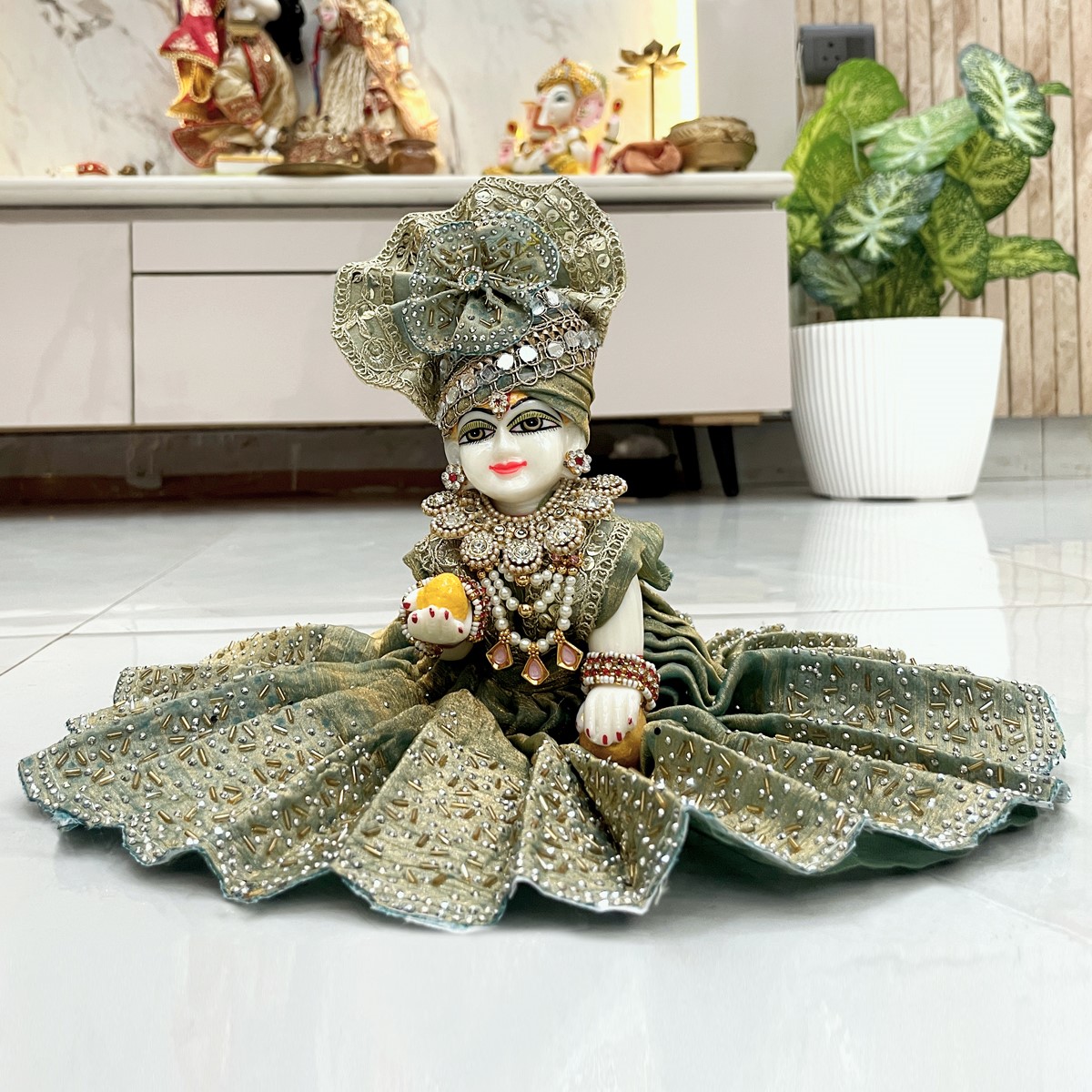 Adorn your little Laddu Gopal with this elegant cut-dana embellished attire, crafted to capture the charm and devotion of Braj. Perfect for festive pooja or daily decoration, this poshak brings grace, tradition, and divine playfulness to your deity’s ensemble.