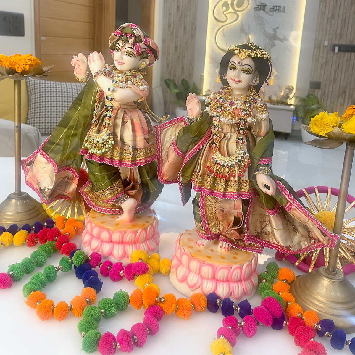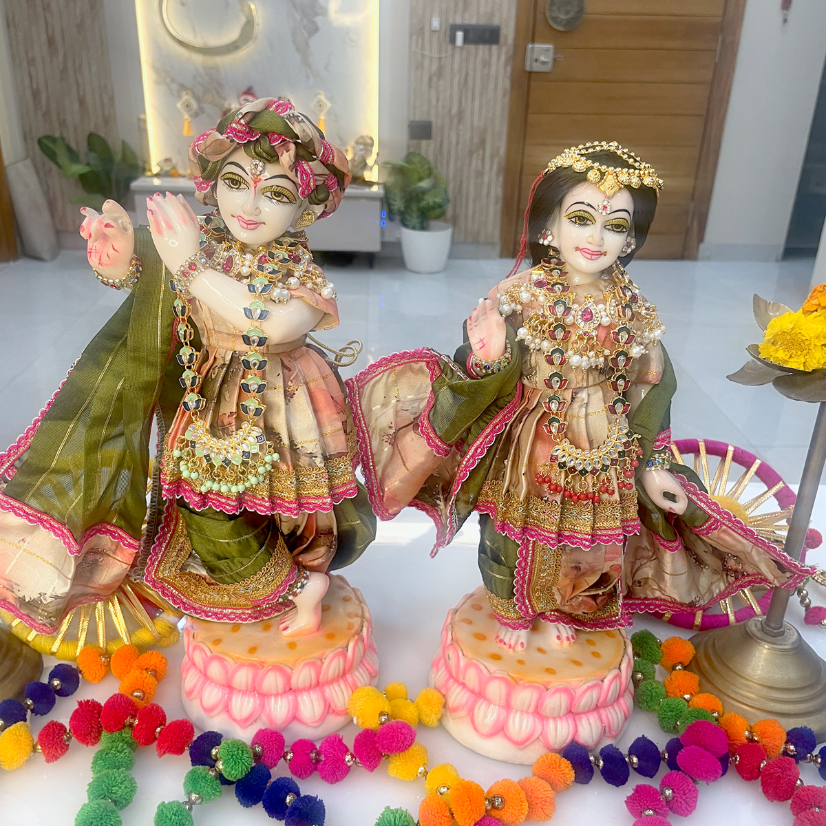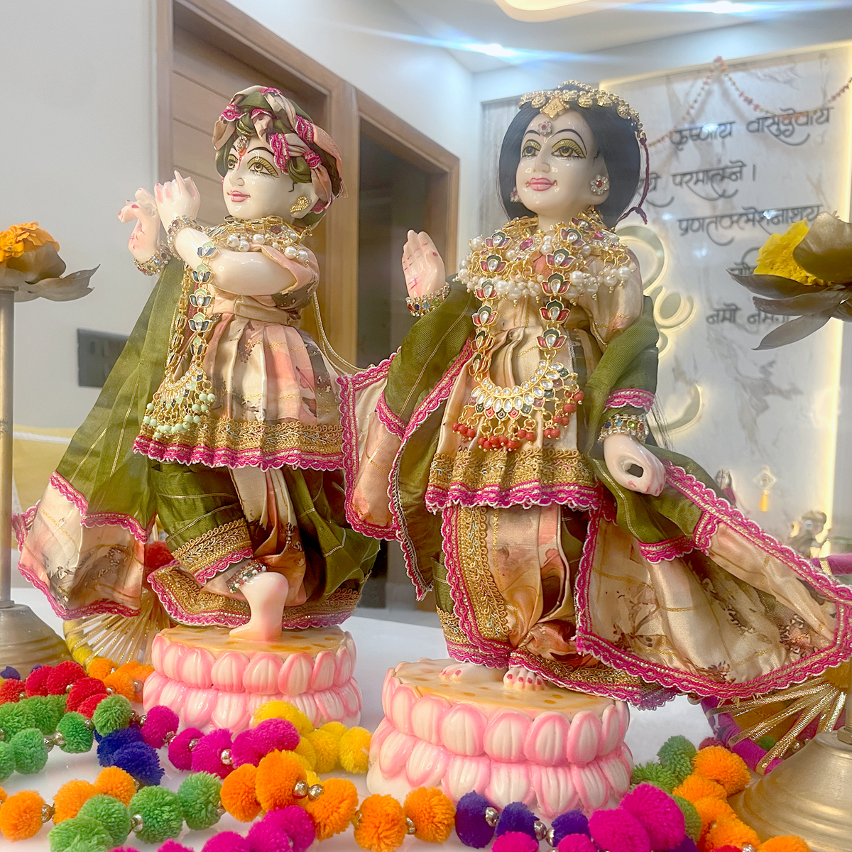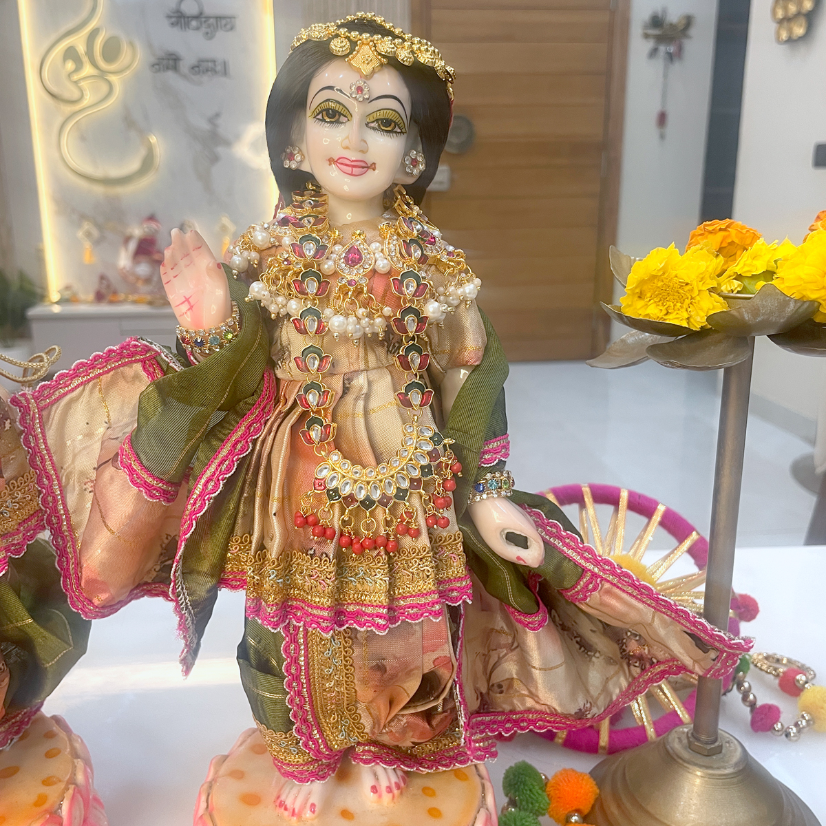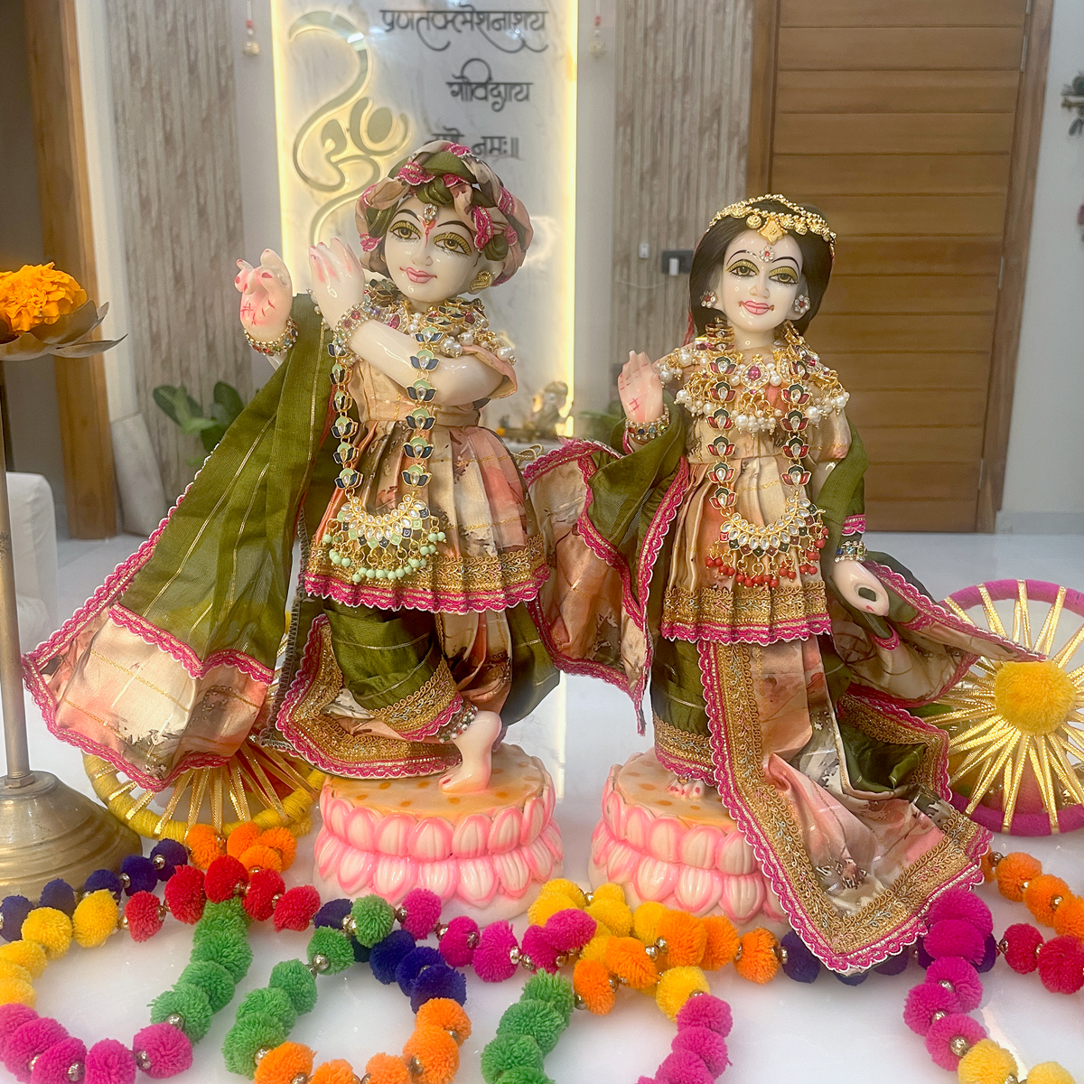 Beautifully designed with artistic prints, fine golden borders, coordinated dupatta styling, and delicate shringar embellishments, this poshak enhances the saumya and rasik swaroop of Shri Shyam and Shrimati Radharani. Perfect for daily darshan, light festive pooja, summer shringar, and peaceful mandir decor, it brings a calm yet festive aura to your sacred space.