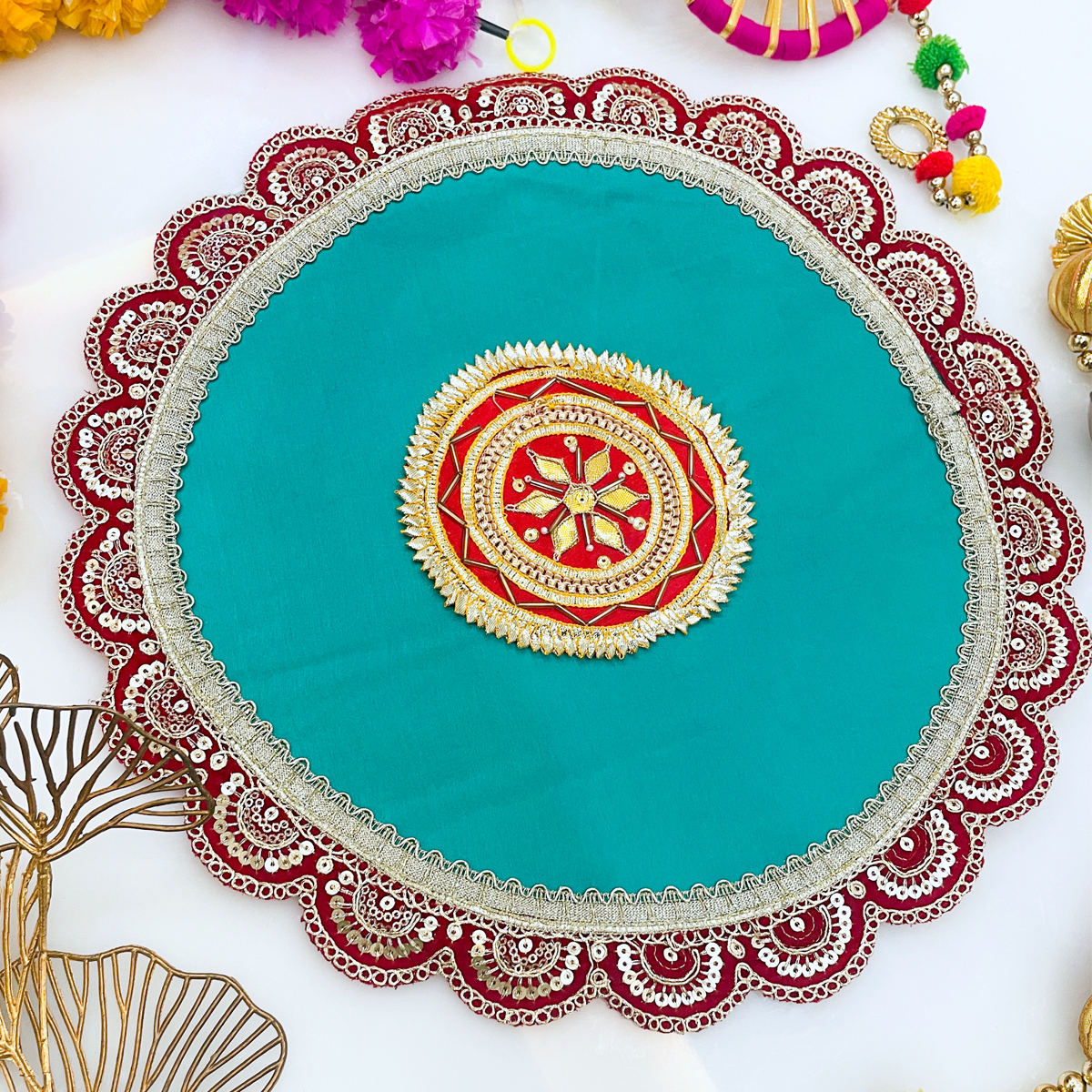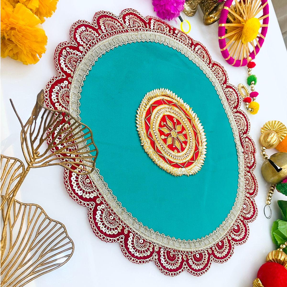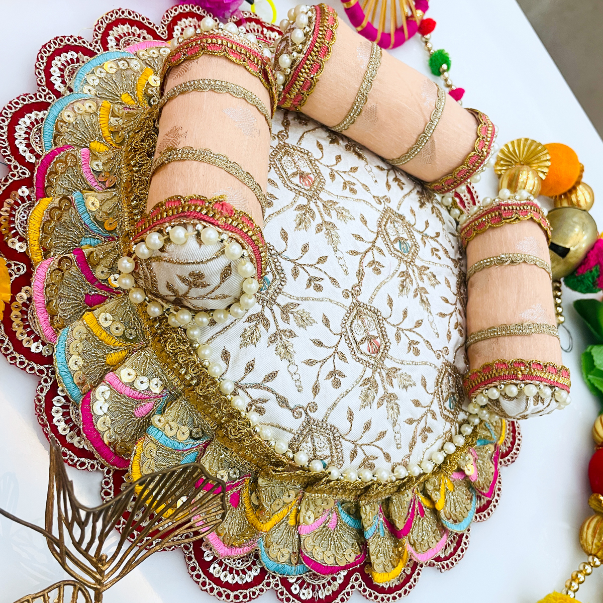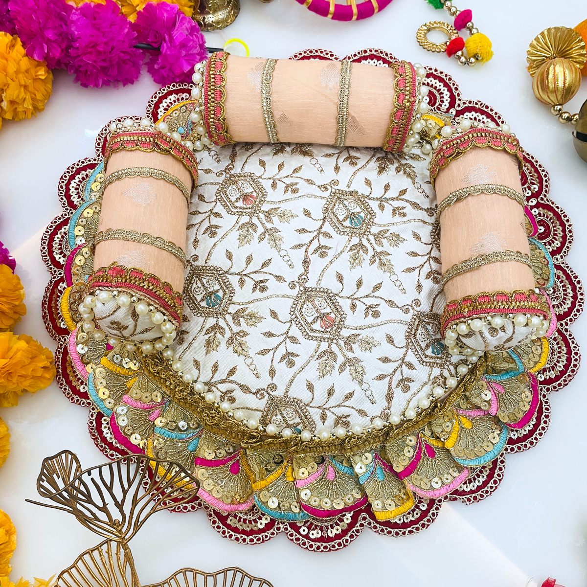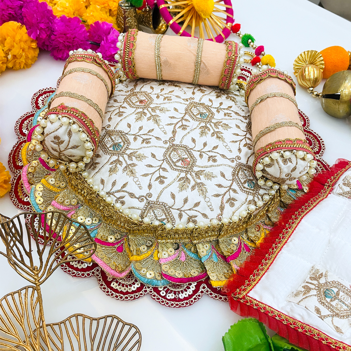Bring timeless royal charm to your sacred rituals with this Maharaja Style Decorative Pooja Asan. Inspired by traditional royal décor, this beautifully handcrafted asan features rich fabric embellished with pearl detailing, and vibrant lace borders.The plush cushioned base offers comfortable seatingfor ladoo gopal.