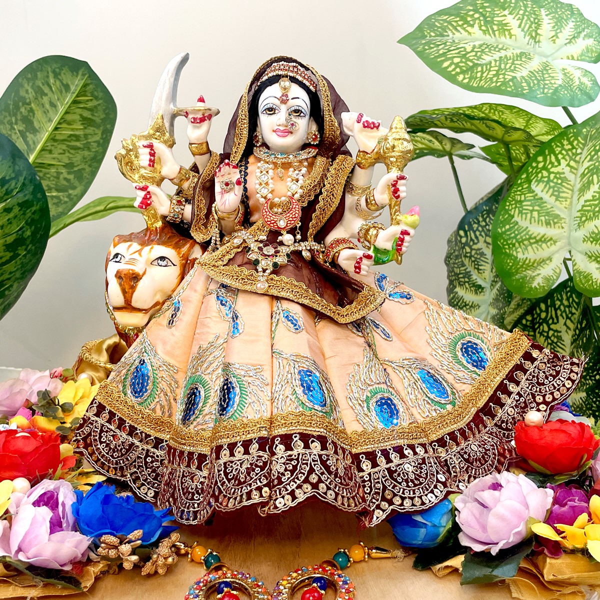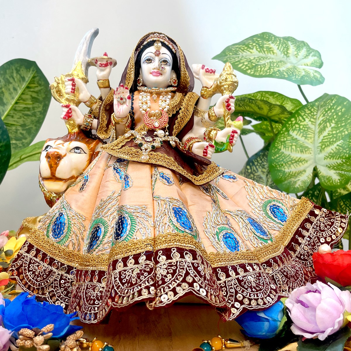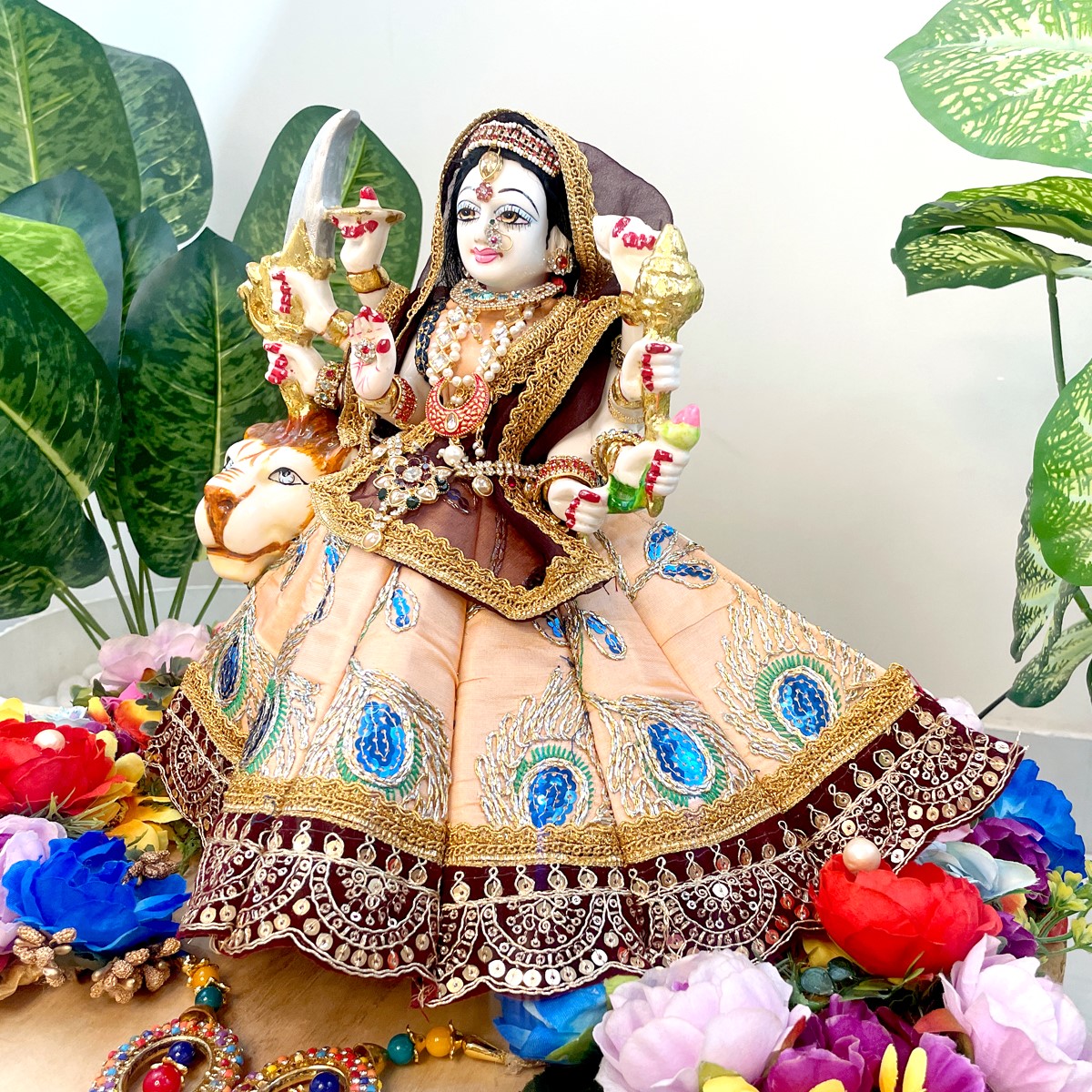 This beautiful Mata Rani poshak comes in a pale orange lehenga adorned with delicate peacock feather motifs, finished with a rich maroon border and lace detailing. The matching blouse in pale orange pairs gracefully with the maroon net dupatta edged in golden lace, giving the outfit a divine and traditional charm.