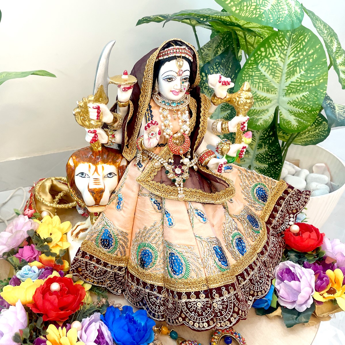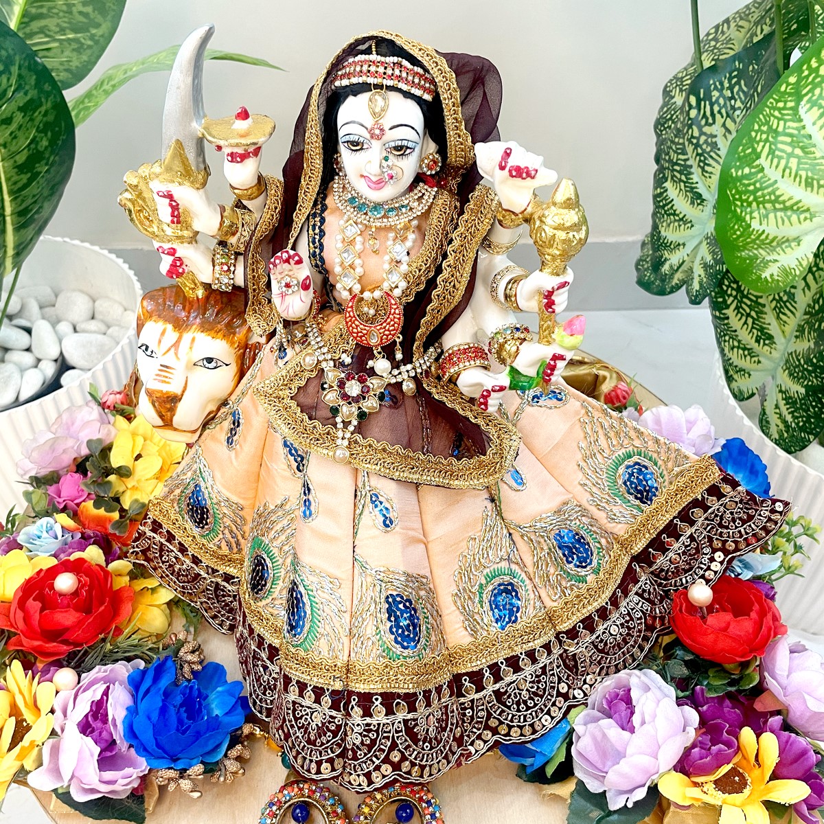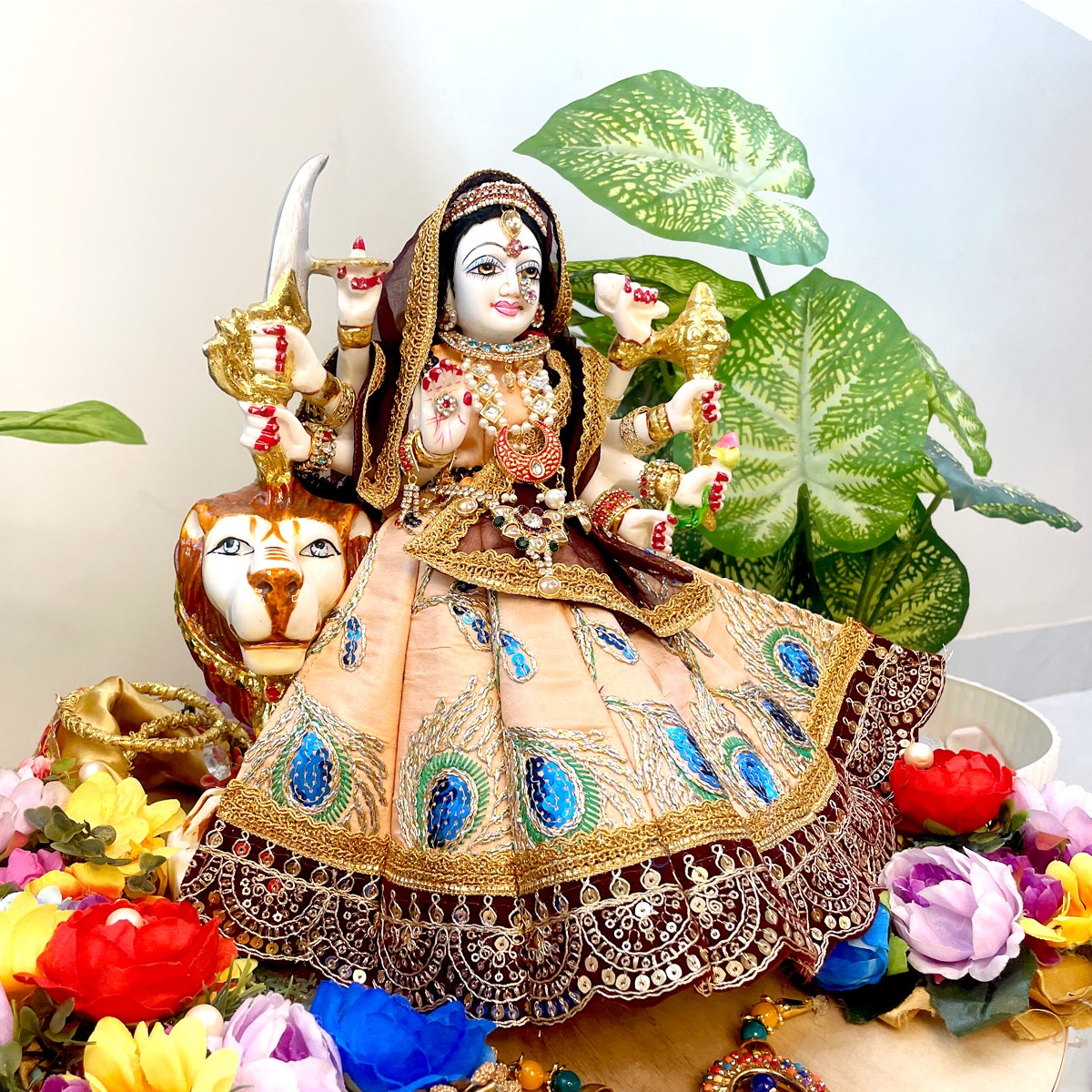 This beautiful Mata Rani poshak comes in a pale orange lehenga adorned with delicate peacock feather motifs, finished with a rich maroon border and lace detailing. The matching blouse in pale orange pairs gracefully with the maroon net dupatta edged in golden lace, giving the outfit a divine and traditional charm.