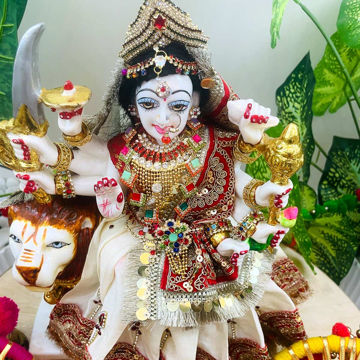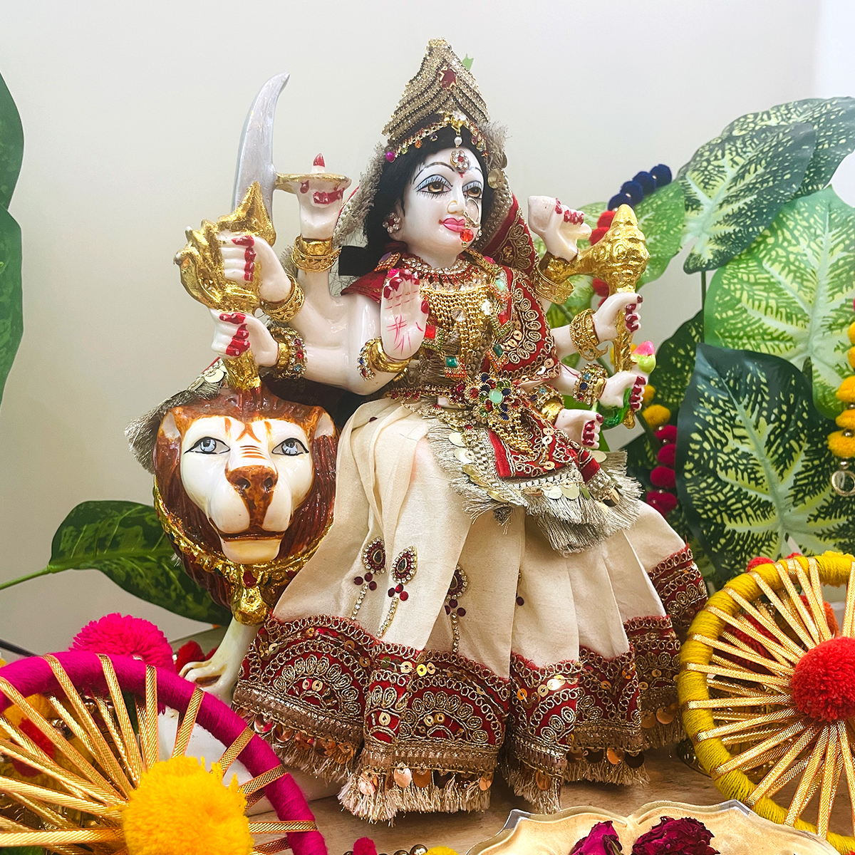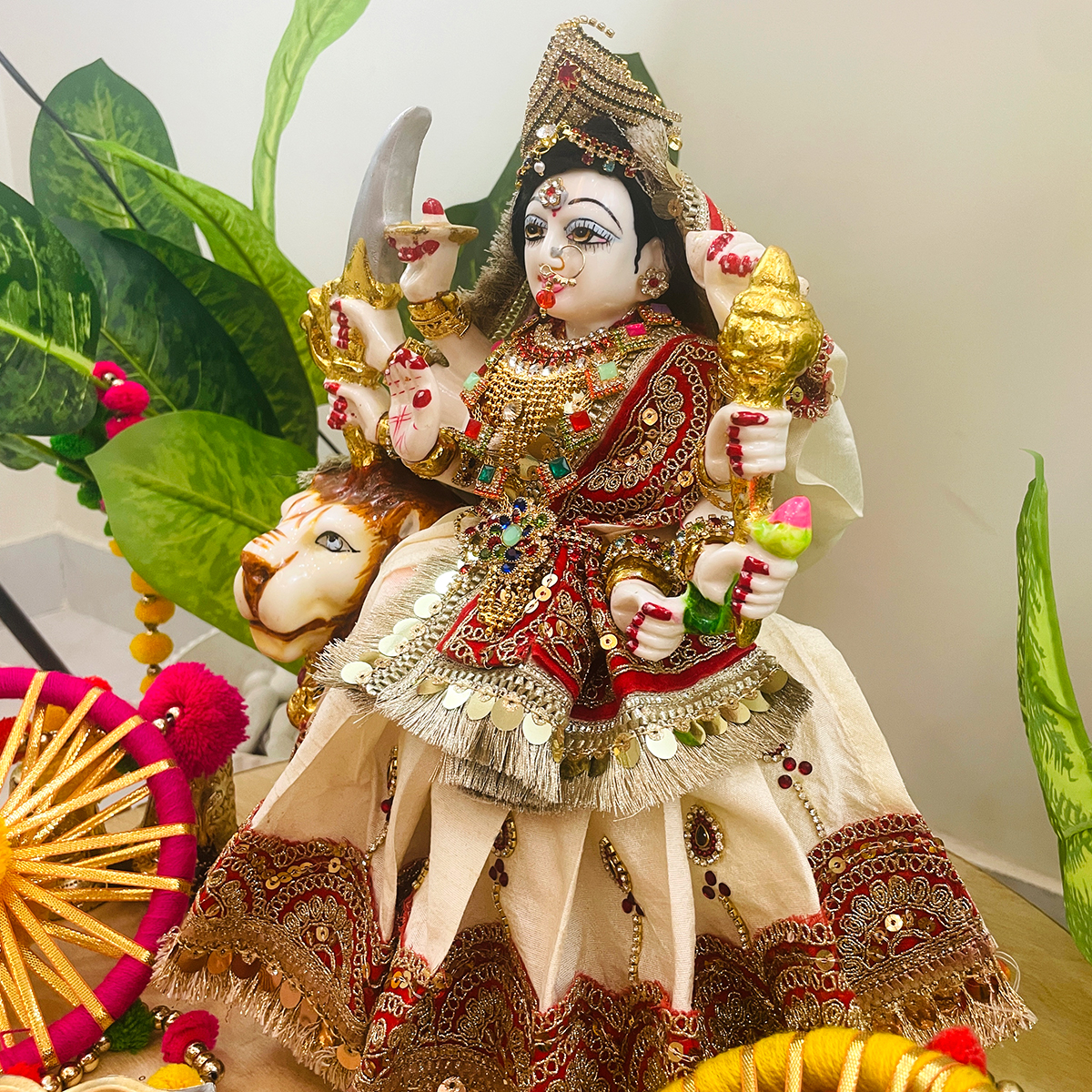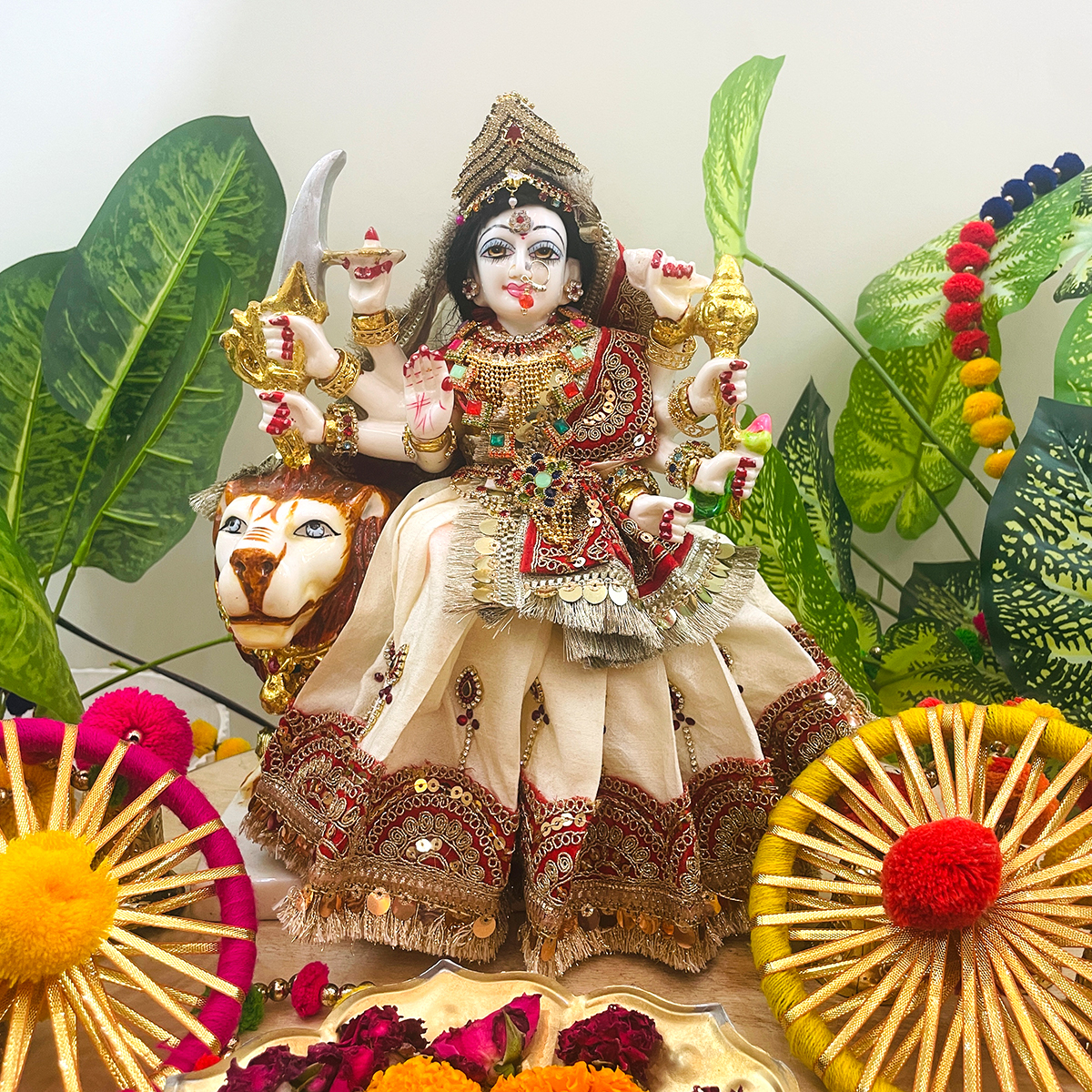 Bring a serene and divine charm to your temple with this beautiful Mata Rani poshak. The outfit features an off-white lehenga adorned with vibrant red and golden lace, symbolizing purity and celebration. It comes with a matching dupatta bordered on all four sides with delicate lace, and a simple blouse that completes the elegant look.