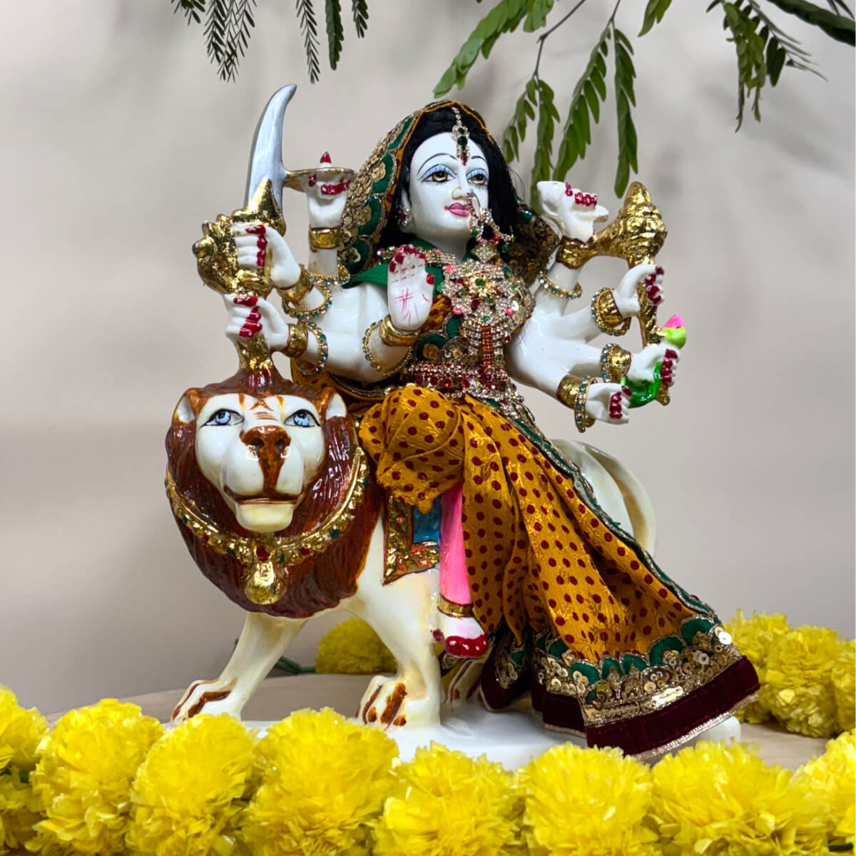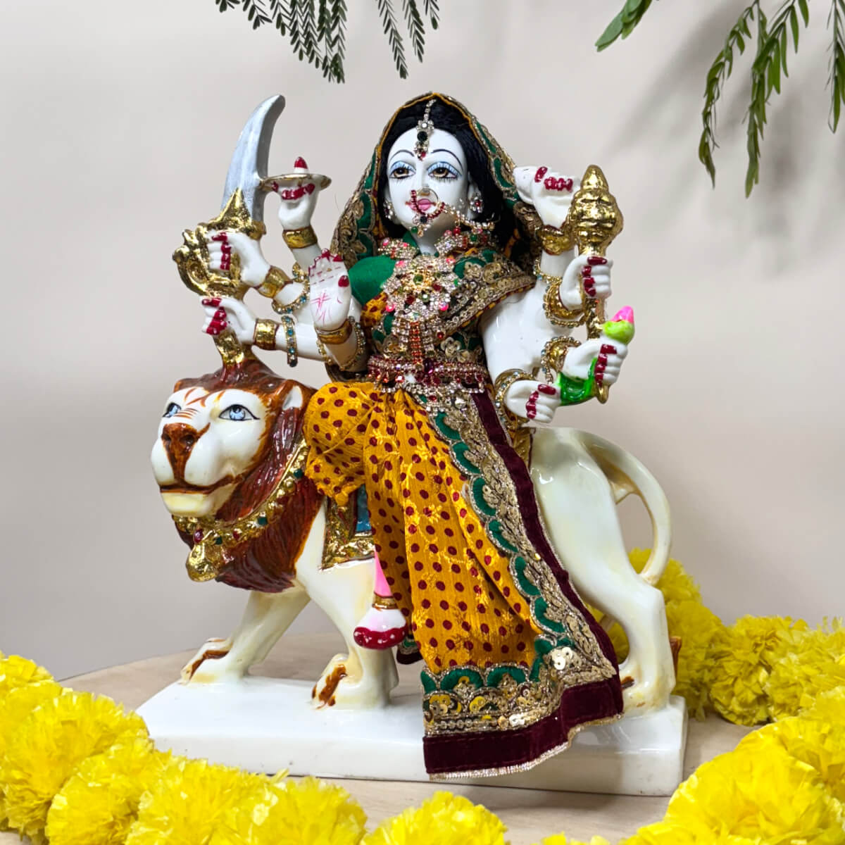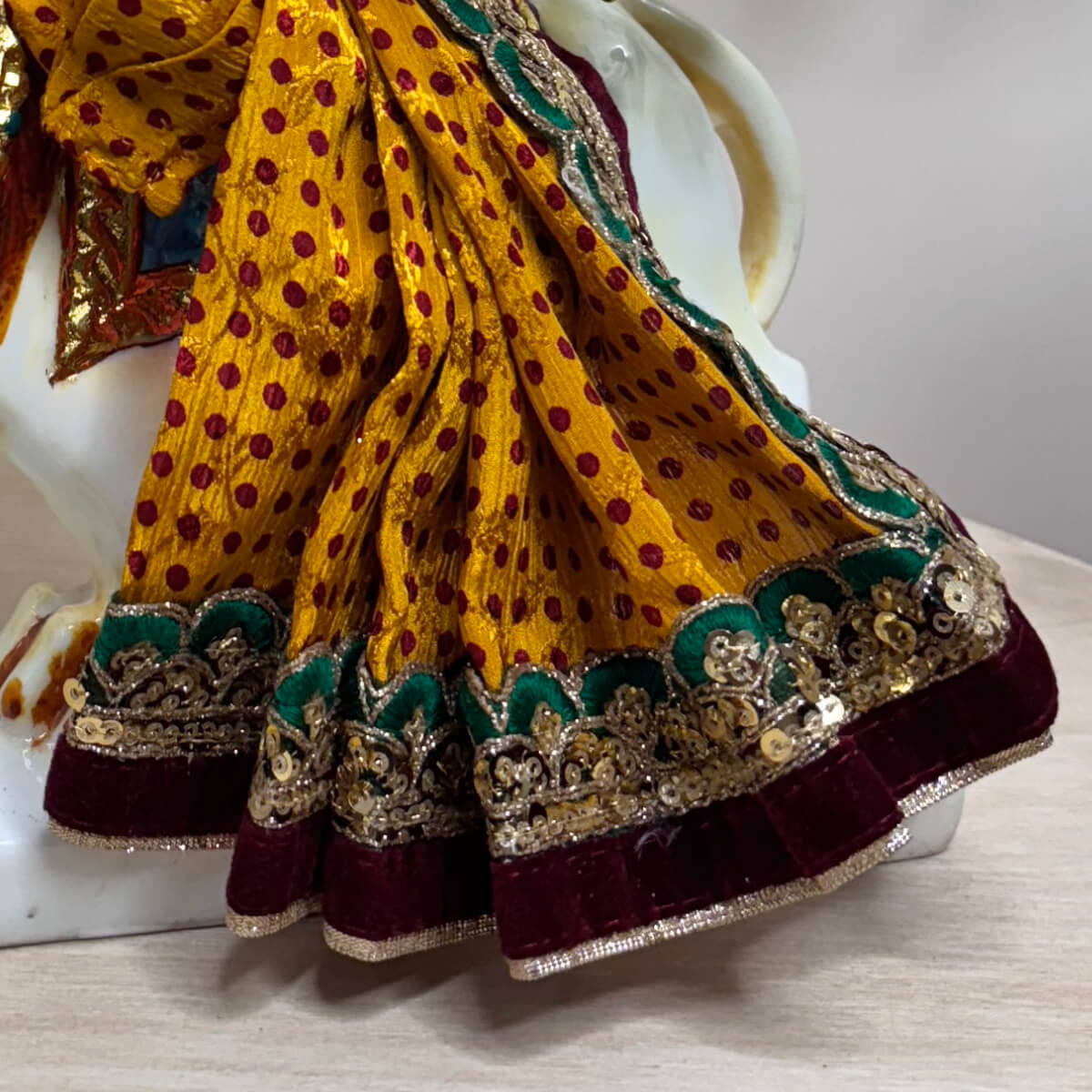 A beautifully adorned idol of Mata Rani dressed in a stunning green and yellow poshak with intricate gold embroidery. The outfit features a rich contrast of vibrant hues, embellished with detailed sequins and beadwork. This divine attire enhances the grace of the idol, making it perfect for Navratri, Durga Puja, and temple decorations.