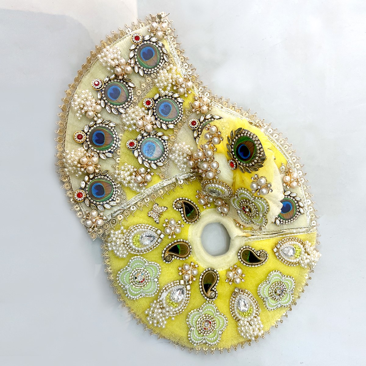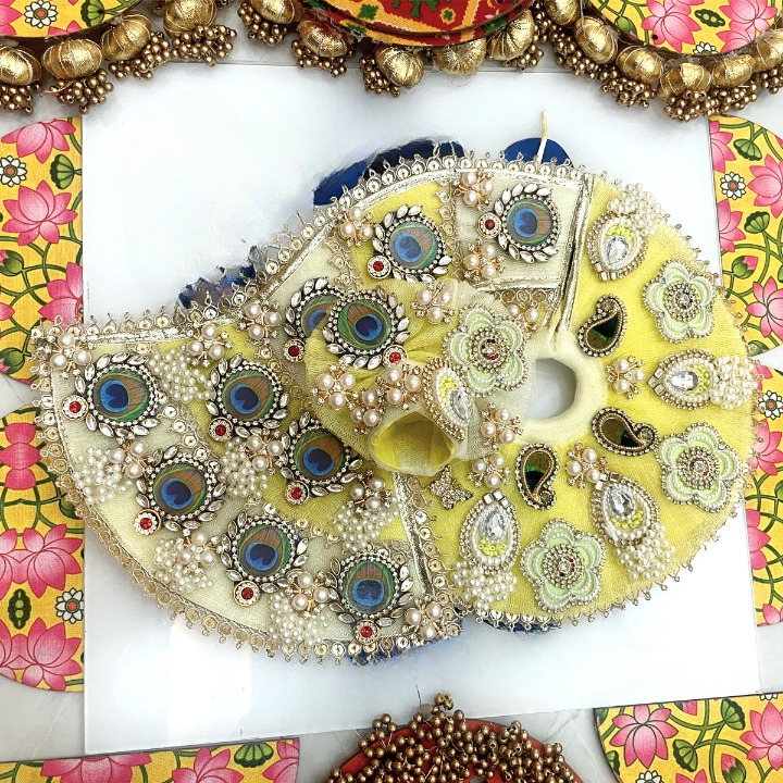 This beautiful yellow dress is specially designed for Bal Gopal, made using soft fabric and decorated with sparkling stones, pearls, and stunning peacock feather motifs. The bright Lemon color adds a divine glow, making it perfect for daily puja or festive occasions. Each detail is thoughtfully crafted to bring out the royal charm of Laddu Gopal’s look.