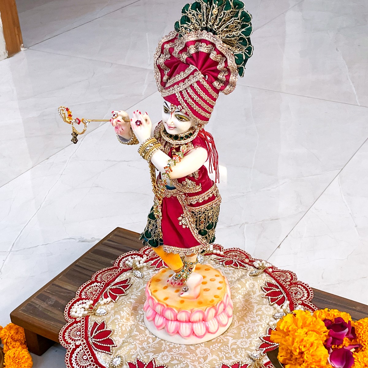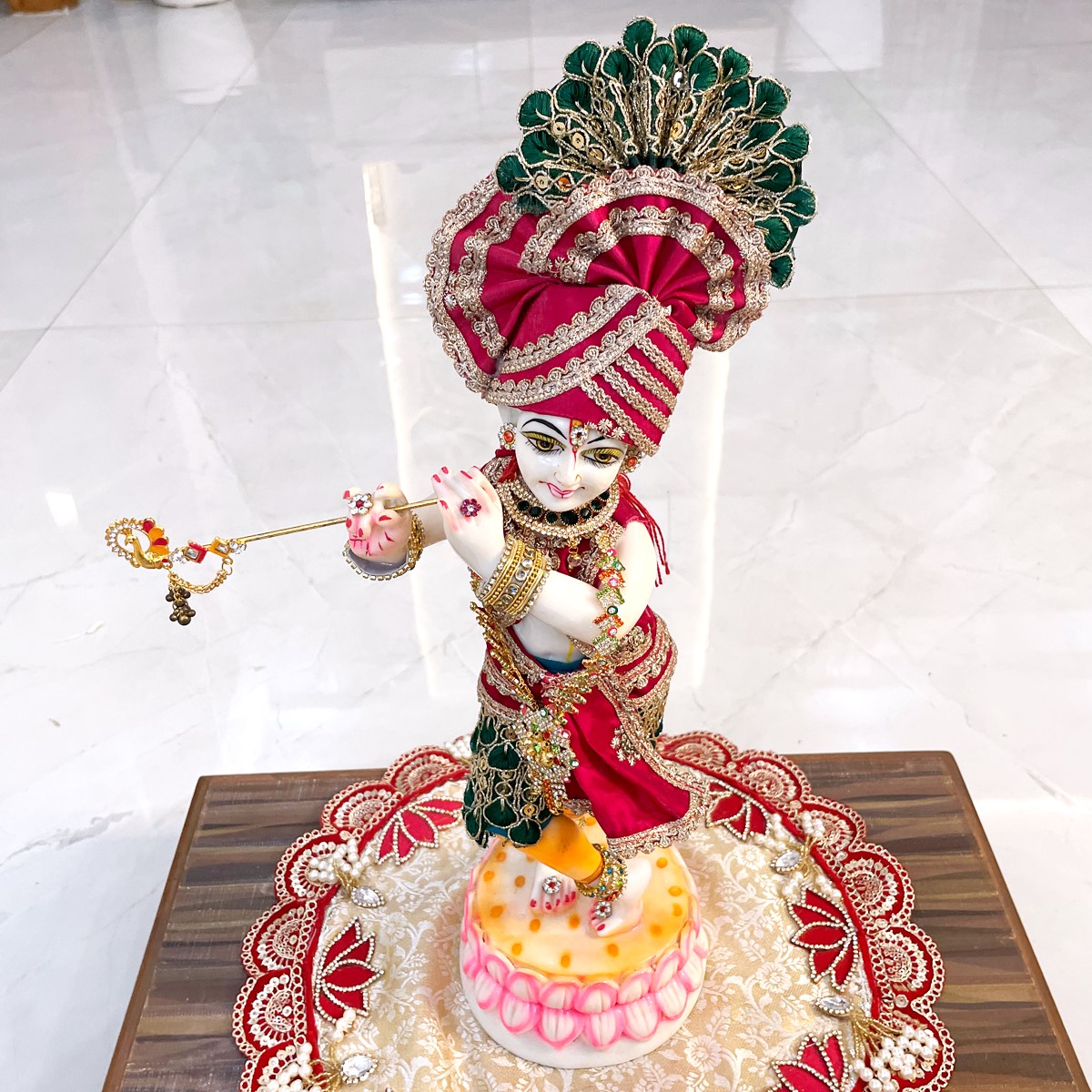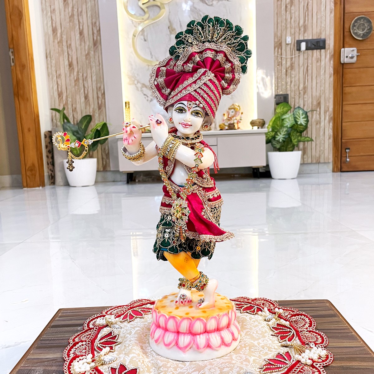 Dress Krishna in this vibrant red and green half dhoti with achkan, capturing the playful charm of Vrindavan. Perfect for festive pooja or decorating your Krishna idol, this set brings tradition, color, and devotion together in one elegant ensemble.