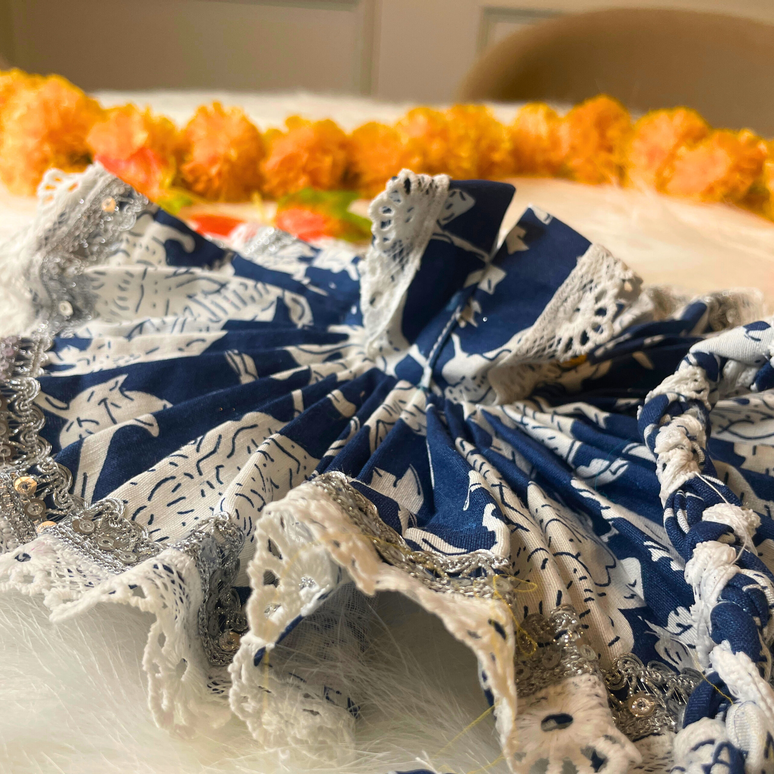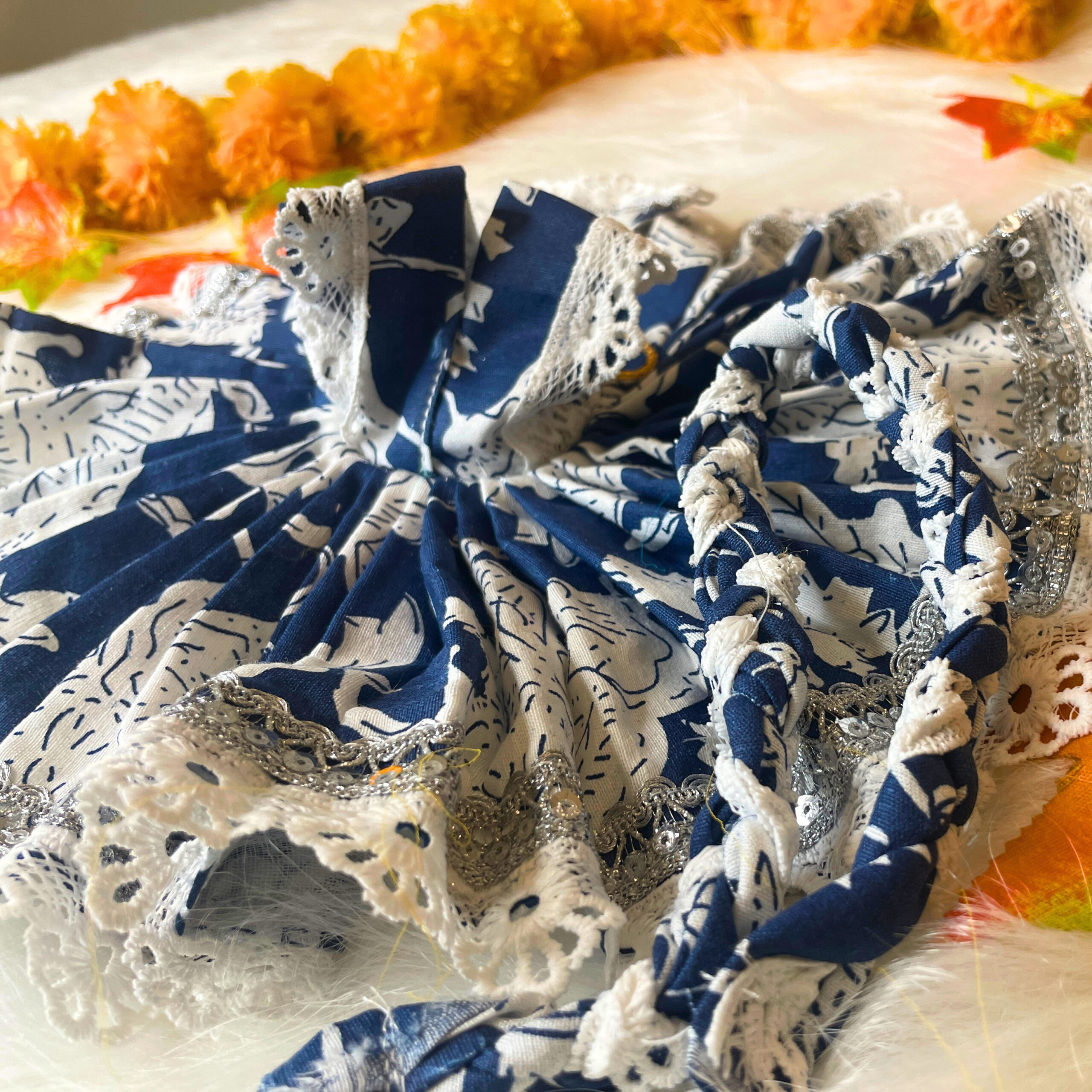This elegant Ladoo Gopal poshak captures the divine charm of Shyam Sundar in soothing shades of blue. The deep neel color reflects Krishna’s infinite sky-like presence—calm, vast, and full of divine mystery. Paired with delicate white lace and subtle sparkle, it brings a perfect balance of simplicity and grace.