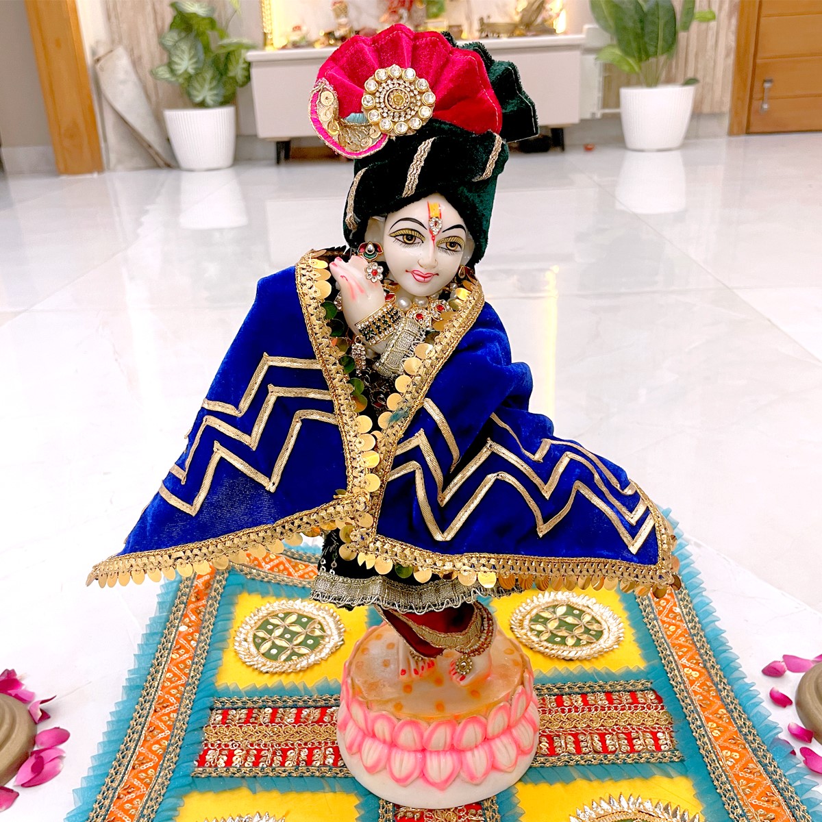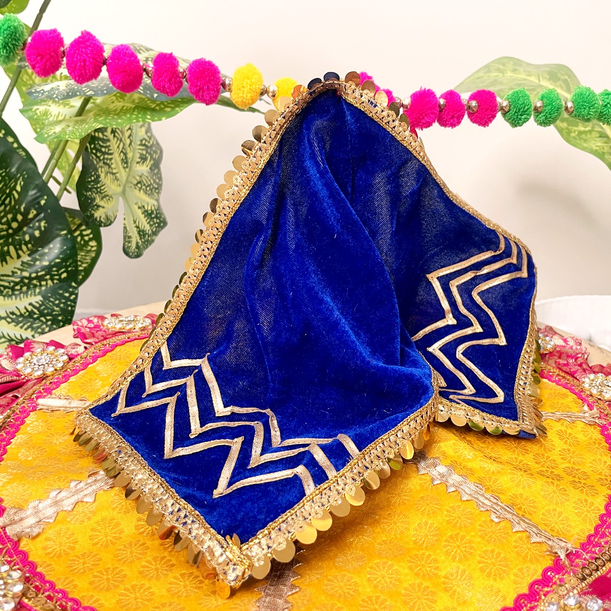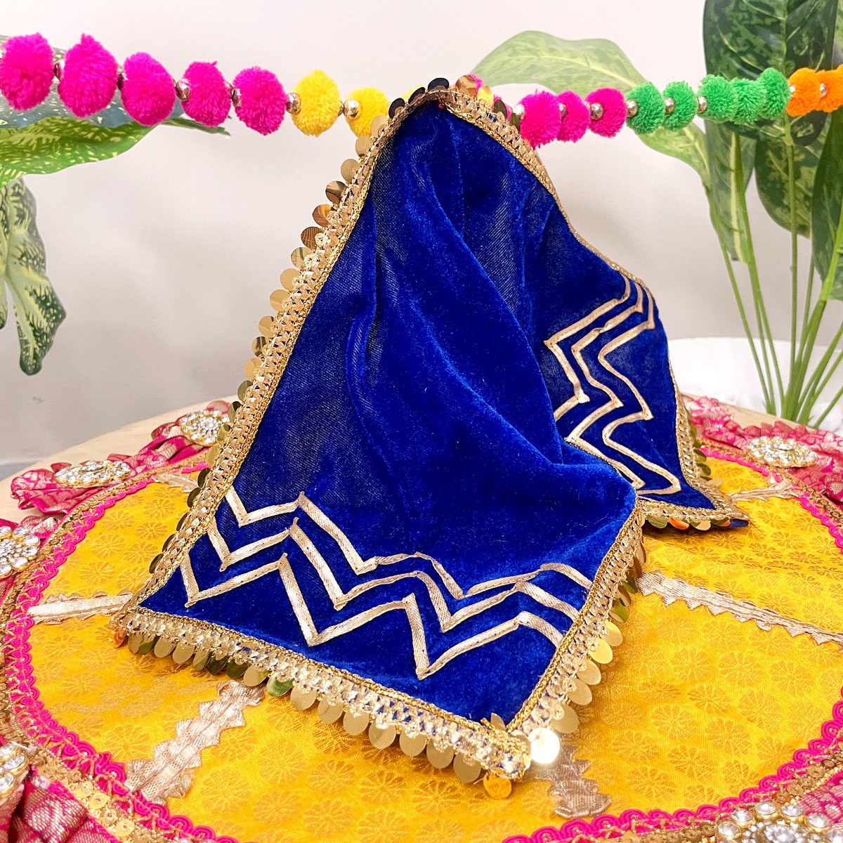 This single-piece blue velvet shawl adds a warm and elegant touch to your deity’s winter look. The soft fabric drapes smoothly, keeping your Thakur ji cozy in the cold season. Golden lace on all four sides brings a traditional temple charm, making it perfect for daily darshan or festive dressing. A simple, beautiful winter cover to adorn your beloved deity.