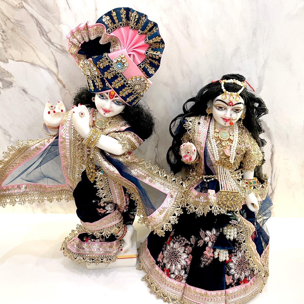 This beautiful “Nilanjana Poshak” is a special blue velvet outfit for your Radha and Krishna idols. For Radha ji, it has a blue lehenga with flower designs and a pink border, a pink and golden blouse, and a blue net dupatta. For Krishna ji, it includes a blue dhoti with flowers design, a pink achkan, and a blue net scarf. It is a lovely set to dress your divine idols for worship and festivals.