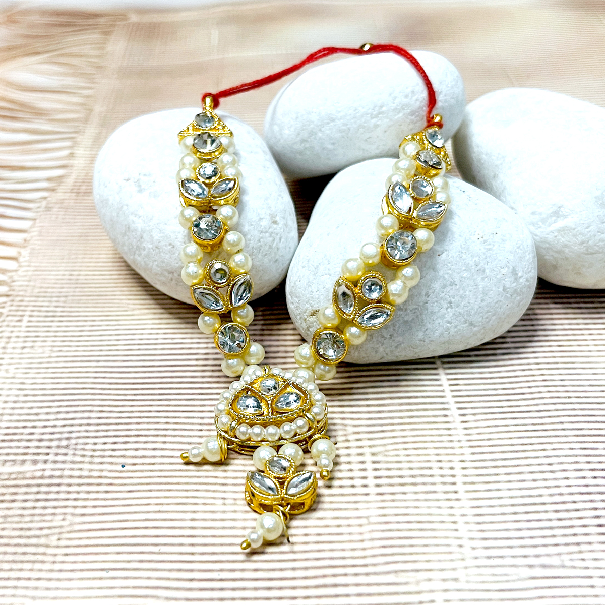 Grace your revered deities with the luminous elegance of our ‘Prabha Haar,’ a beautiful necklace designed to radiate divine charm. This exquisite ‘haar’ features delicate strings of shimmering pearls, intricately interspersed with sparkling clear stones in a classic, Kundan-inspired setting. The central medallion, adorned with additional pearls and dazzling clear gems, adds a focal point of unparalleled beauty. Perfect for adorning idols during daily worship, festivals, or special occasions, this necklace embodies purity and traditional grandeur. Suitable for idols typically ranging from 7 to 9 inches.