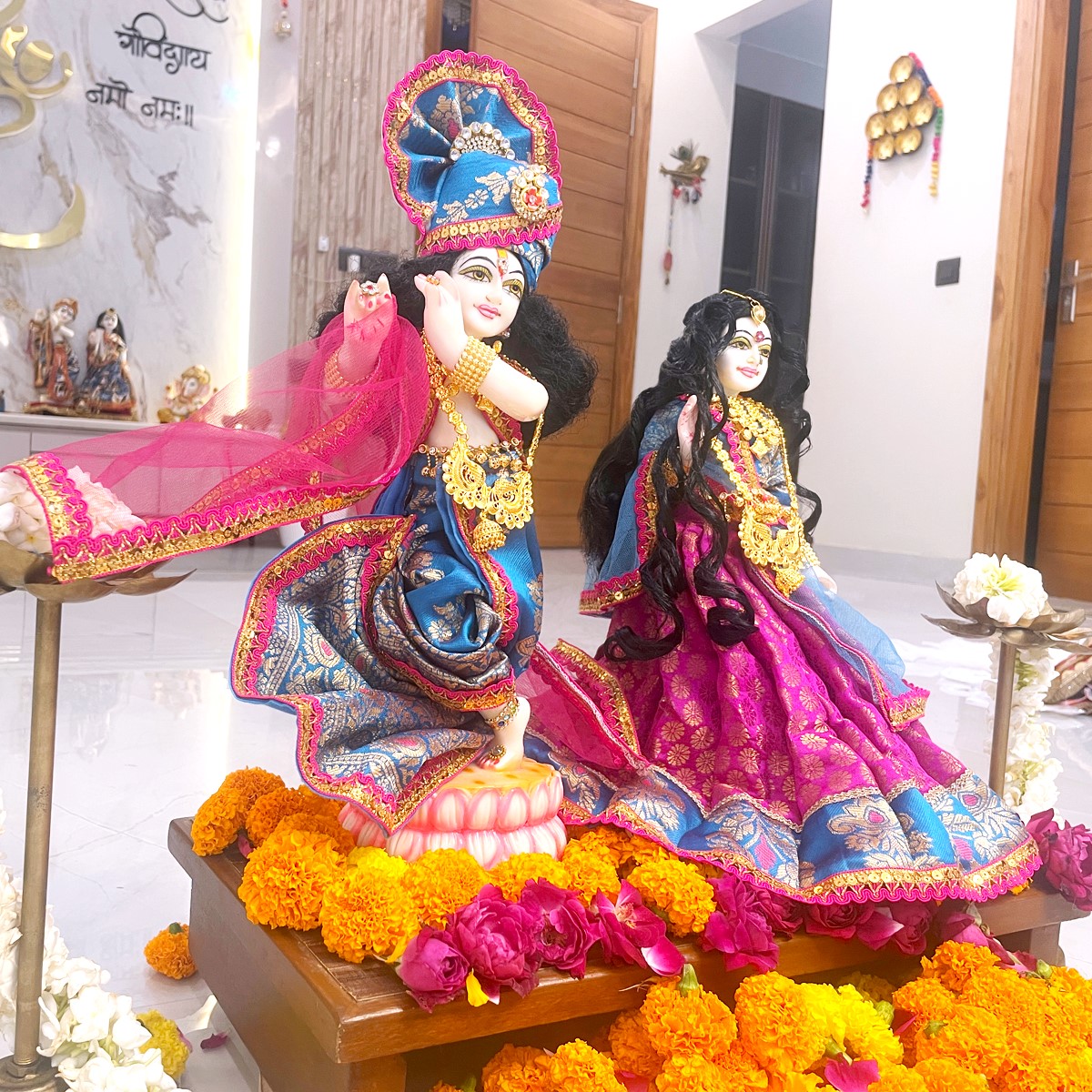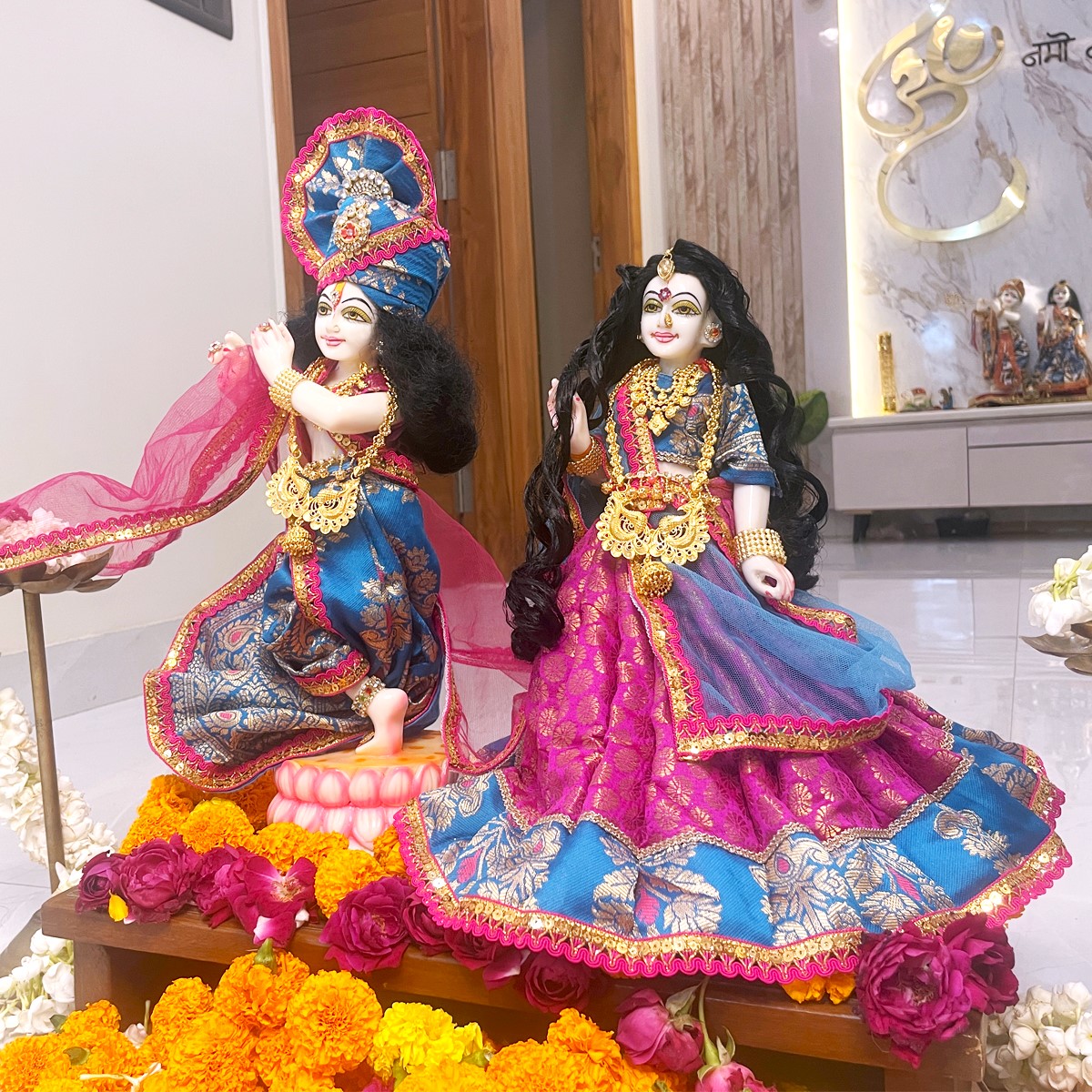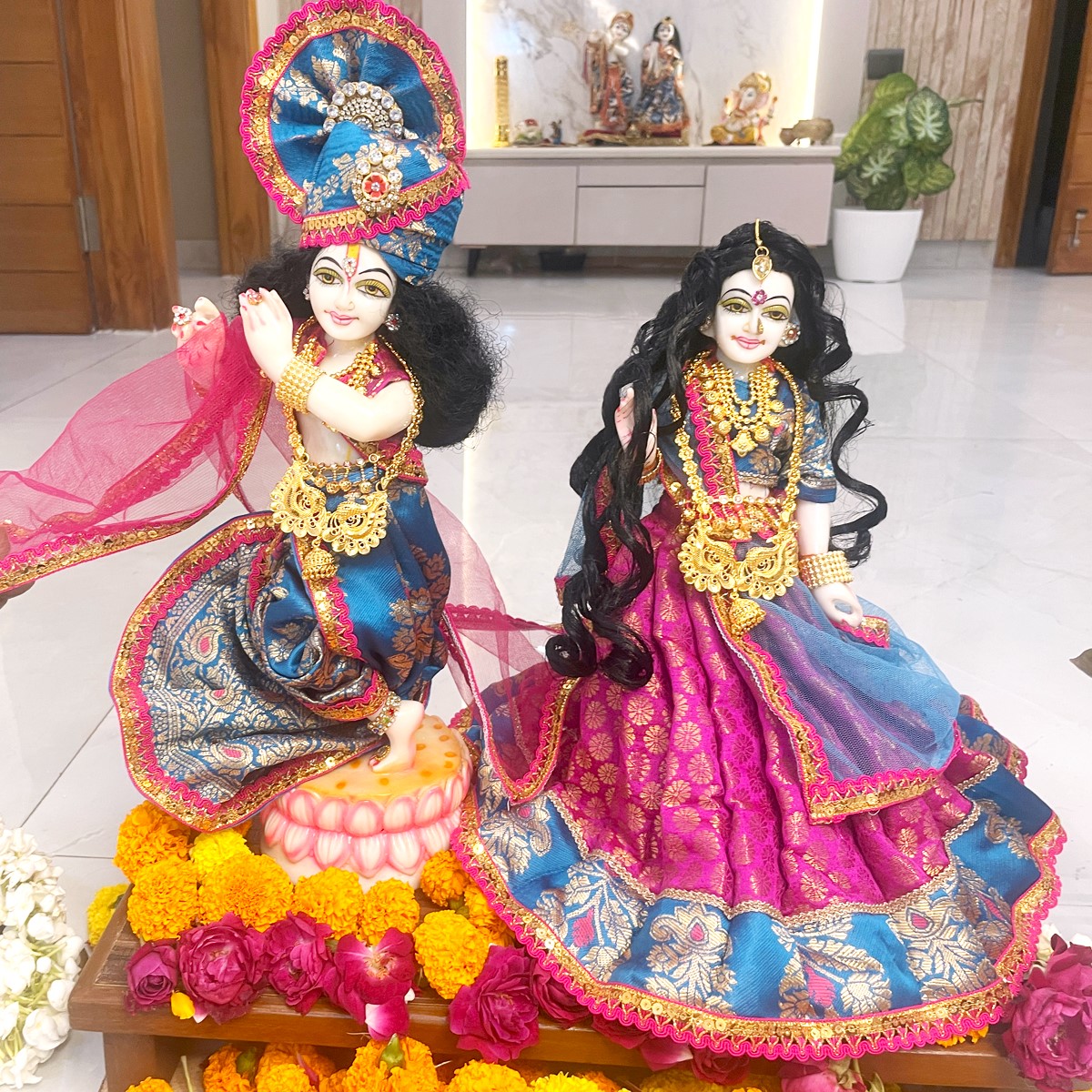 This Radha Krishna dress set is crafted in beautiful pink and blue shades, giving a divine and graceful look. Radha Rani’s outfit comes with a pink lehenga featuring a blue border, a matching blouse, and a delicate net dupatta. Krishna ji is dressed in a traditional blue dhoti with achkan and a pink angvastram that adds a royal touch.
