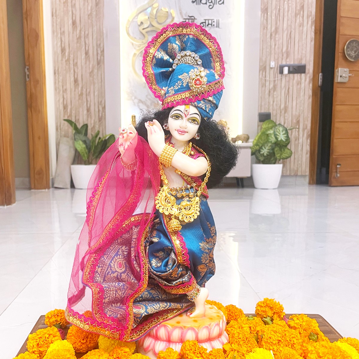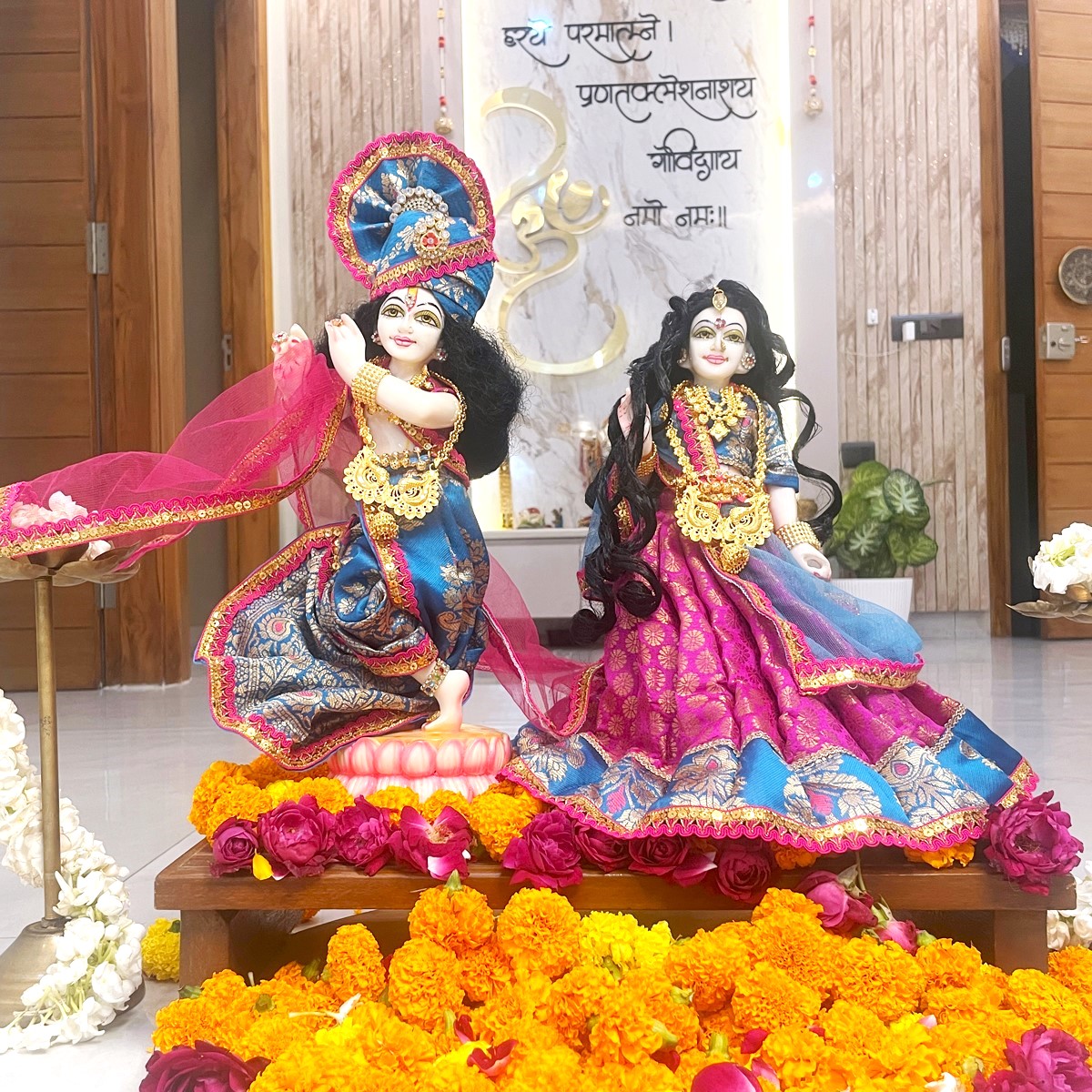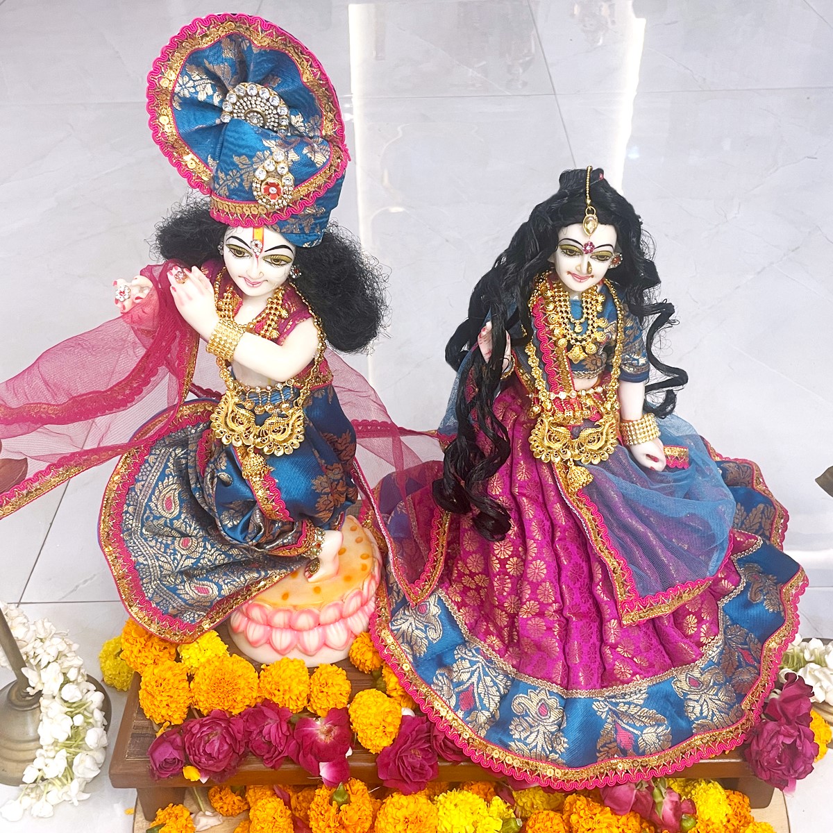 This Radha Krishna dress set is crafted in beautiful pink and blue shades, giving a divine and graceful look. Radha Rani’s outfit comes with a pink lehenga featuring a blue border, a matching blouse, and a delicate net dupatta. Krishna ji is dressed in a traditional blue dhoti with achkan and a pink angvastram that adds a royal touch.