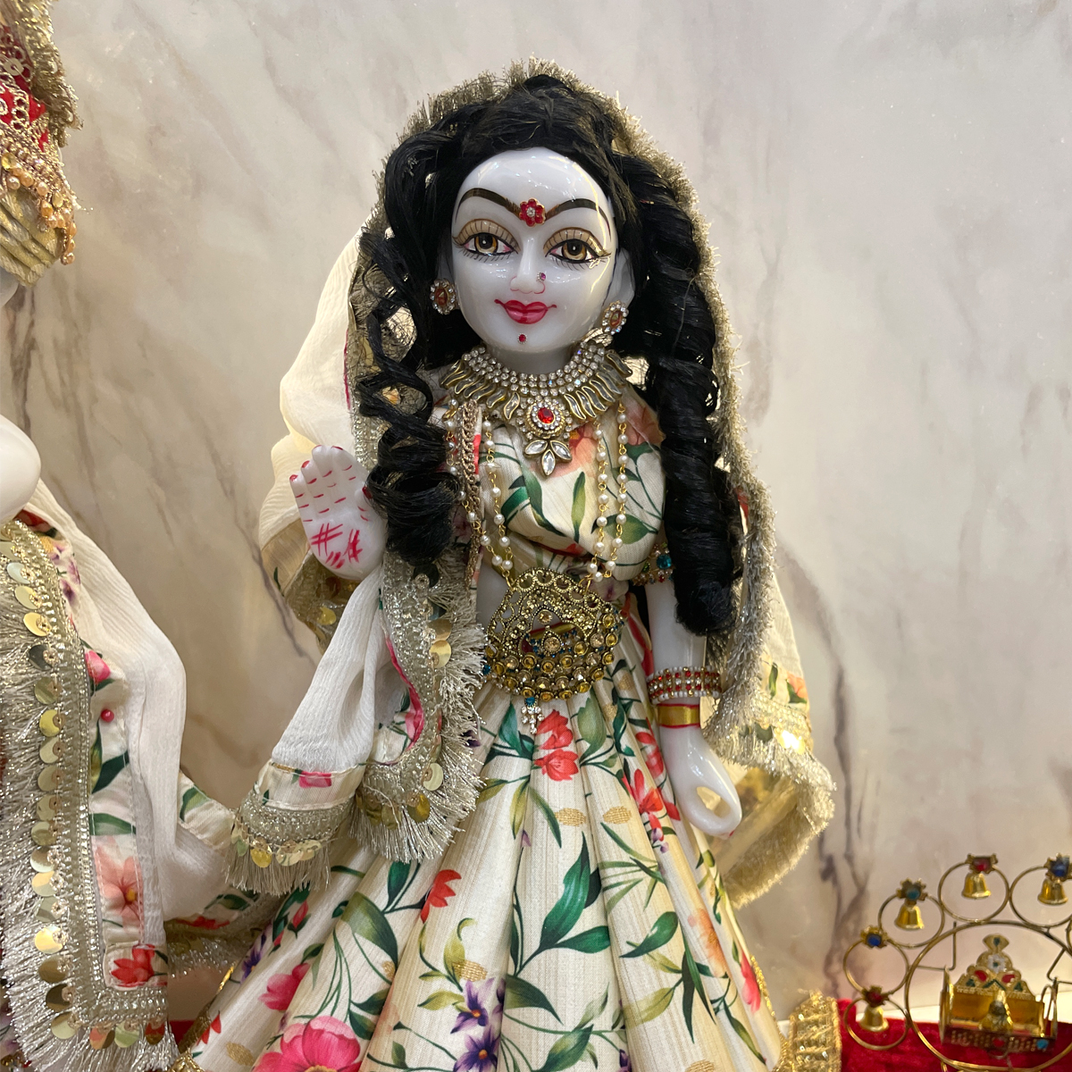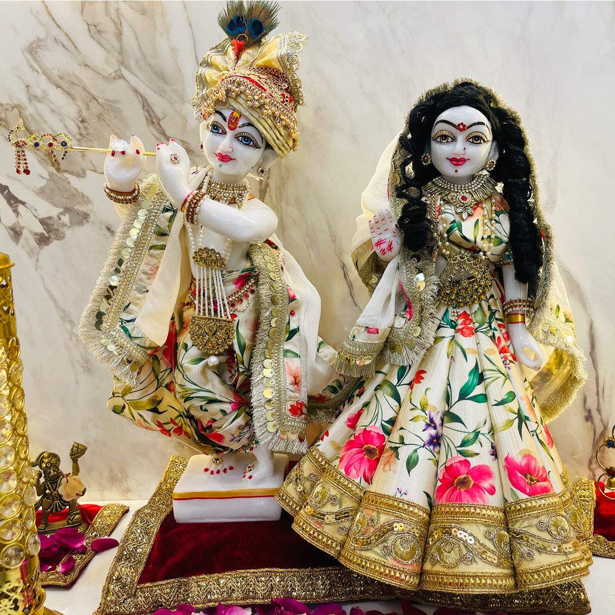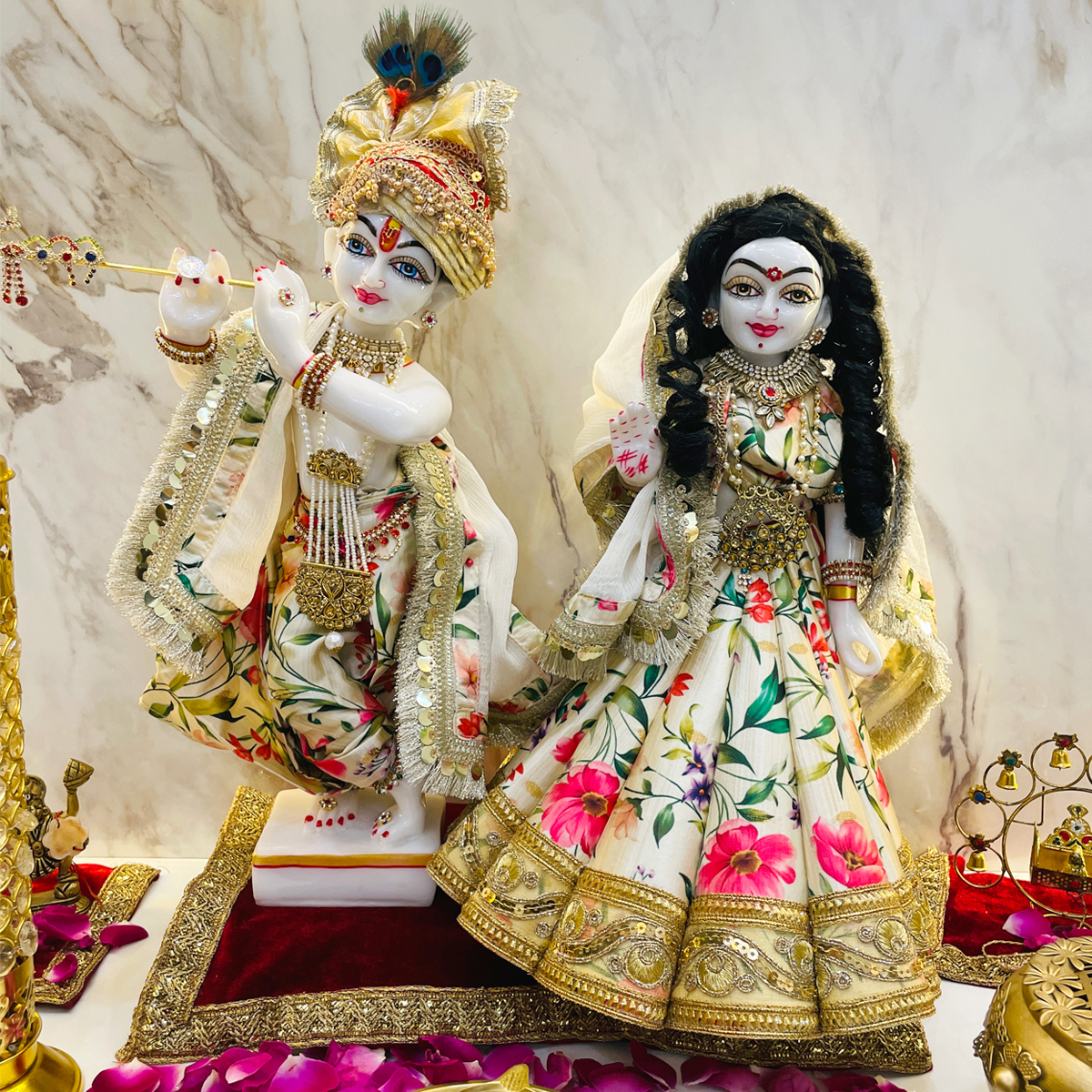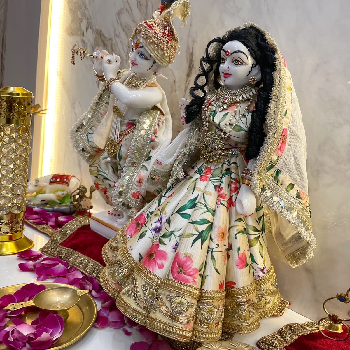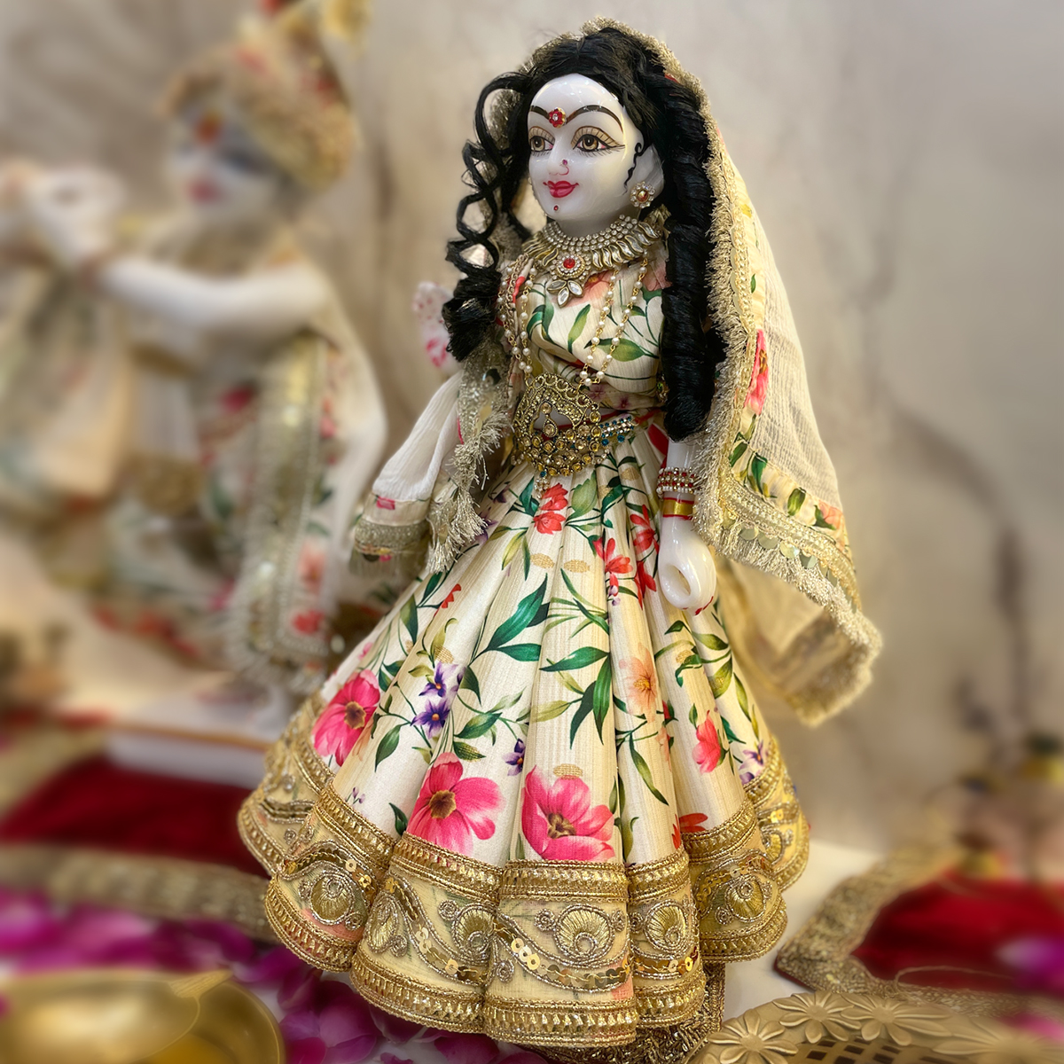 Serenity of Vrindavan with our Pushp Vaatika Poshak, a beautifully crafted floral set designed for Kanha Ji and Radha Ji. Radha Rani’s attire features a soft floral-printed lehenga paired with a plain dupatta, delicately finished with lace borders, adding a touch of elegance and grace. Kanha Ji’s look is completed with a matching floral dhoti and pagdi, along with a complementing dupatta that reflects divine charm.