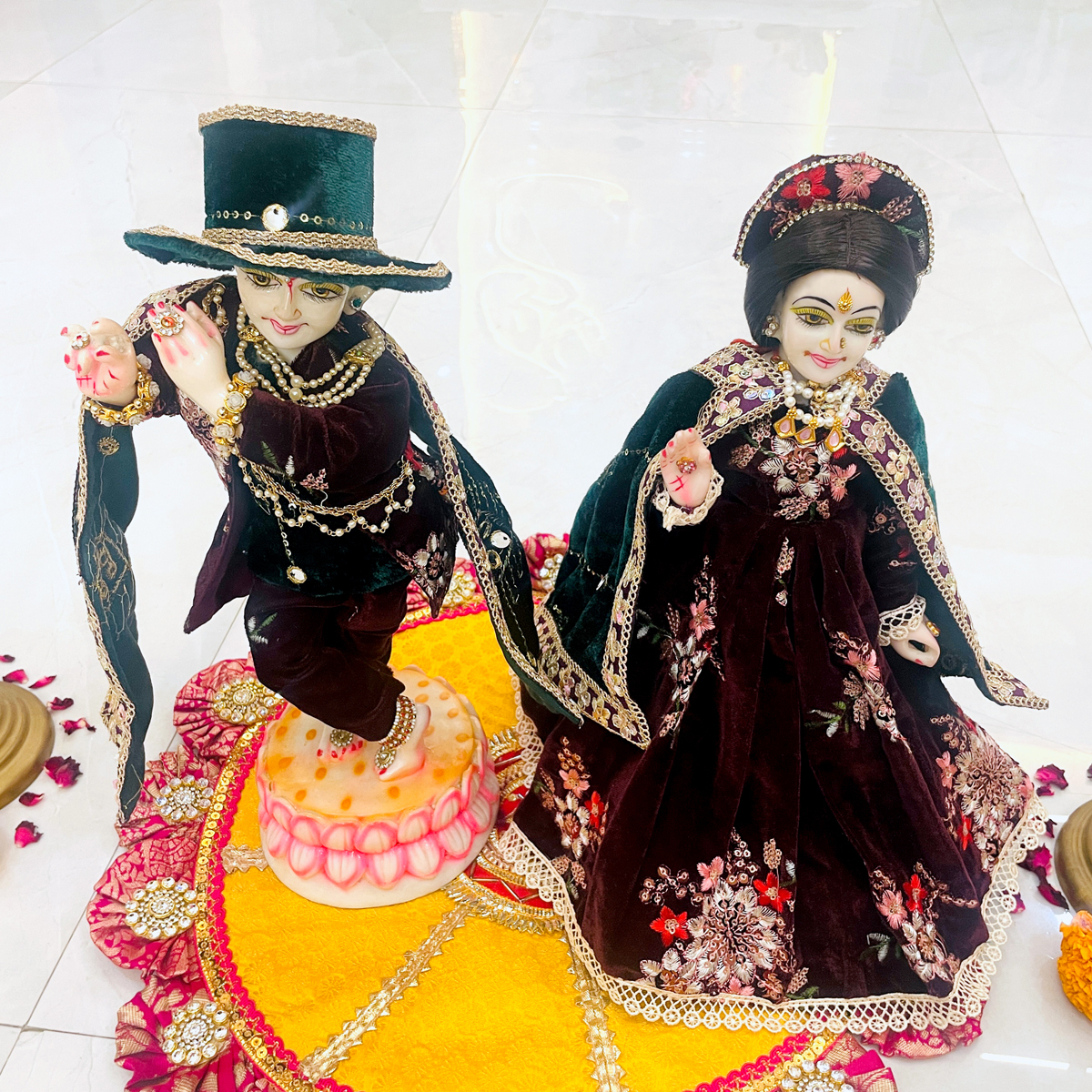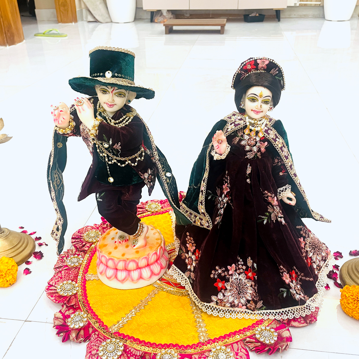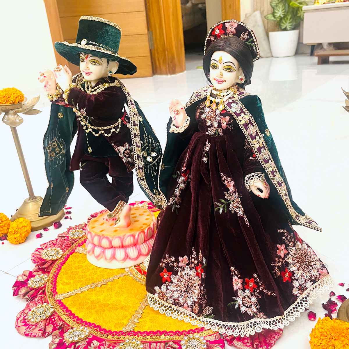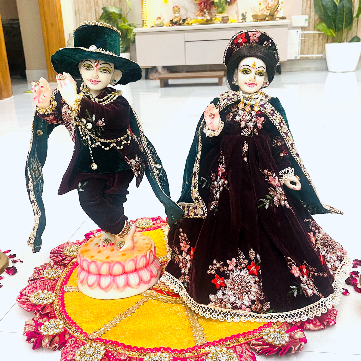 This beautiful winter poshak is made from soft velvet fabric, perfect for the cold season. The deep maroon and green shades bring a royal charm to Radha and Krishna’s divine look. Radha Ji’s gown-style attire with matching dupatta reflects grace, while Krishna Ji’s kurta and pant set adds a regal touch. Designed with devotion and elegance, this set keeps your deities warm and beautifully dressed through winter.