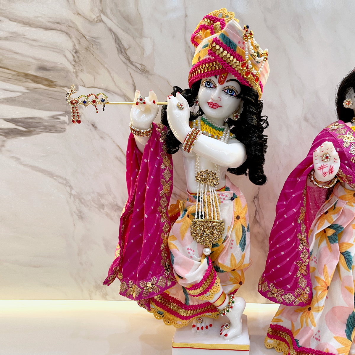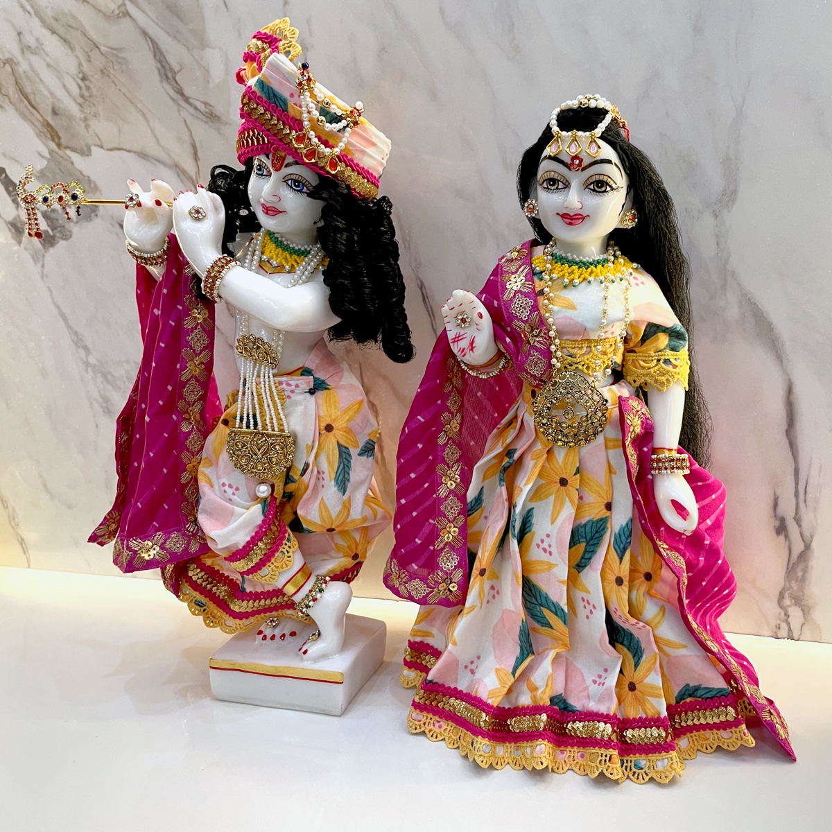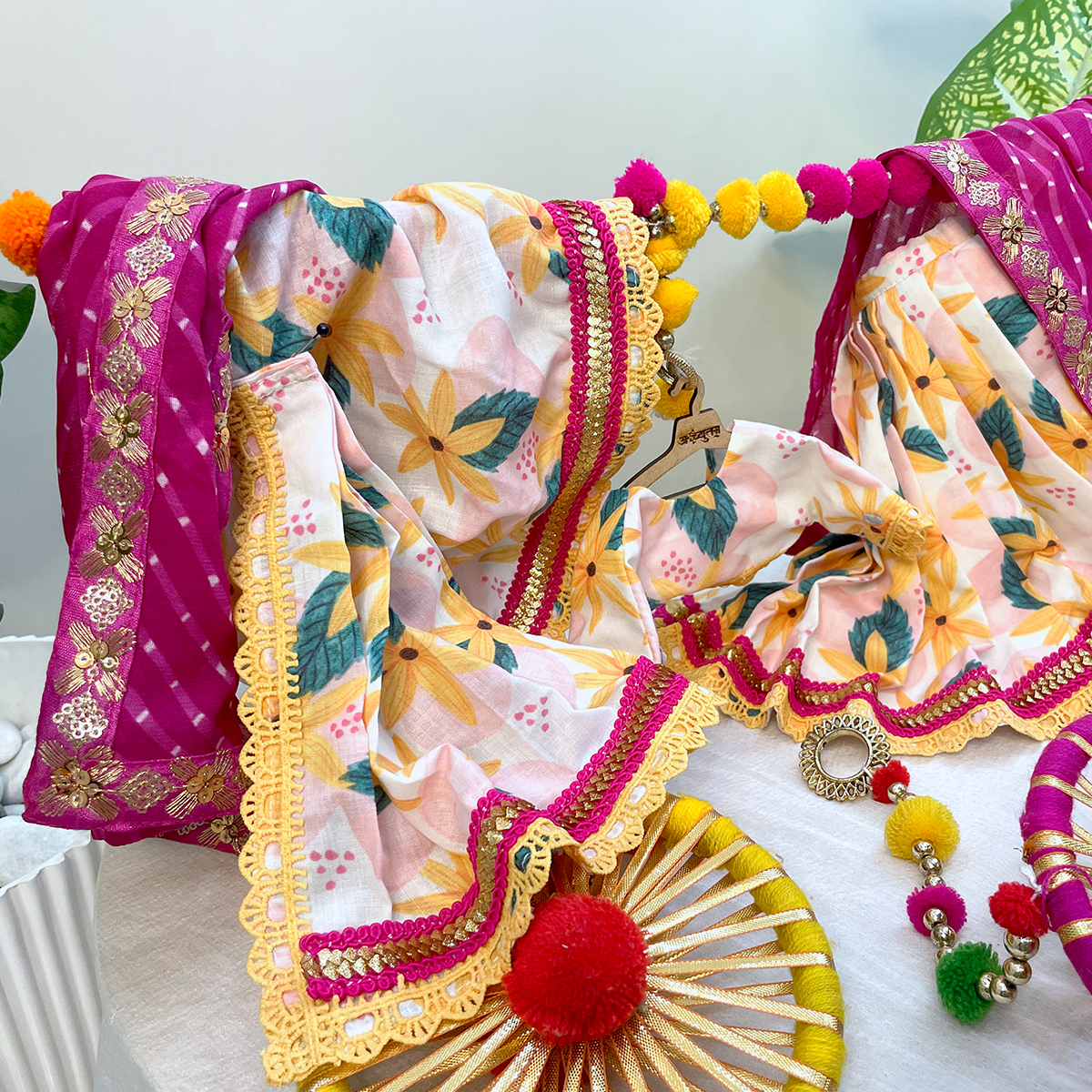 Thakur ji’s dress includes a matching floral dhoti, pink angvastram, and a coordinated floral pagdi.