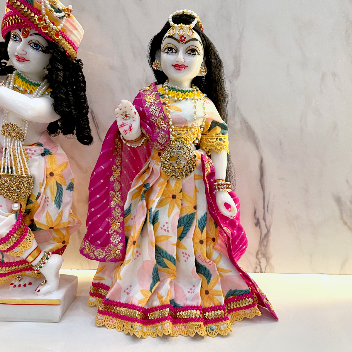 Radha Rani’s outfit features a white lehenga and blouse with yellow and pink floral prints, paired with a vibrant pink dupatta finished with lace work.