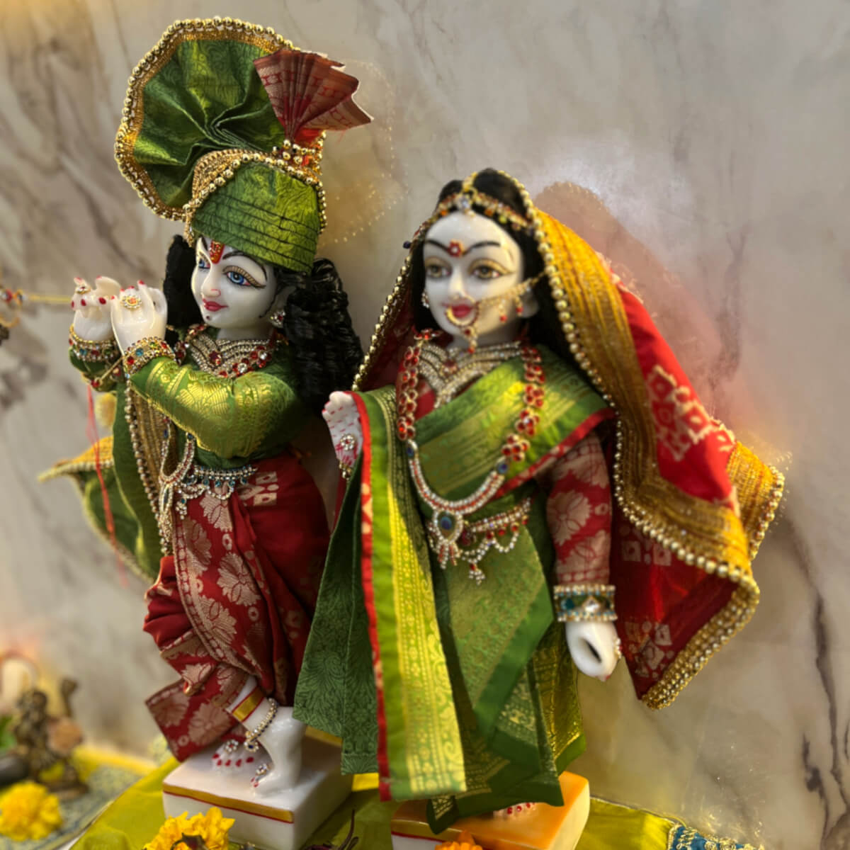 A stunning Radha Krishna idol dressed in an elegant red and green Banarasi poshak with intricate gold embroidery and pearl embellishments. Krishna’s attire includes a traditional turban and flute, while Radha’s outfit is gracefully draped with a beautifully detailed dupatta. Perfect for Janmashtami, festive worship, and temple decor.