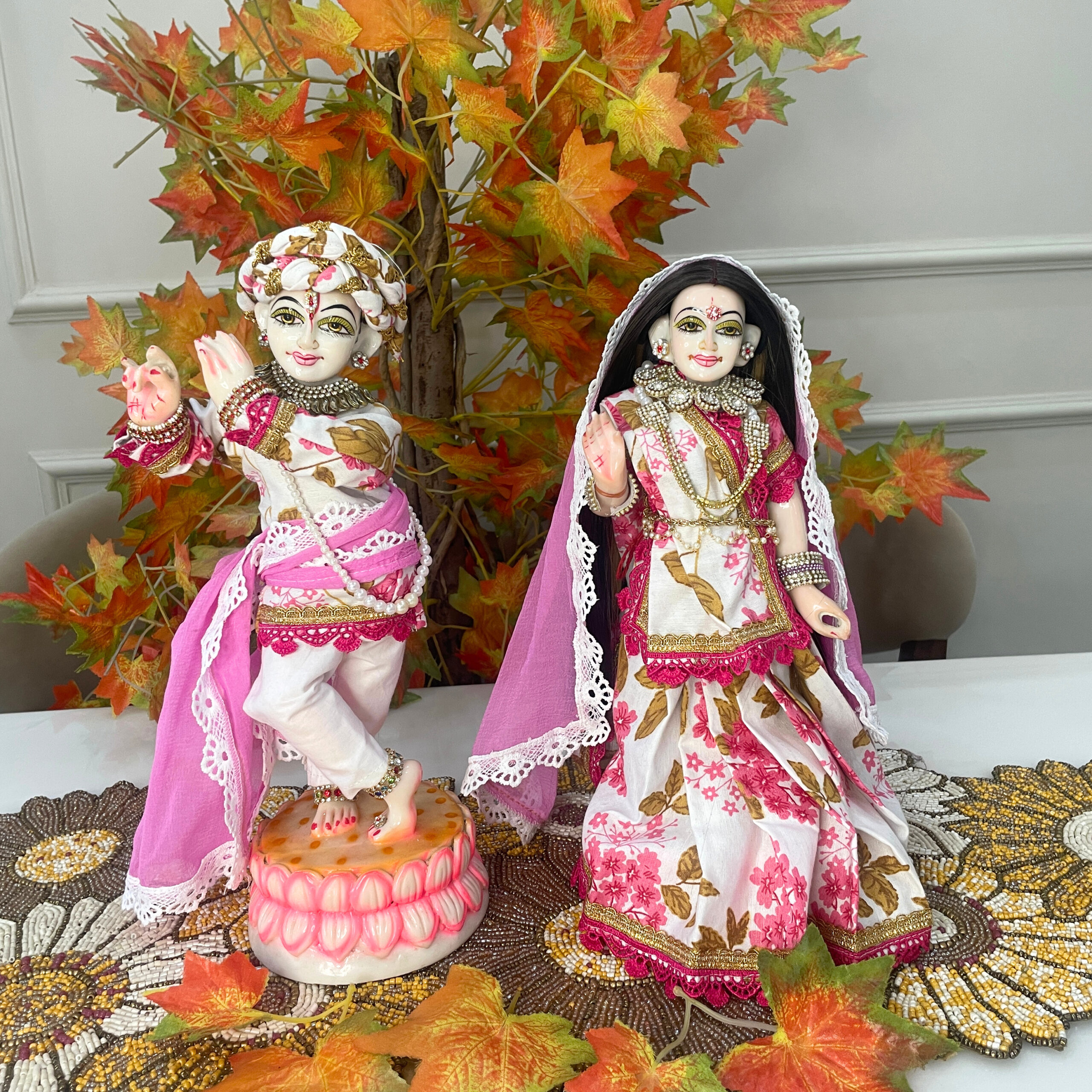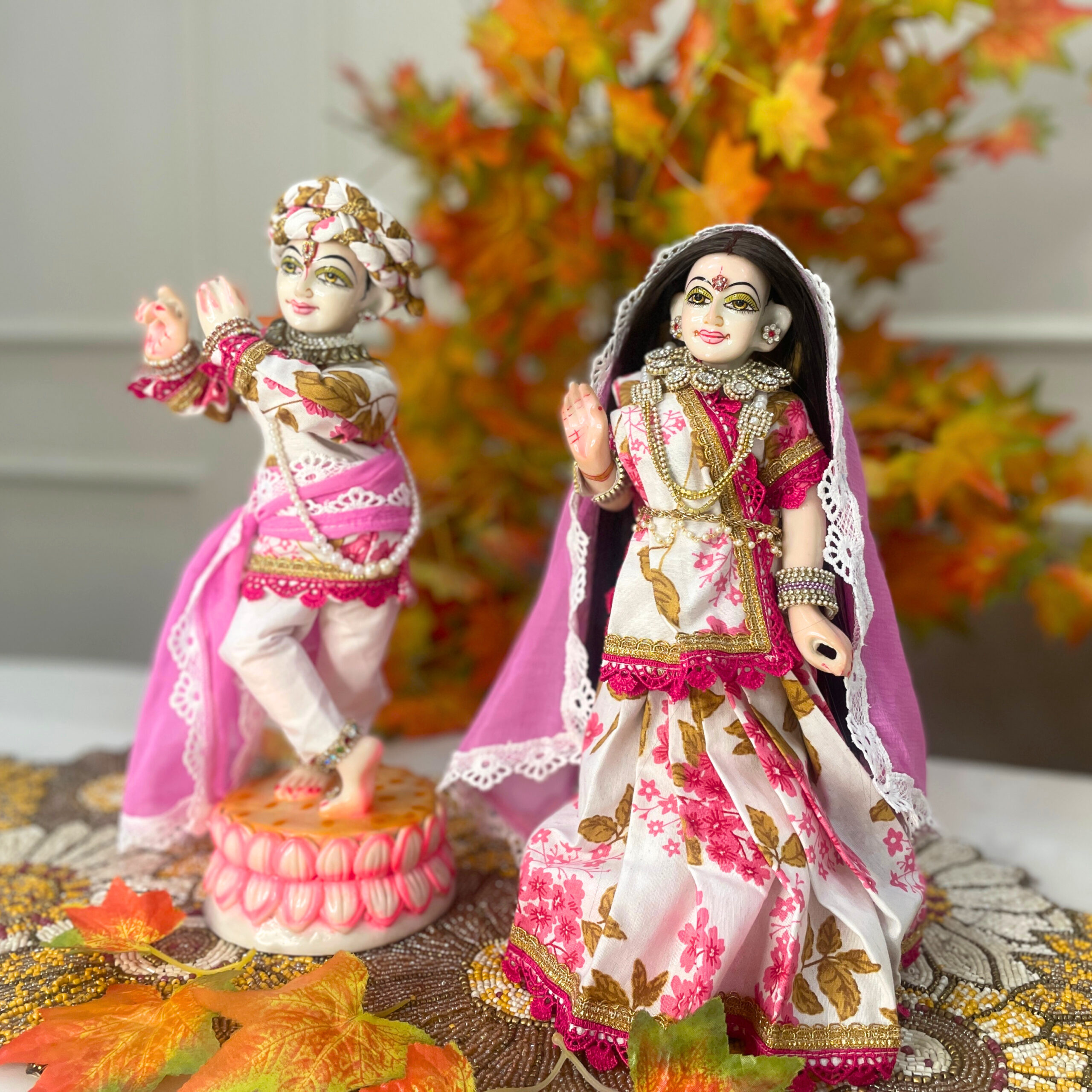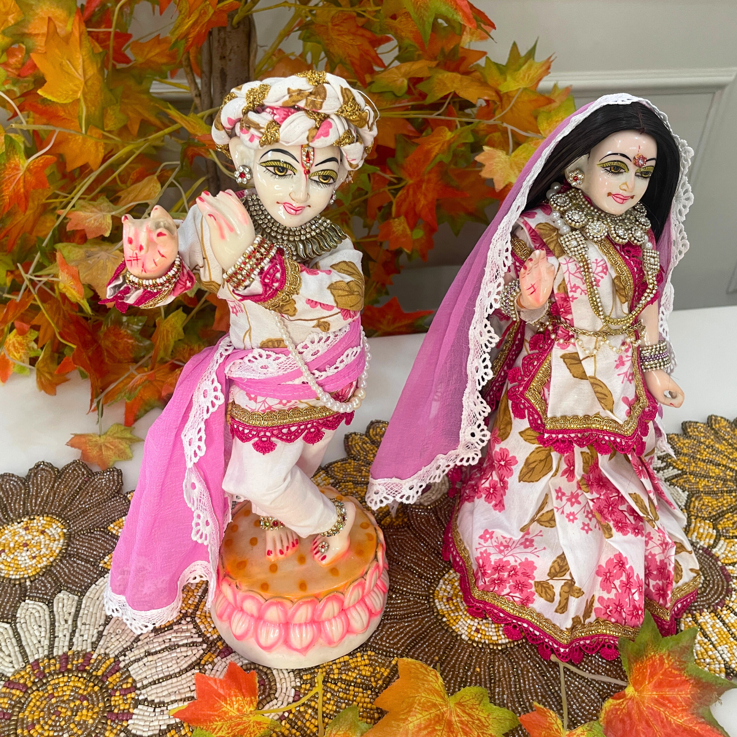 This divine Radha Krishna shringar blossoms like a garden of eternal love and devotion. The soft pink hues symbolize tenderness, compassion, and Radha Rani’s pure Love , while the floral patterns reflect the beauty of Vrindavan where every leaf and flower chants their names.