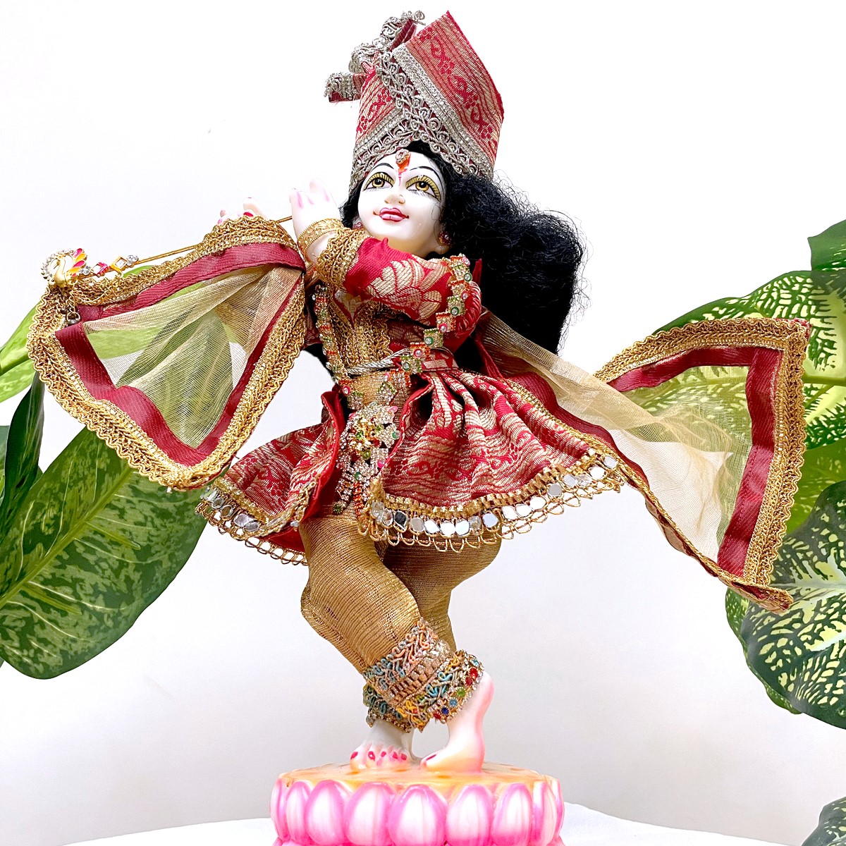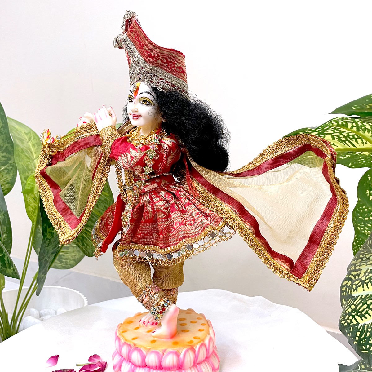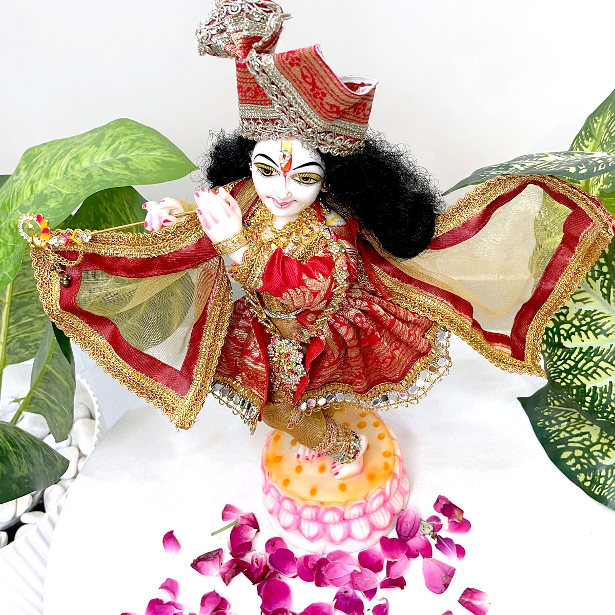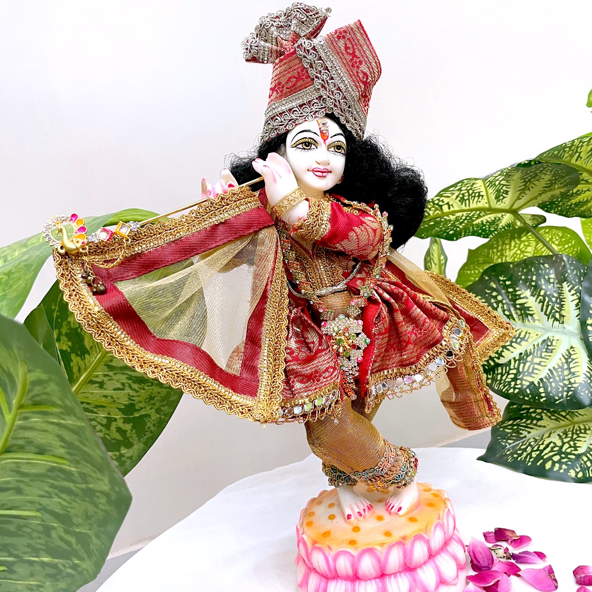 Crafted in vibrant red with golden detailing, this traditional Krishna outfit features a graceful ghagri-style kurta paired with matching pants and an elegant angvastram. Designed with fine fabric and festive accents, it adds a royal charm to idol dressing, temple rituals, and auspicious celebrations. A perfect choice to enhance the divine aura of your Krishna idol with elegance and devotion.