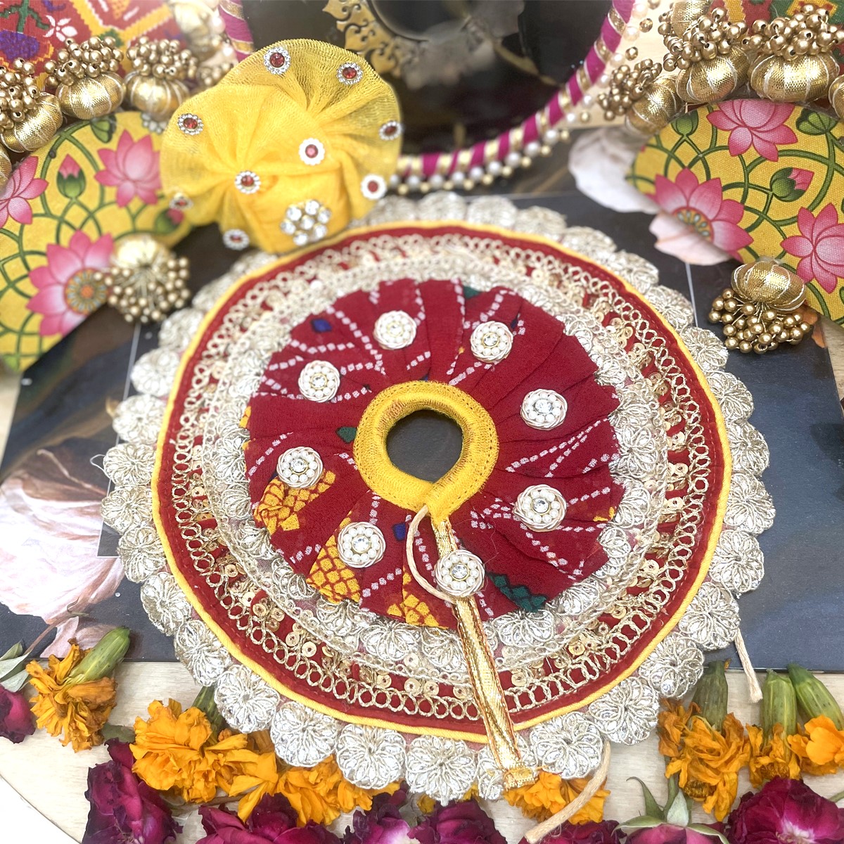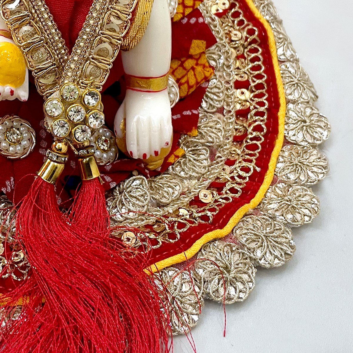 The Rajwadi Bandhej Poshak is a beautifully crafted traditional dress for Laddu Gopal, designed with classic red Bandhej (tie-dye) print and adorned with intricate golden lacework. This poshak brings a royal and festive charm to your Bal Gopal’s appearance. Made with love and devotion, this dress adds grace and vibrance to your Kanha ji’s shringar.