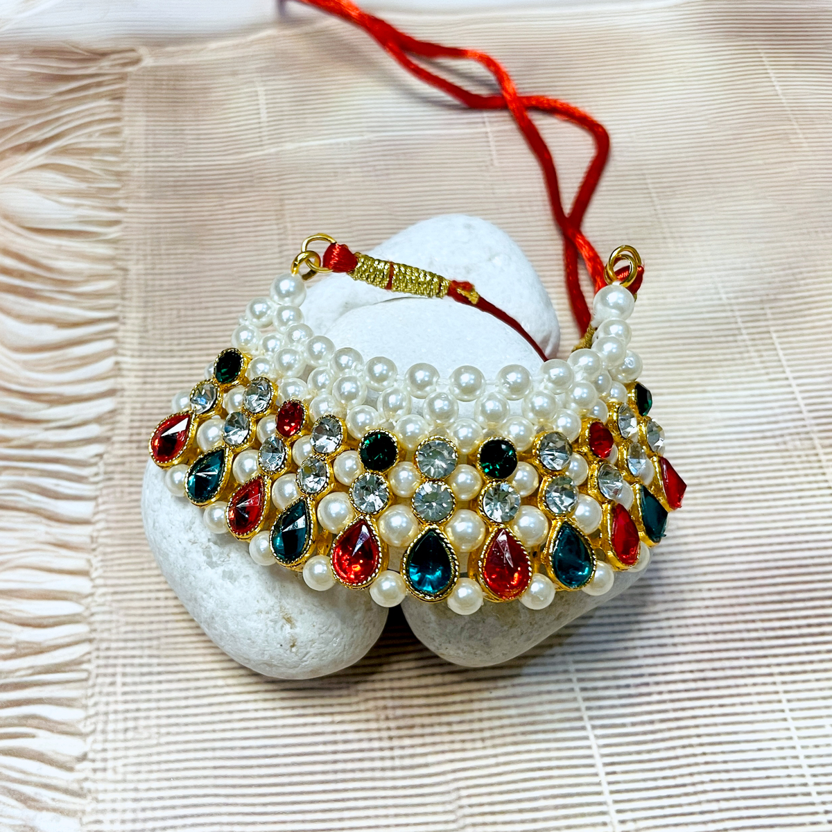 Adorn your cherished deities with our stunning ‘Rangat Choker,’ a vibrant and intricately designed necklace that radiates divine beauty. This exquisite piece features multiple strands of luminous pearls, beautifully complemented by dazzling clear, ruby-red, and emerald-green/sapphire-blue teardrop-shaped stones. Each stone is meticulously set to create a rich tapestry of color and sparkle, perfect for enhancing the divine aura of your idols during any puja or festival. Crafted with devotion and an eye for traditional grandeur, this necklace will bring an enchanting brilliance to your sacred space. Suitable for idols typically ranging from 15, 18 inches.
