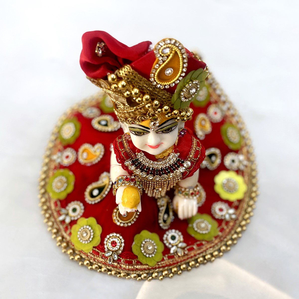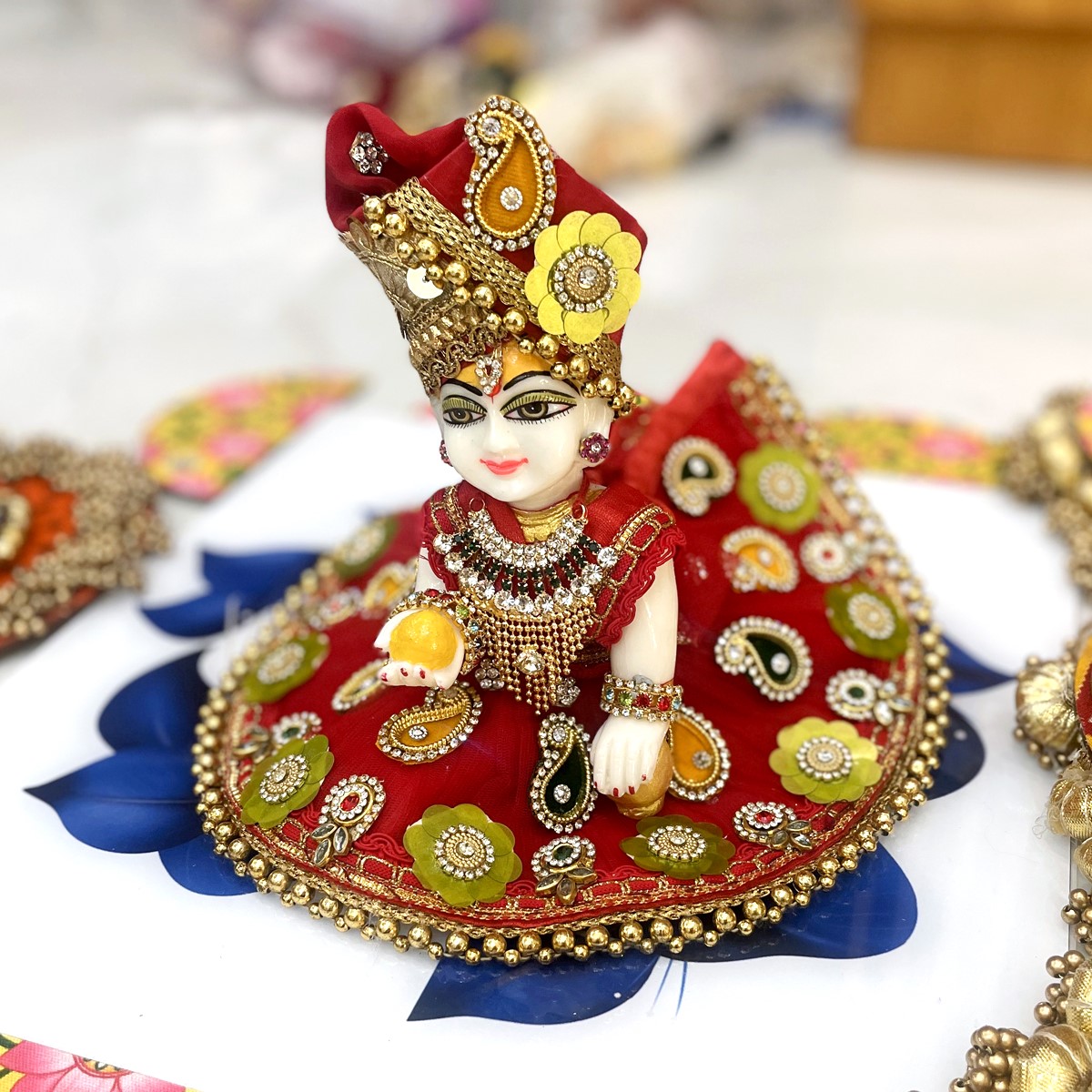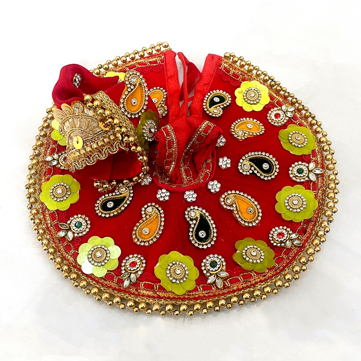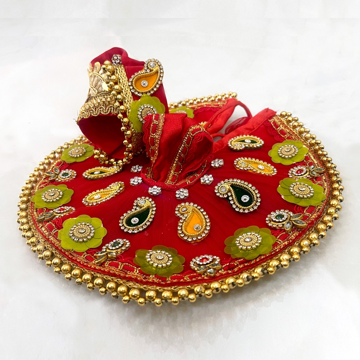 Dress up your Laddu Gopal in this beautiful Rangmay Rajposhak, a bright and festive attire made with love and tradition. The rich red fabric is decorated with colorful floral and paisley patterns in green and yellow, giving it a joyful and royal look. The intricate stonework and golden borders add a sparkling charm that makes your Bal Gopal shine with grace.