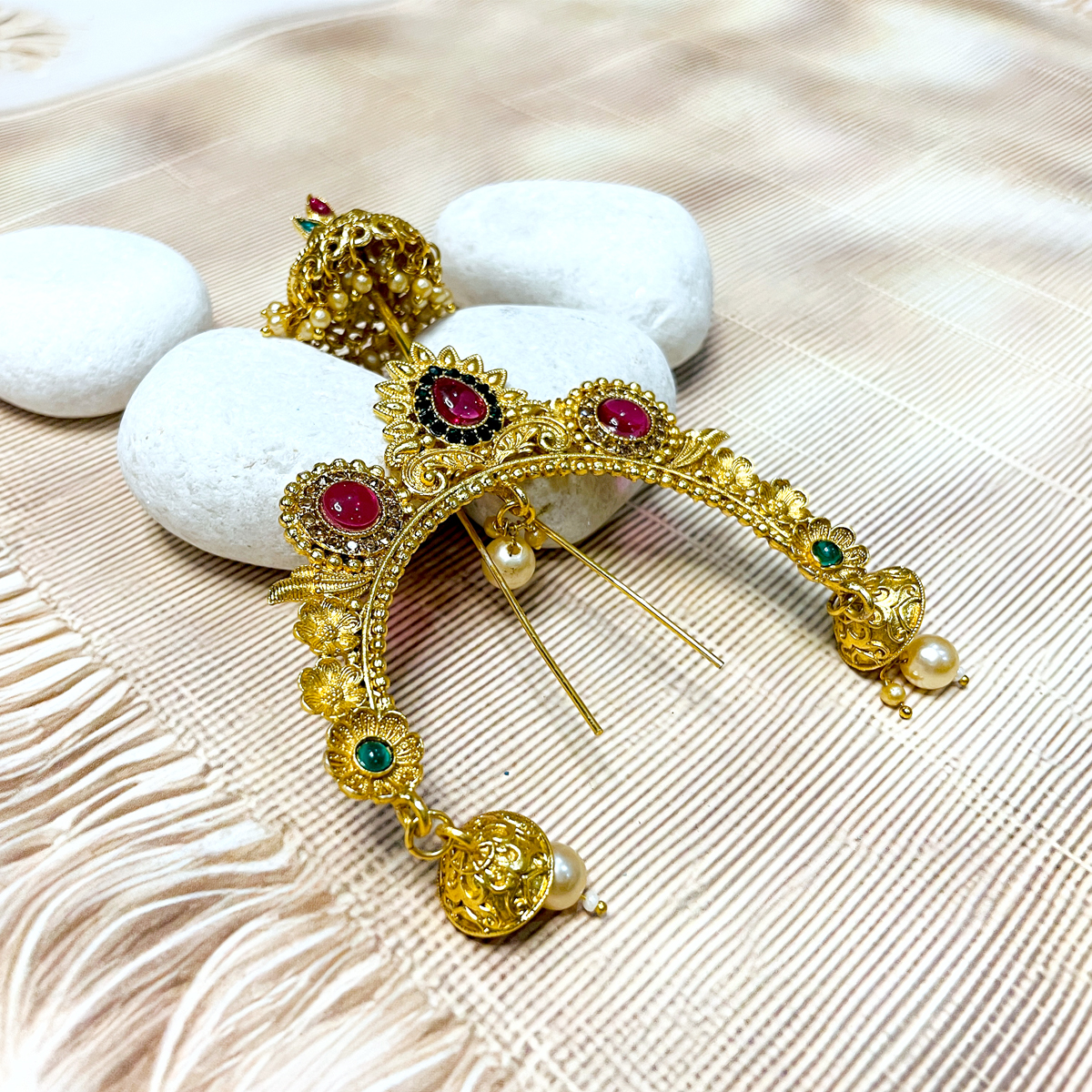 Adorn your beloved Radha Rani with the regal splendor of our ‘Rani Mukut Chandrika,’ a meticulously crafted head ornament designed to enhance her divine grace. This exquisite piece features intricate golden filigree work, reminiscent of ancient temple artistry, beautifully embellished with vibrant ruby-red and emerald-green stones. Delicate pearl drops and charming ‘Jhumka’ accents complete its majestic design, perfectly befitting the queen of Vrindavan. This Chandrika is ideal for bringing an aura of royal elegance and spiritual charm to your sacred space. Suitable for Radha Rani idols typically ranging from 15 to 18 inches.