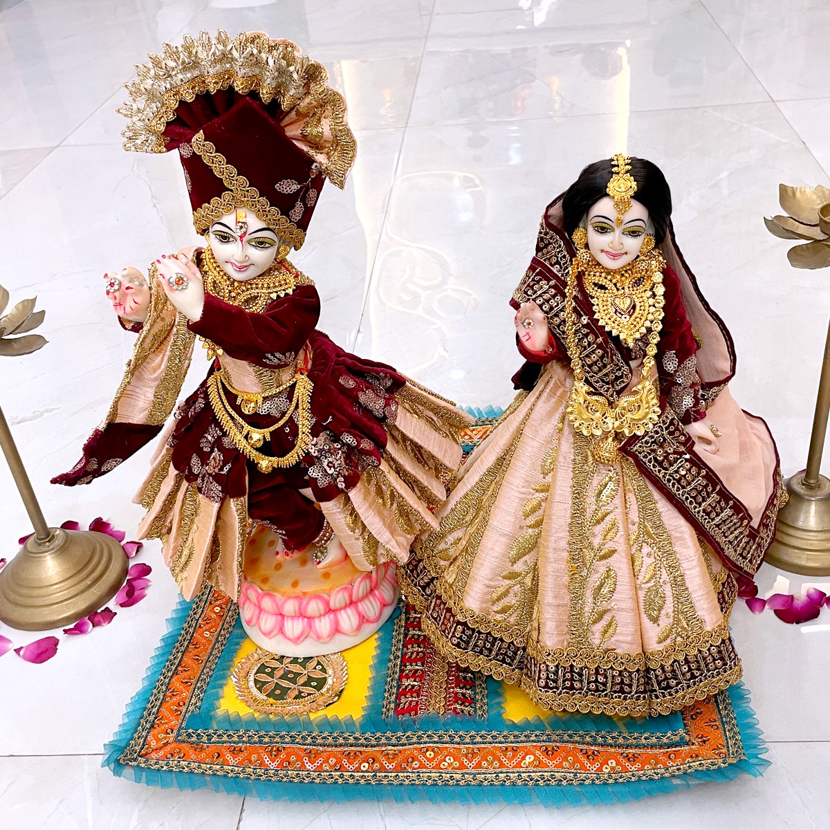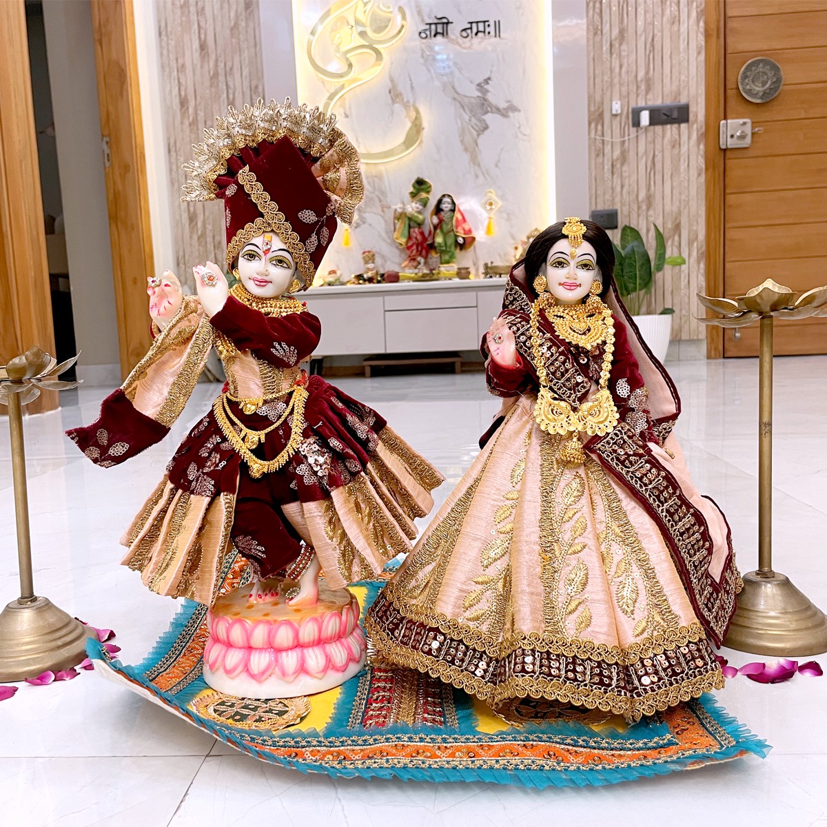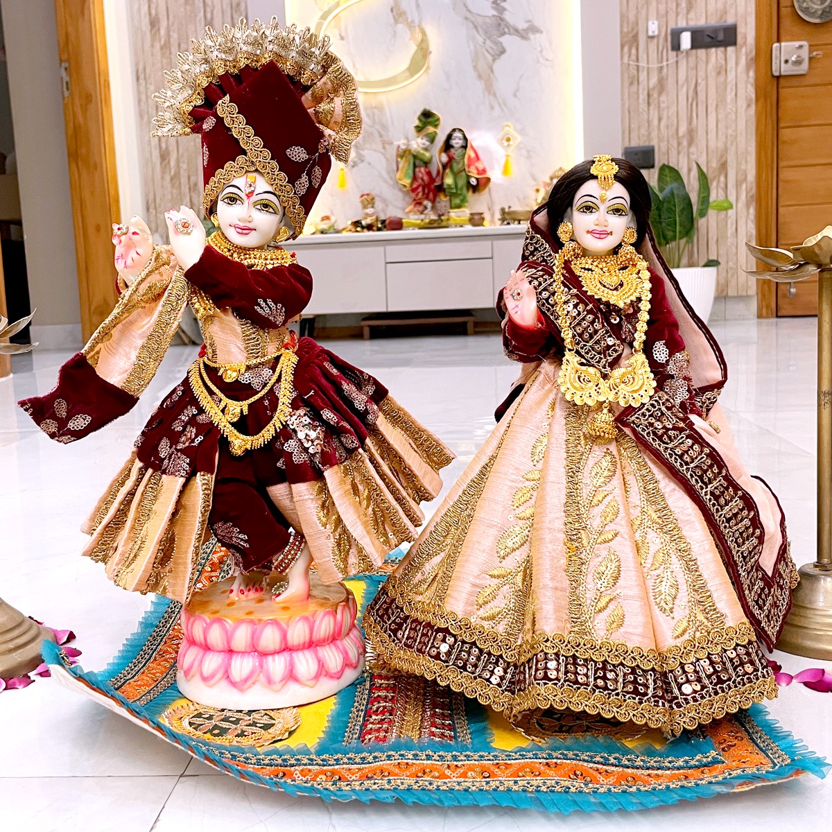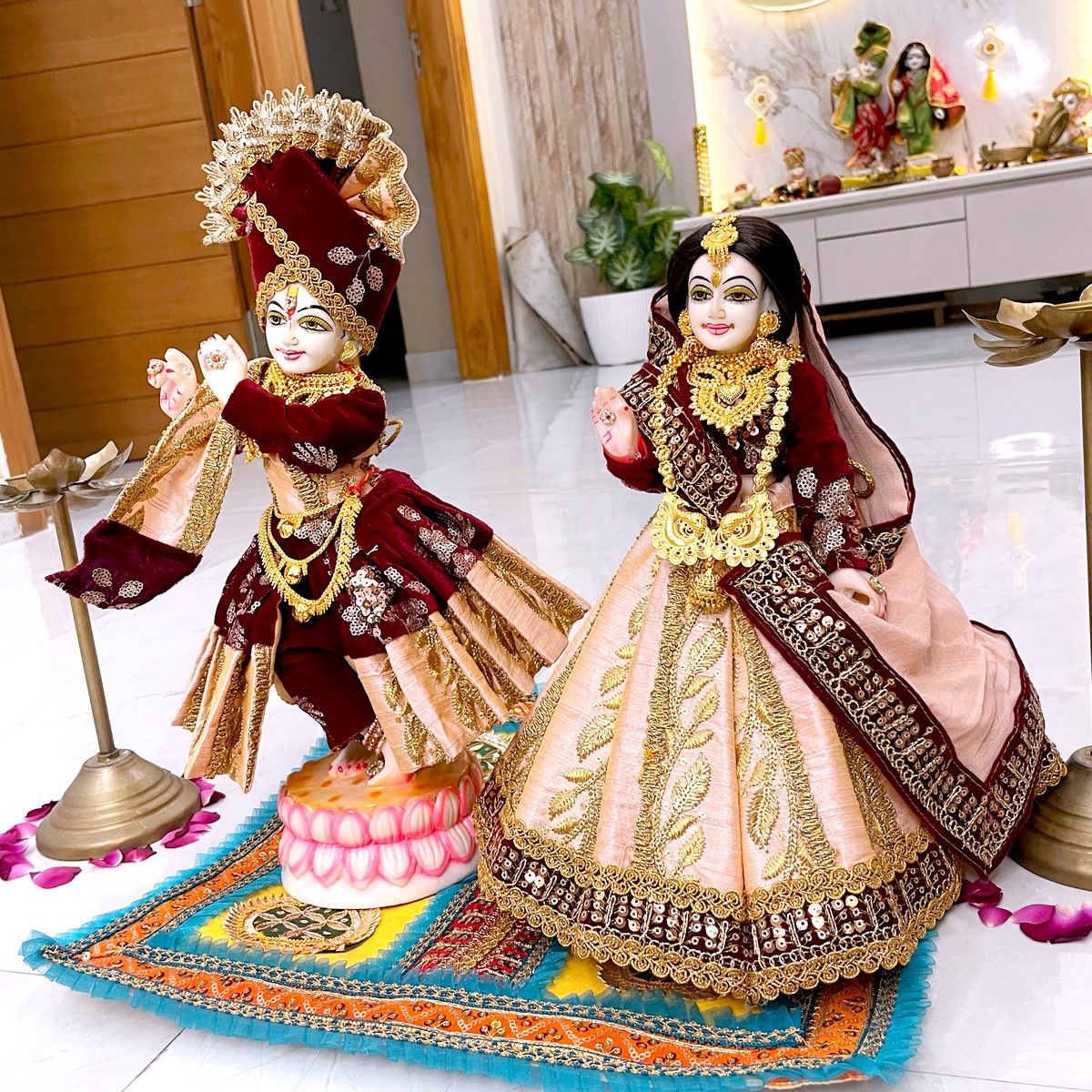 This beautiful winter poshak is crafted in rich velvet fabric, designed in soothing peach and maroon shades. Radha Ji’s outfit features a graceful lehenga with full-sleeve blouse and soft dupatta, while Krishna Ji’s attire includes a matching kurta, pant, and angvastram. The set reflects the charm of Vrindavan’s divine love and festive elegance, perfect for adorning your idols during special occasions.