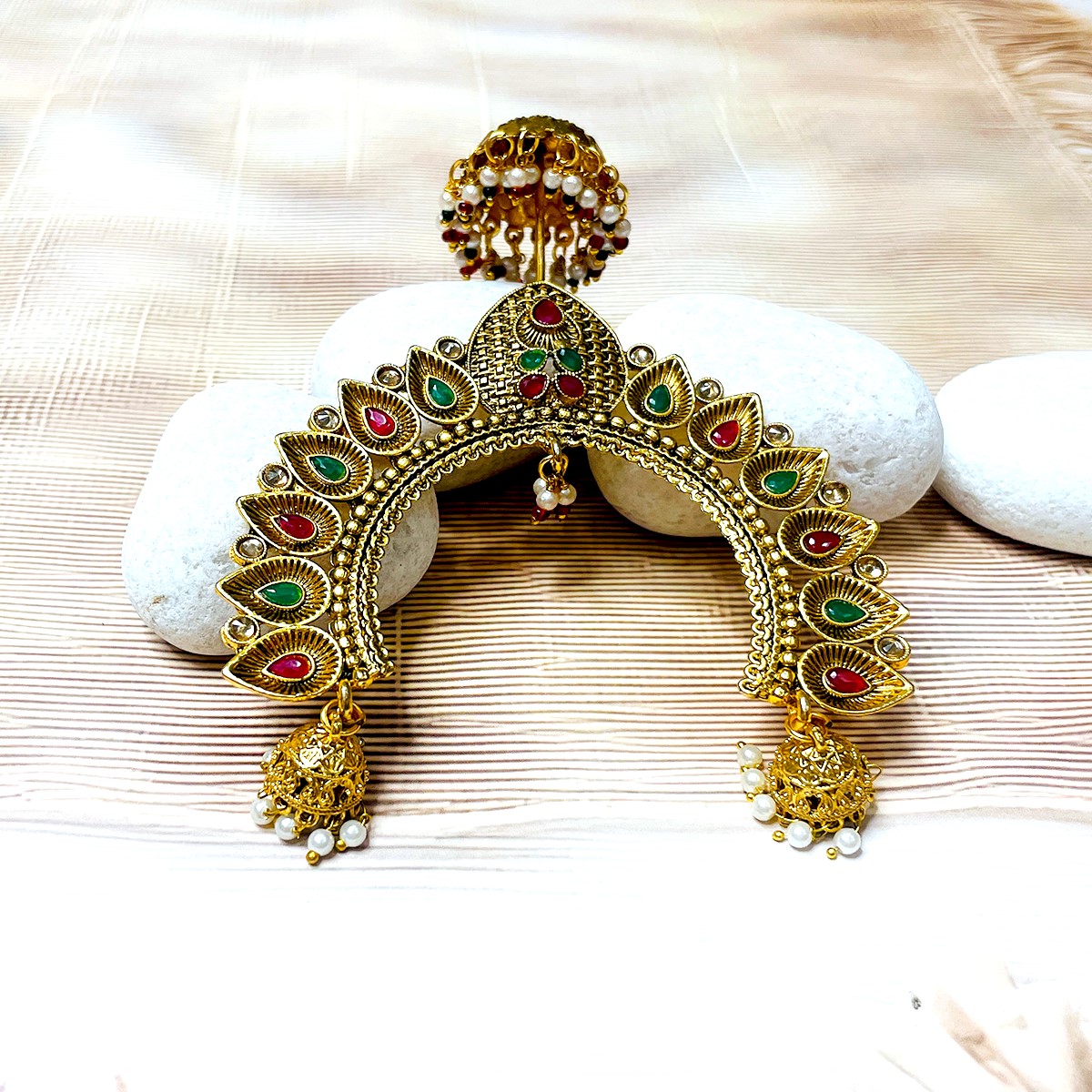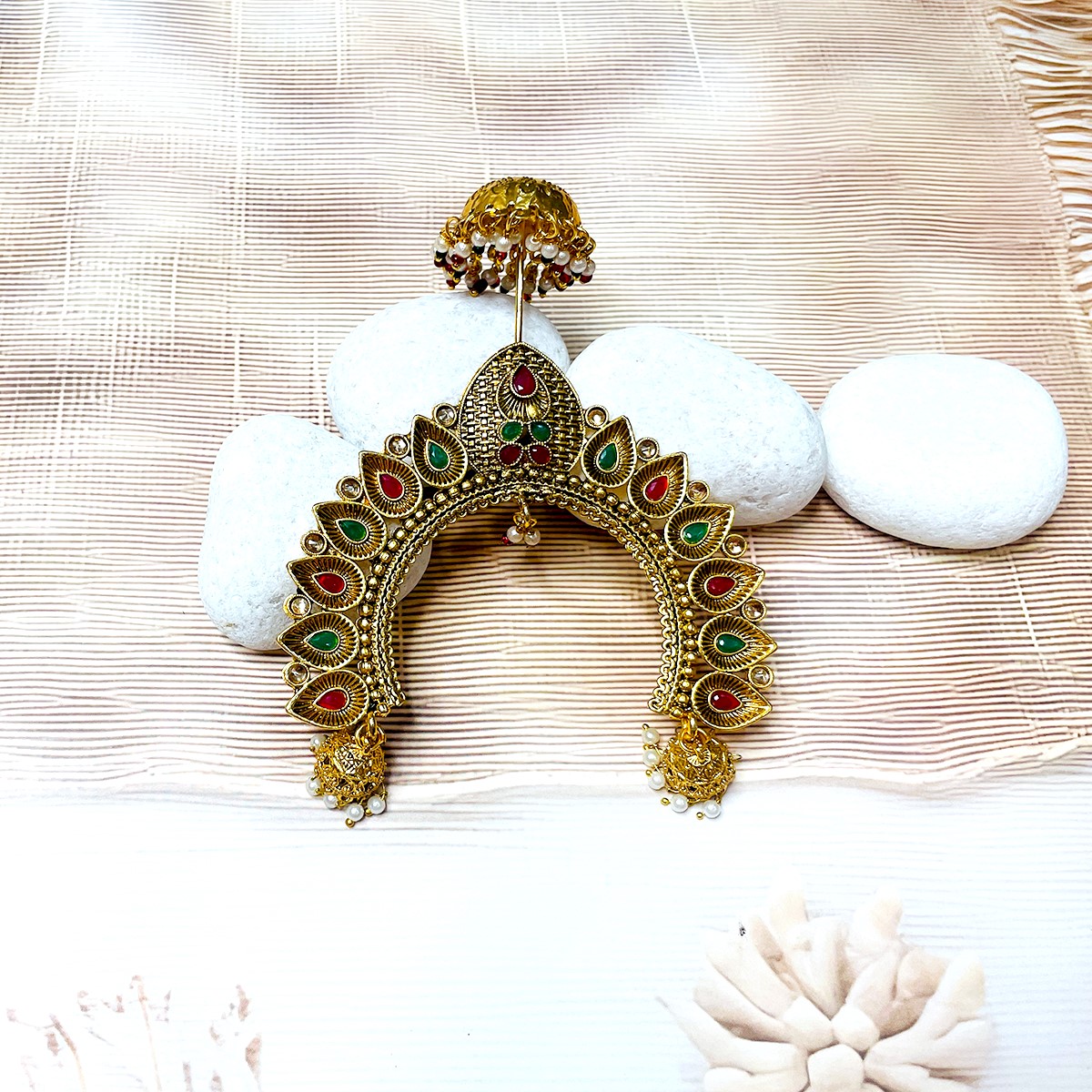 This elegant chandrika is crafted in a radiant golden finish, highlighted with red and green gem-like detailing that adds a touch of divine charm. Its traditional arch-shaped design beautifully frames the idol’s head, while the delicate hanging pearls enhance its grace. Perfect for temple rituals and festive adornments, it symbolizes auspiciousness and devotion, making your deity’s presence even more resplendent.