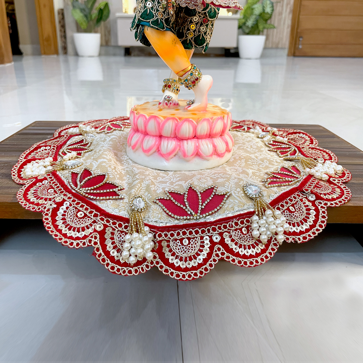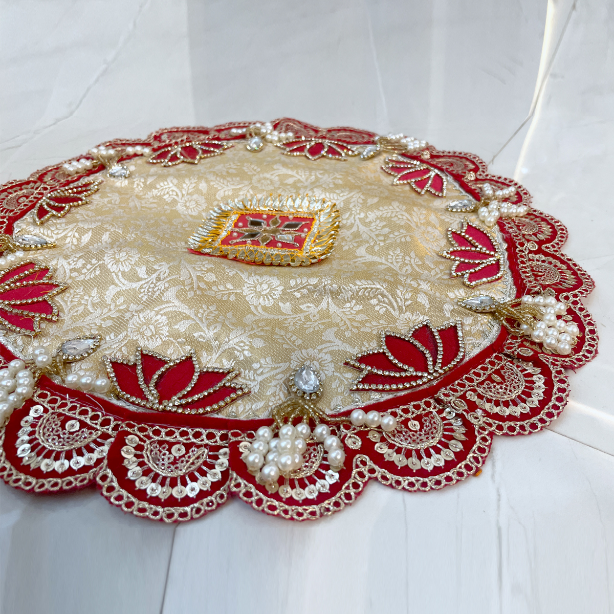 Add a royal touch to your pooja space with this Designer Aasan crafted with red lotus motifs and kundan centerpiece. Durable, soft texture suitable for all deity sizes and ideal for singhasan, thal, and pooja arrangements.