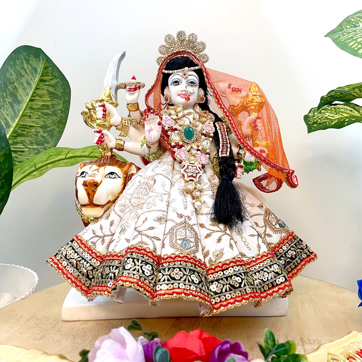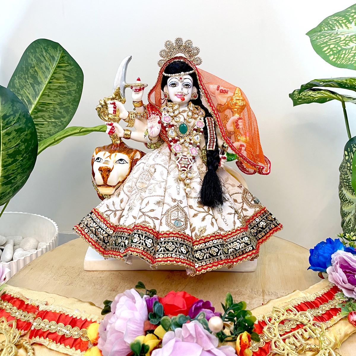 This beautiful dress set comes with a white color lehanga and blouse, matched with a bright red net dupatta. The fine embroidery and rich border work give it a traditional and graceful look. Specially made for Mata Rani idols, this poshak brings out her divine shakti and is ideal for pooja, festivals, and daily darshan.