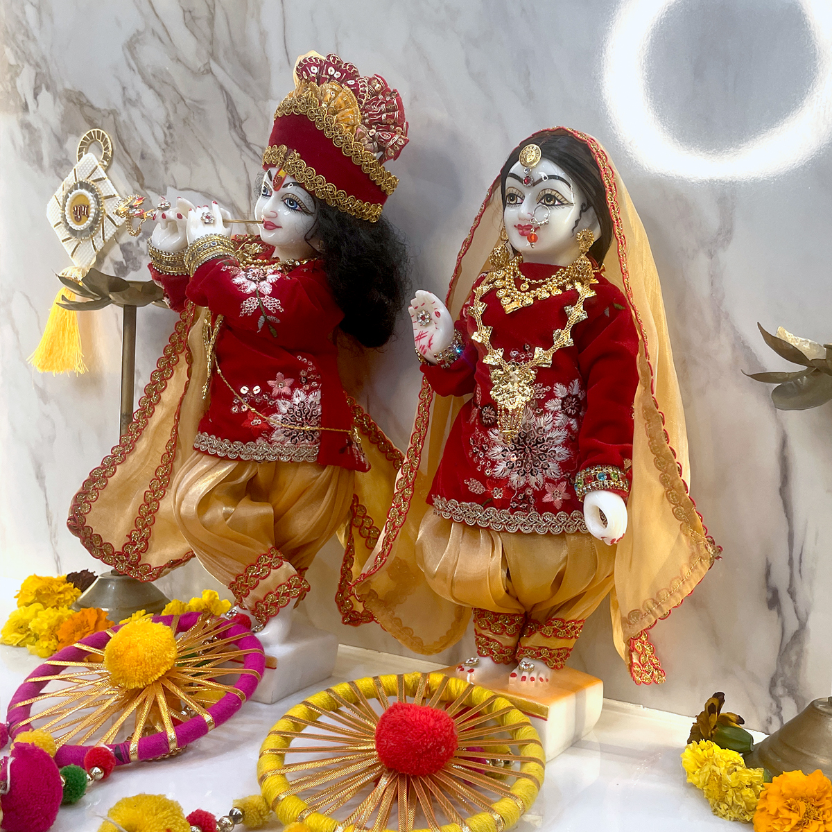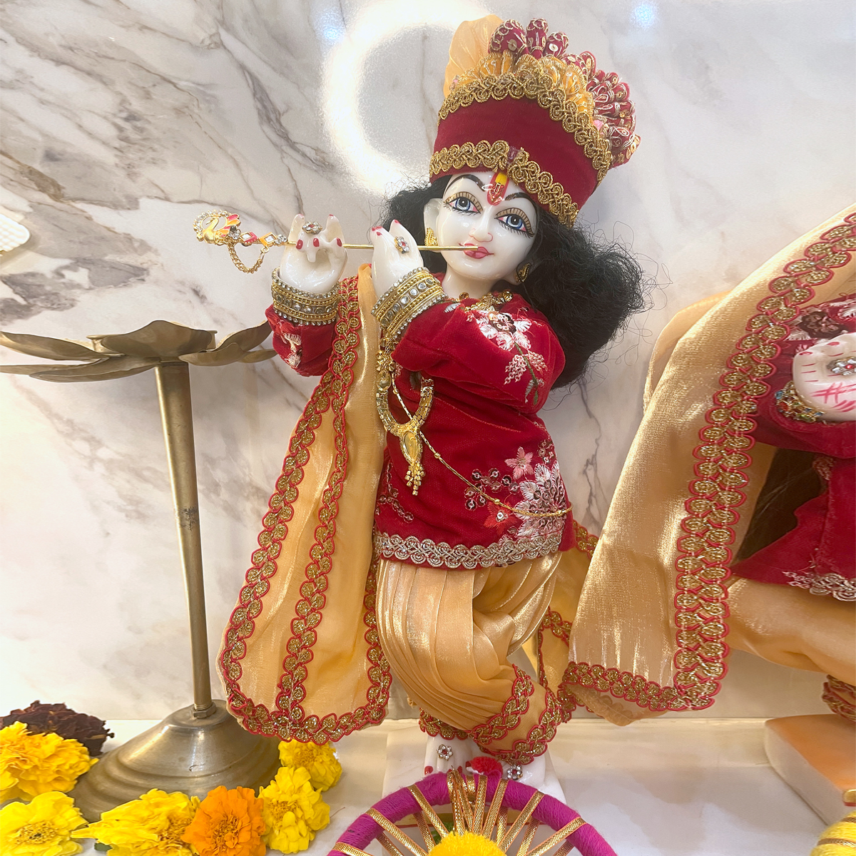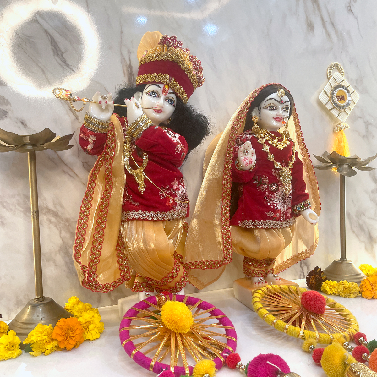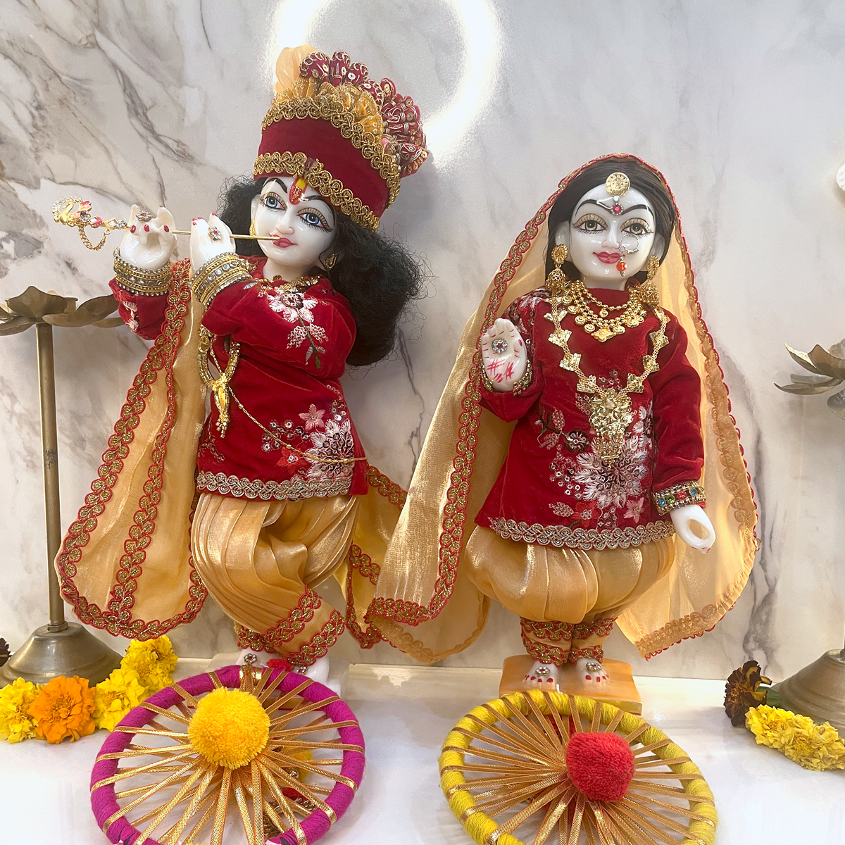Draped in auspicious red and glowing gold, this poshak reflects premanand—the blissful love of Radha Krishna. Every stitch radiates bhakti, making it ideal for pooja, utsav, and special darshan.