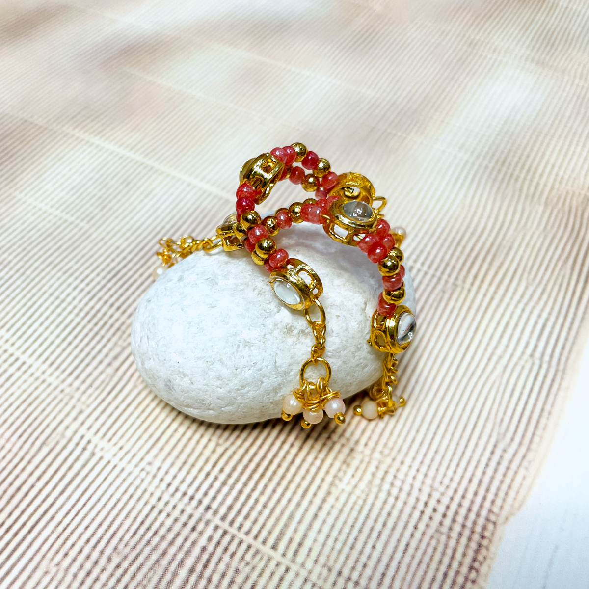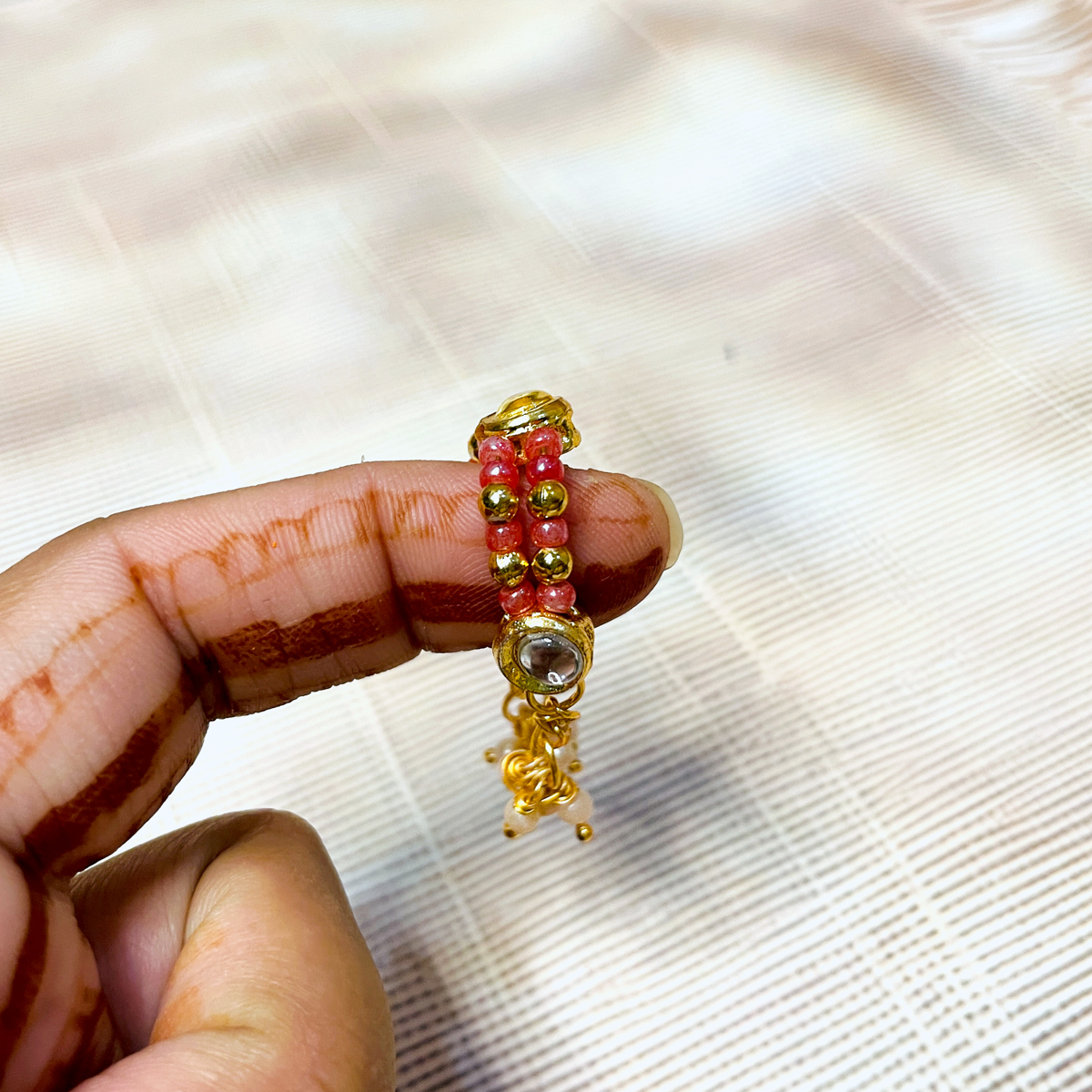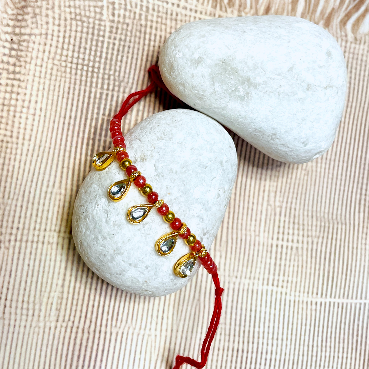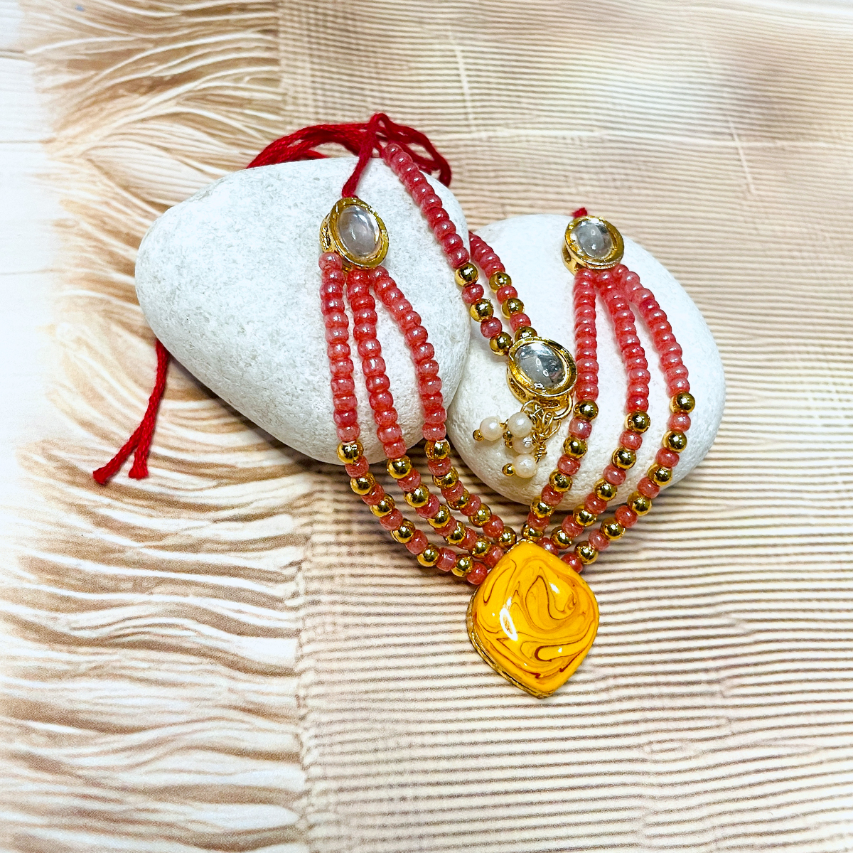 This beautiful devotional jewellery set is crafted with red pearl beads, golden detailing and sparkling kundan stones, offering a graceful and traditional look to your deity. Each piece is made with love to enhance the divine charm and elegance of your Radha-Krishna or Laddu Gopal ji.