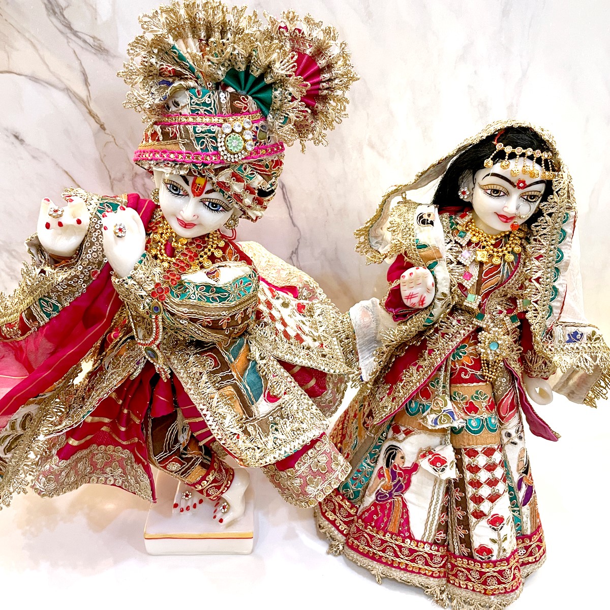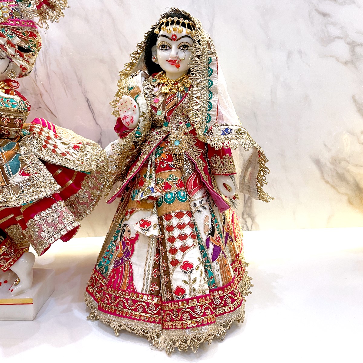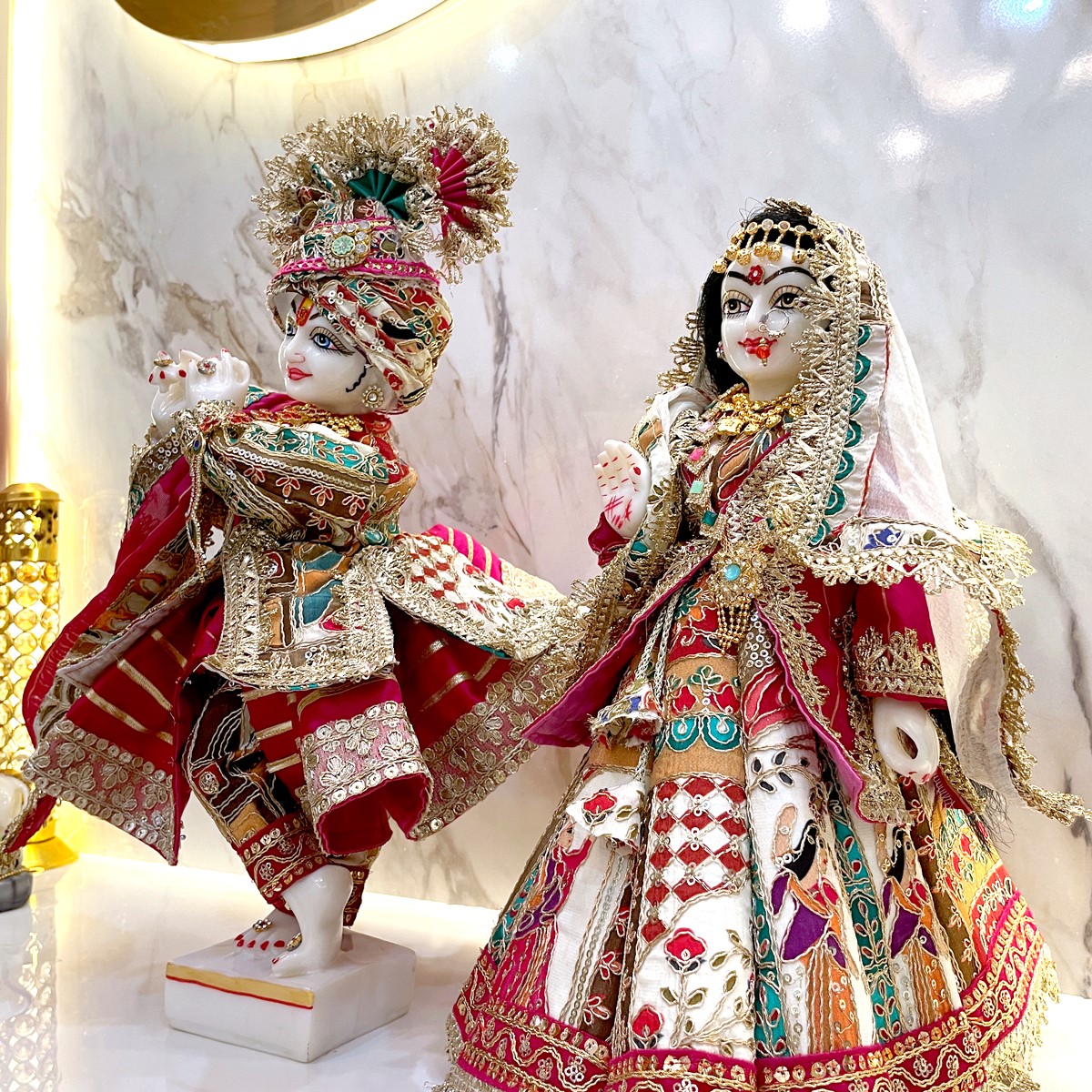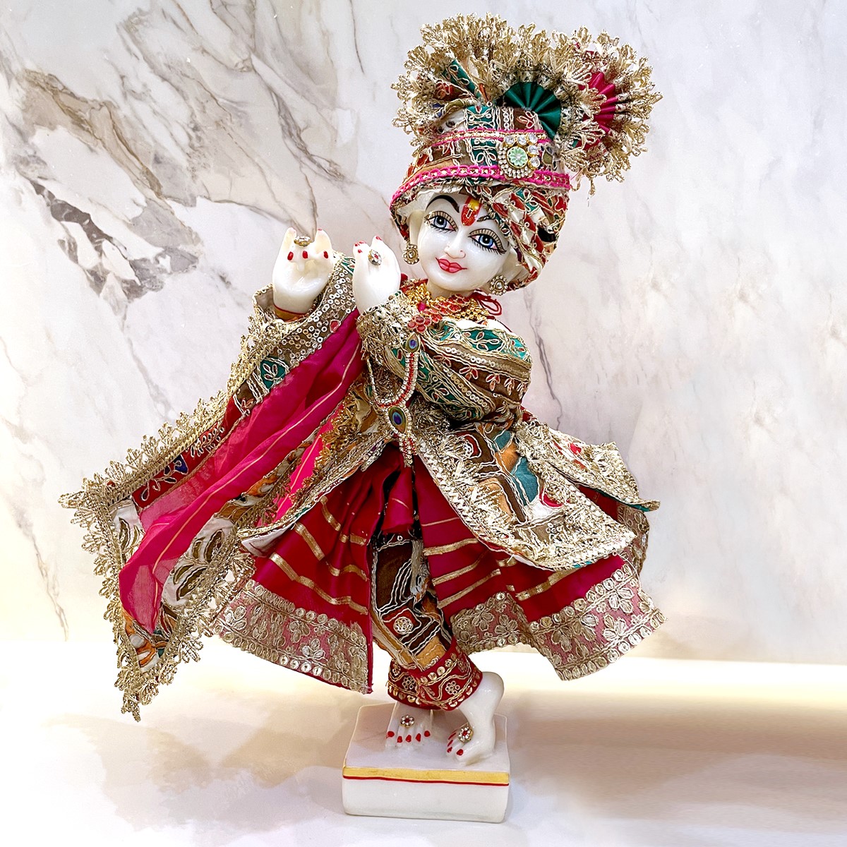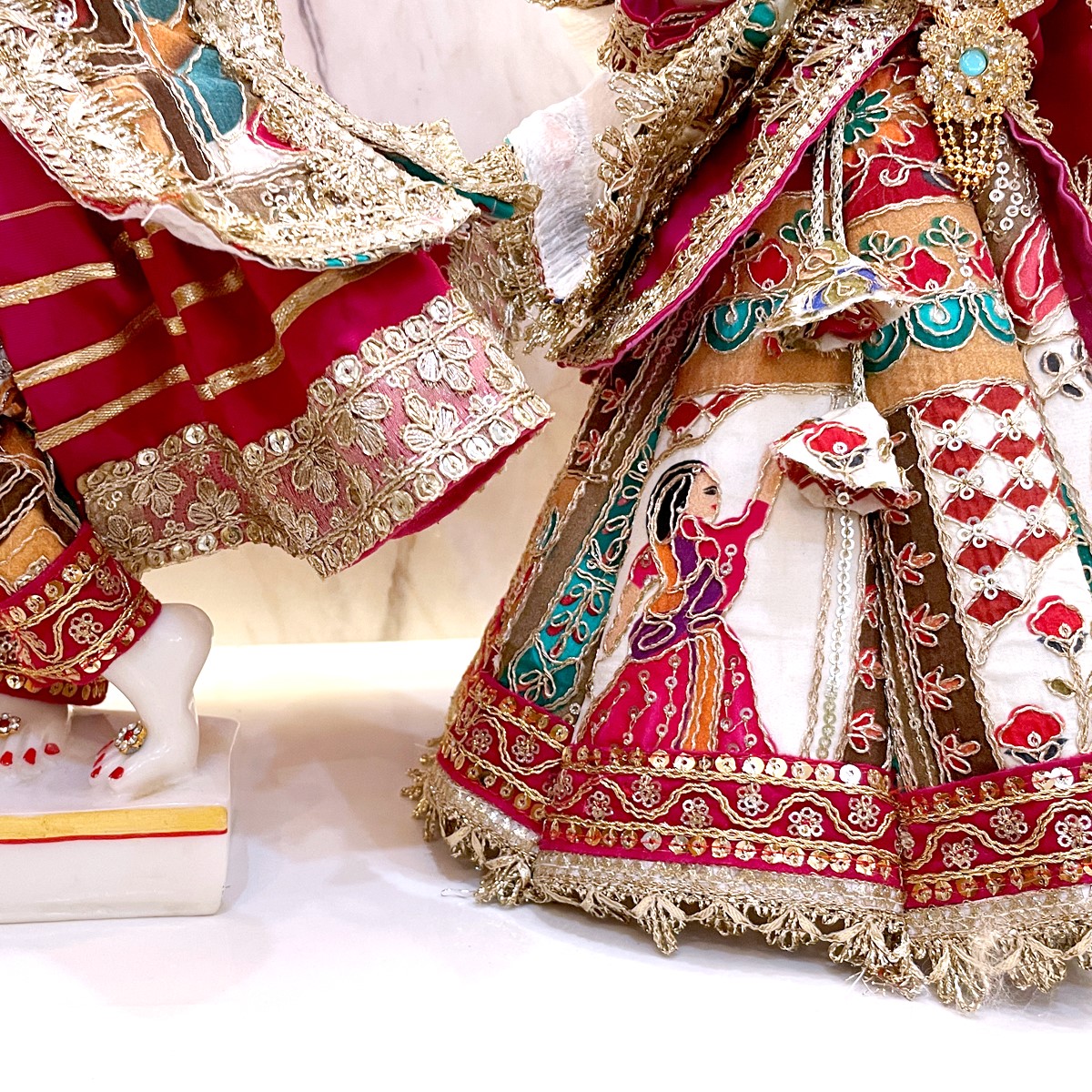 This traditional dress set comes in a white and pink color tranditional design, crafted with devotion and elegance. The lehenga in soft white and pink is paired with a pink kurti and lace-trimmed white dupatta, while the matching attire includes kurti, pajama, short pink ghagri, and agnvastram. Perfect for idol dressing, festive rituals, mandir decoration, and daily worship, this outfit brings a graceful and divine charm to Radha Krishna celebrations.