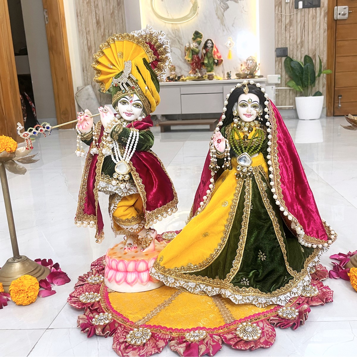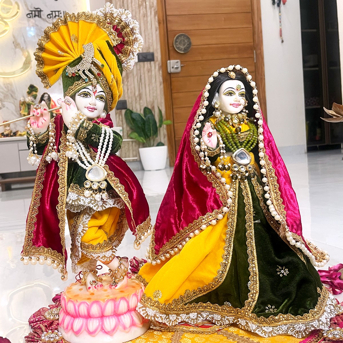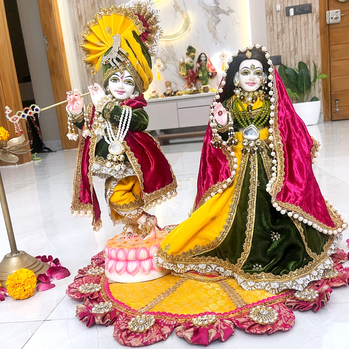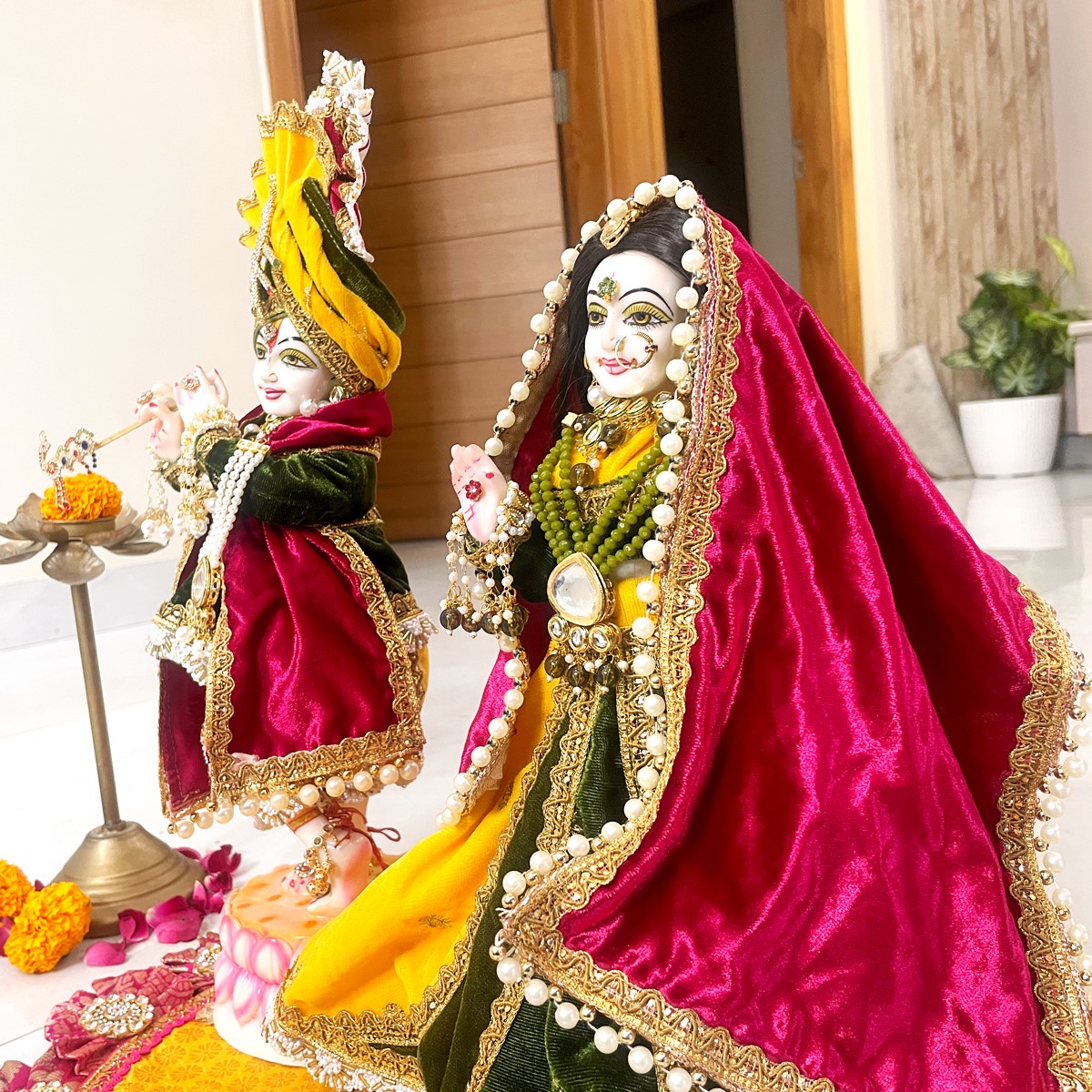 This elegant winter poshak is crafted to keep your divine idols warm and adorned. Made with soft fabric, it blends devotion and comfort beautifully. Radha ji’s attire features mehndi green and yellow tones with a bright magenta dupatta, while Krishna ji’s set includes a yellow dhoti, mehndi green kurta, and magenta angvastram. Perfect for winter shringar, adding a cozy and graceful charm to your mandir.