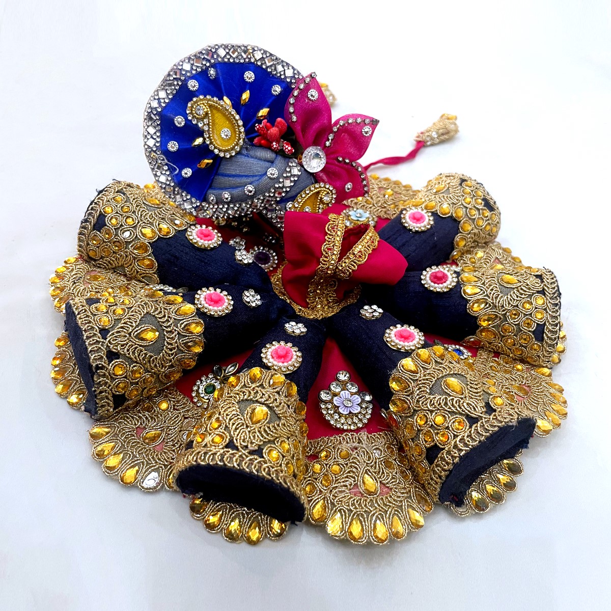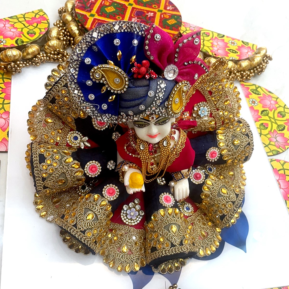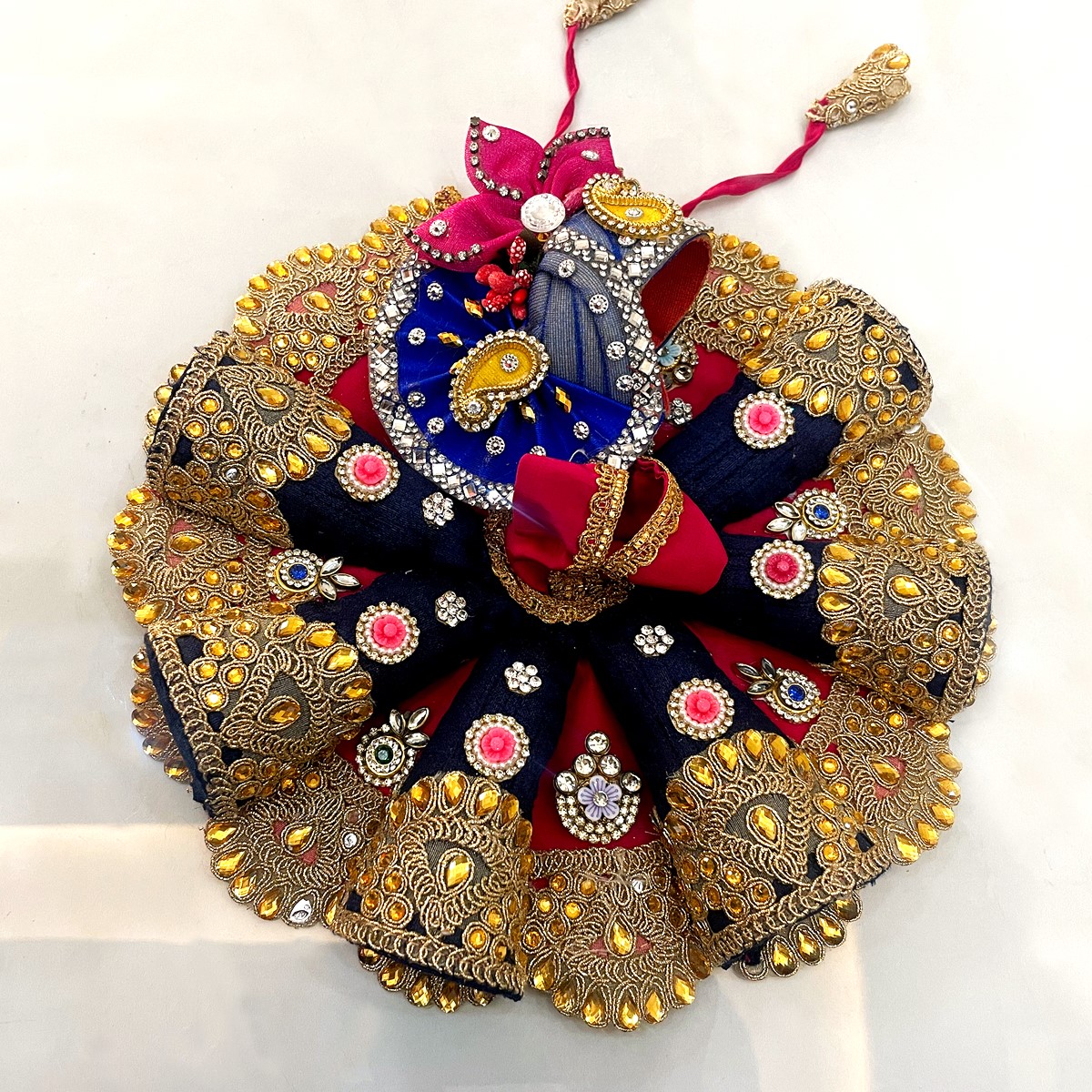 Dress up your Laddu Gopal in divine elegance. Inspired by the deep colors of the night and the powerful aura of Shyama Kali, this dress features a rich blue base beautifully decorated with golden embroidery, shiny stones, and delicate floral accents in pink. The look is royal yet devotional. Let your Bal Gopal shine like a gem under the night sky in this graceful shringar vastra.